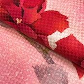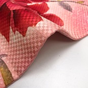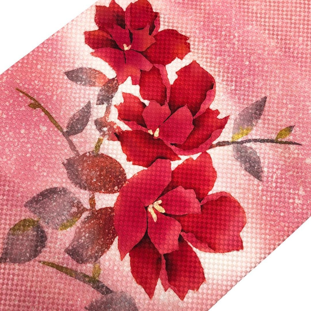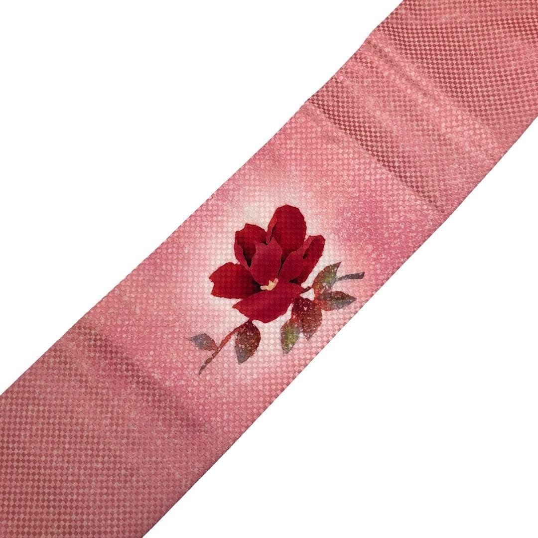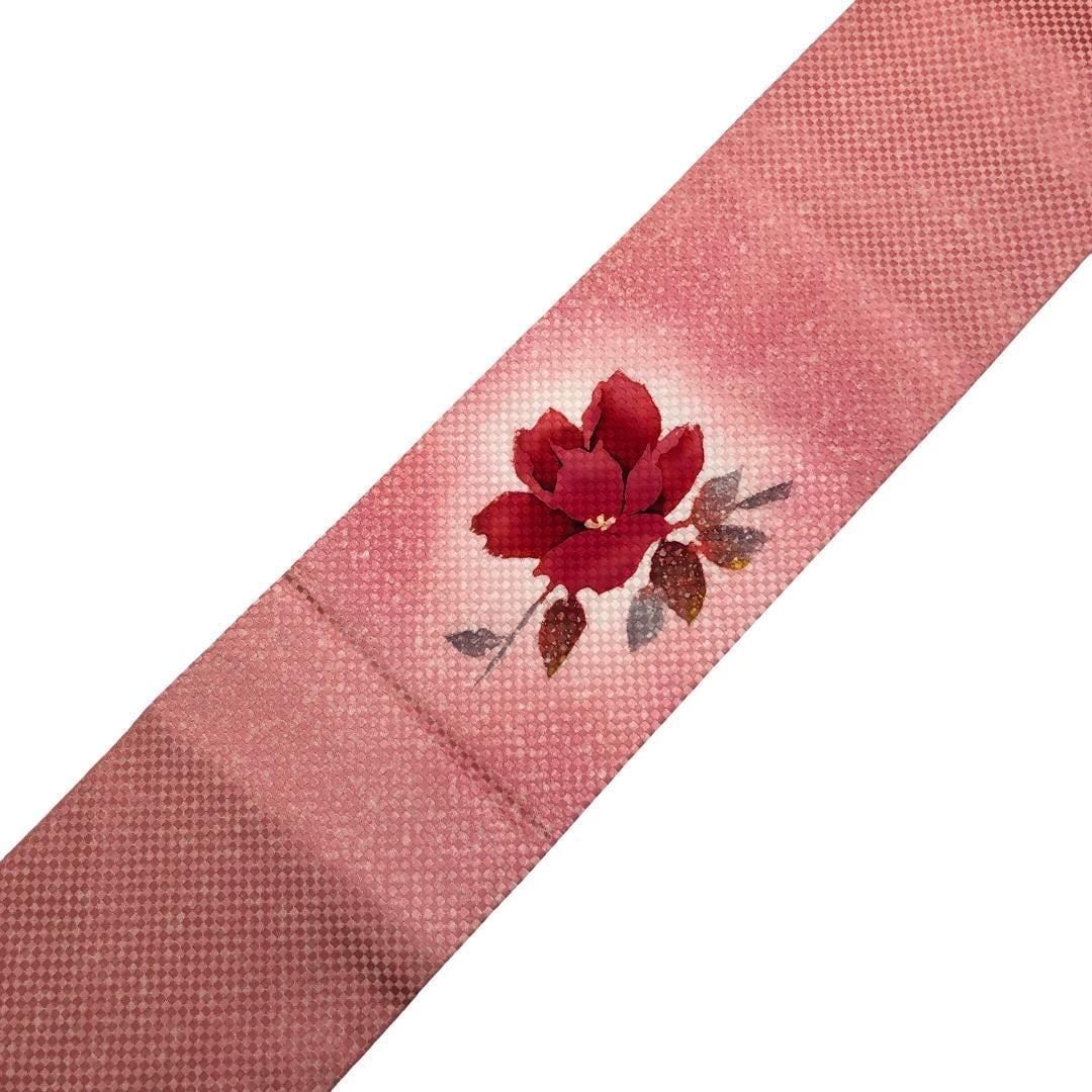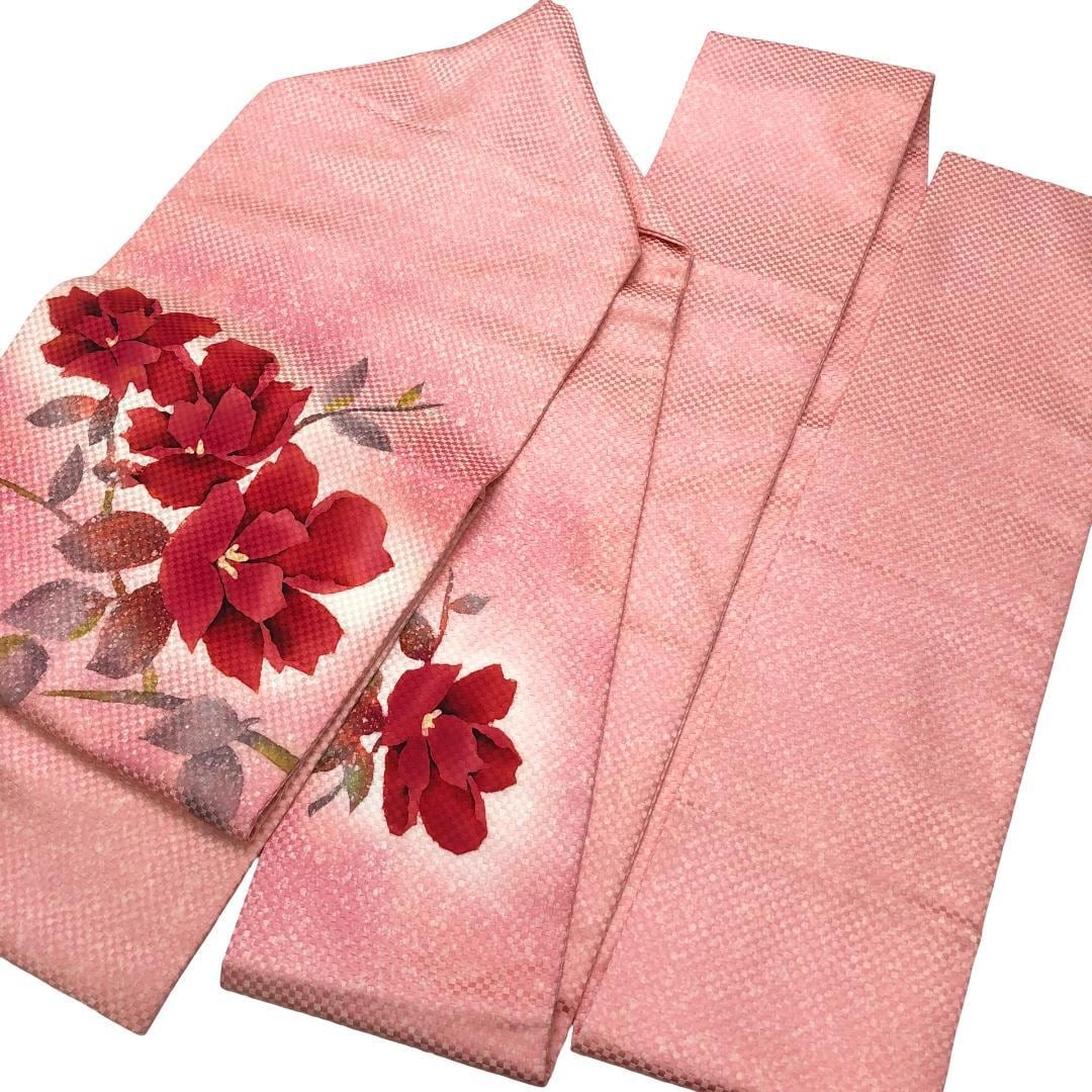 薄紅梅色ベースのお色味に赤く鮮やかな花模様の柄裄がデザインされた素敵なお品でございます。