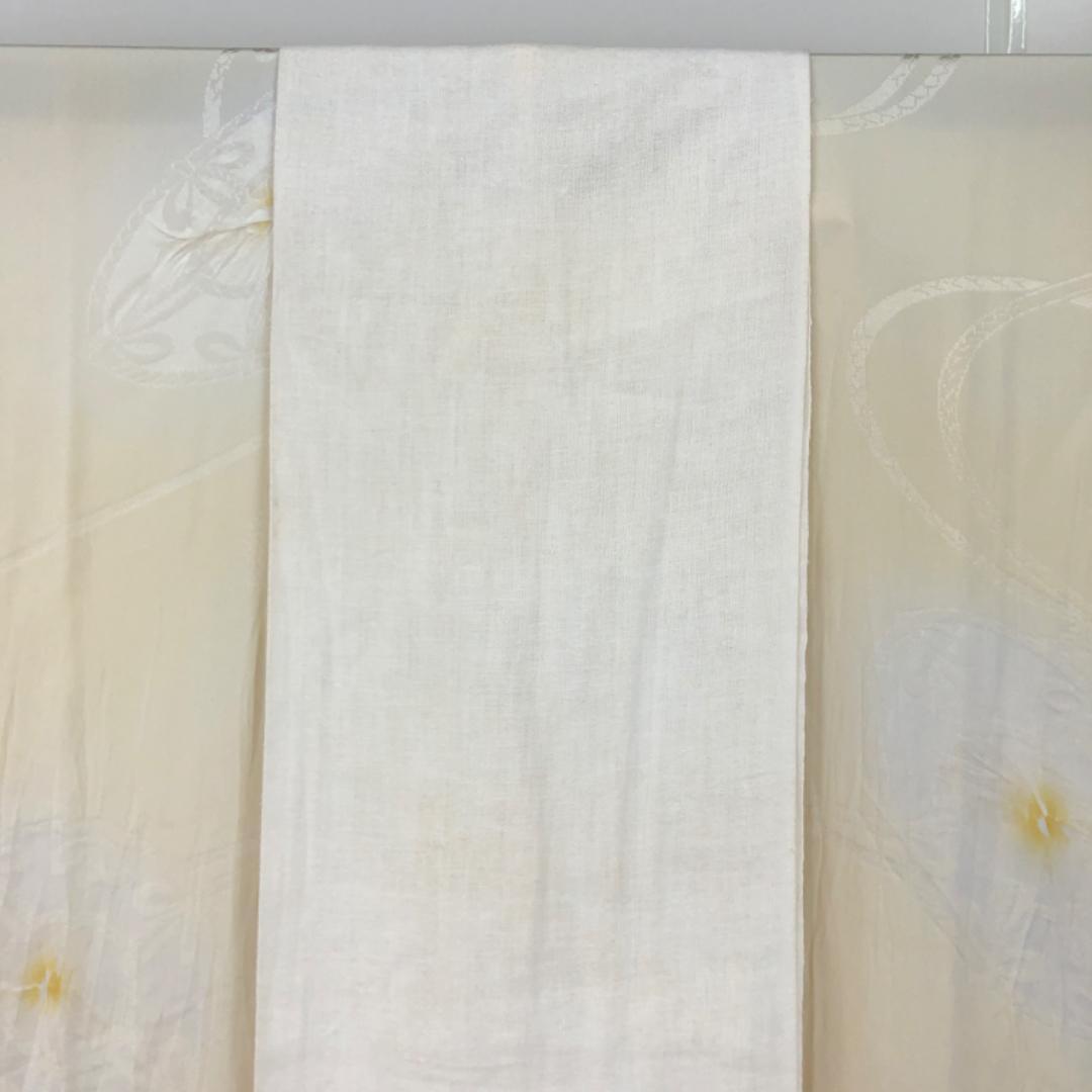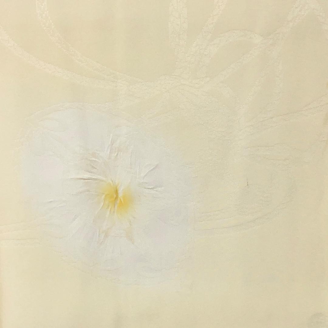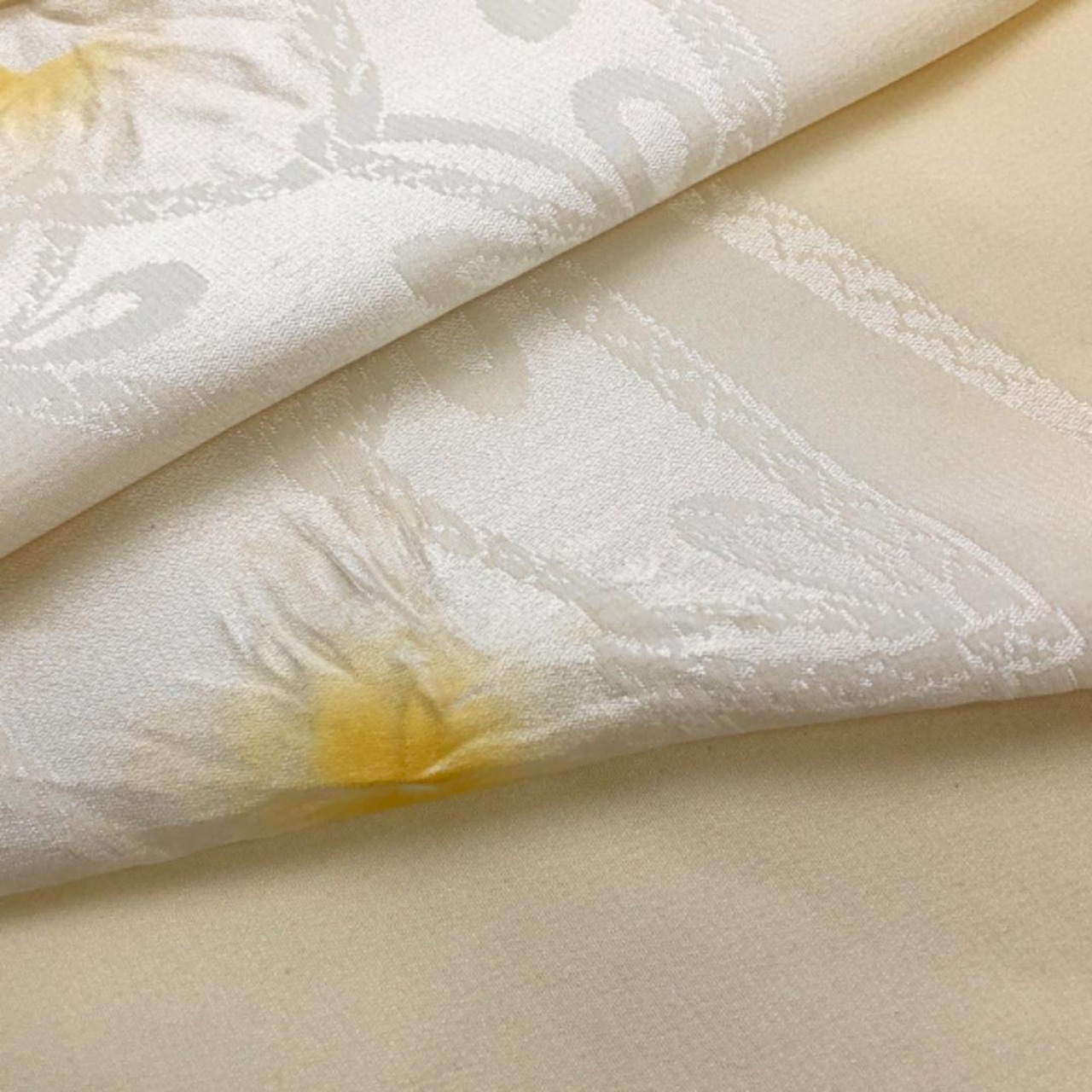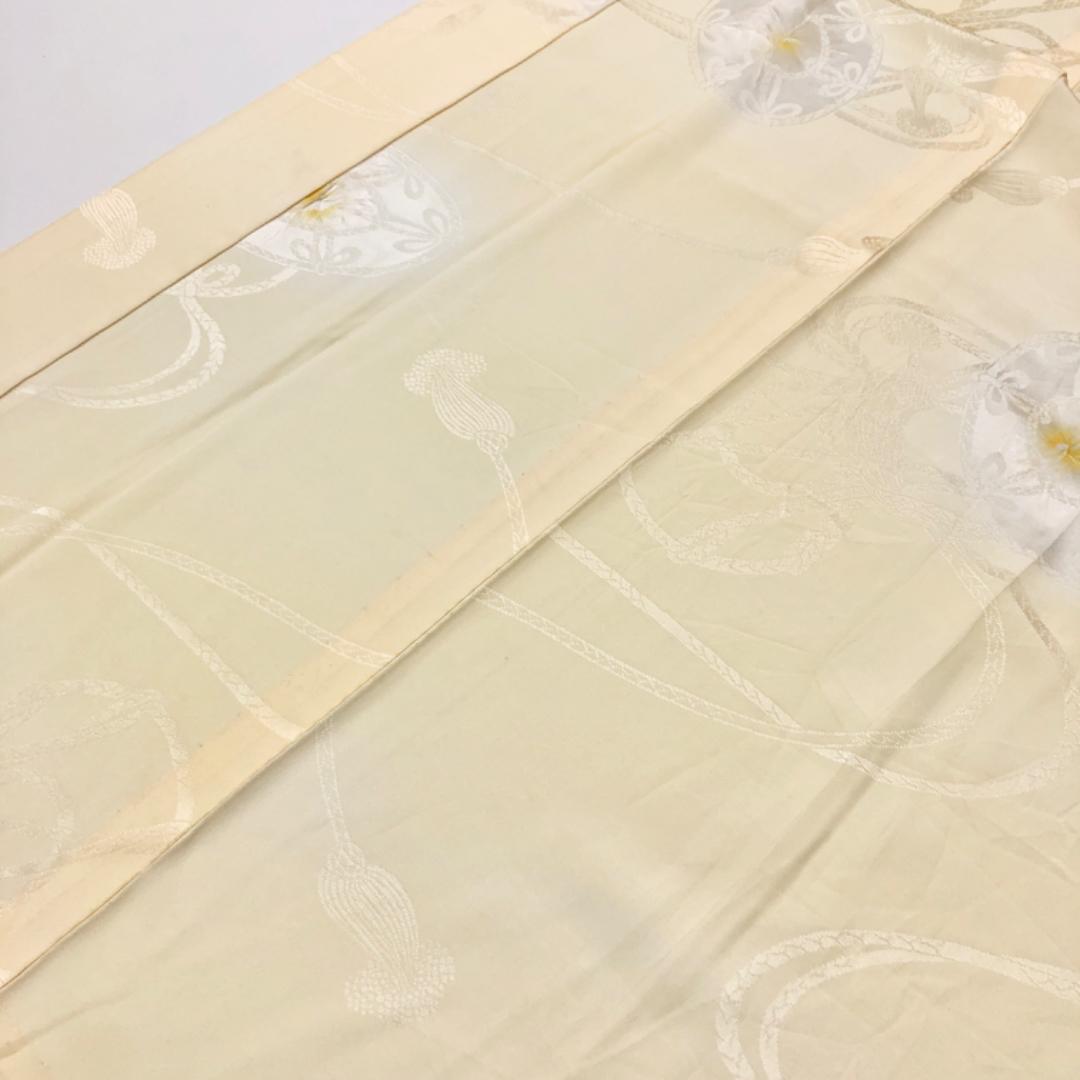 牙黄色の品のあるお色味に絞り柄、組紐がデザインされた刺繍半衿付の素敵なお品でございます。