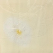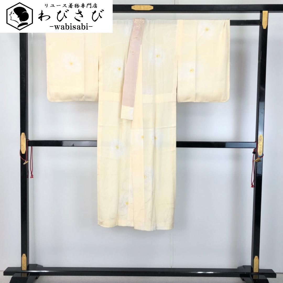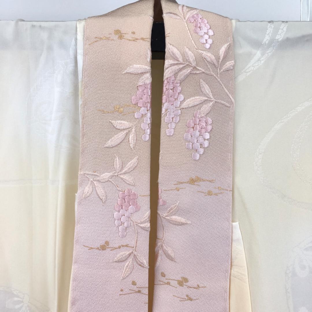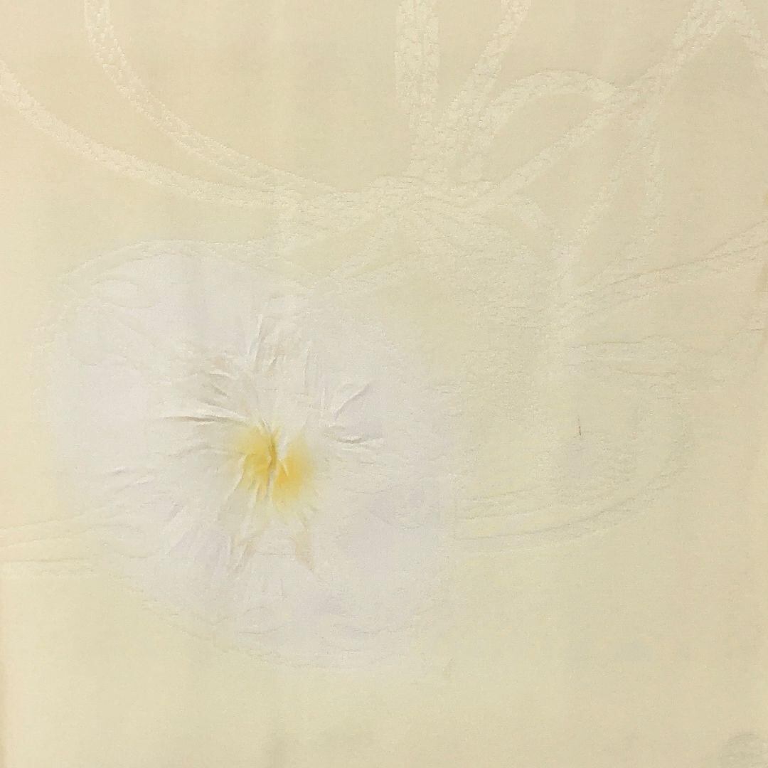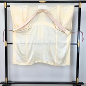 牙黄色の品のあるお色味に絞り柄、組紐がデザインされた刺繍半衿付の素敵なお品でございます。