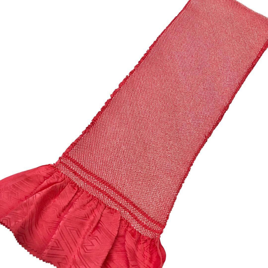 紅梅色ベースのお色味に総絞りの帯揚げ、丸組紐の素敵なお品でございます。