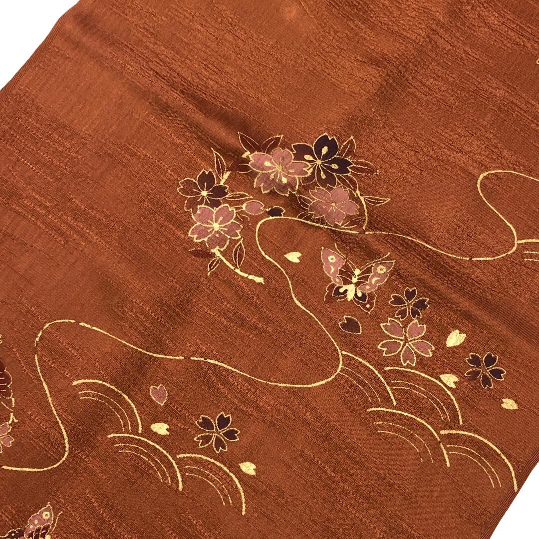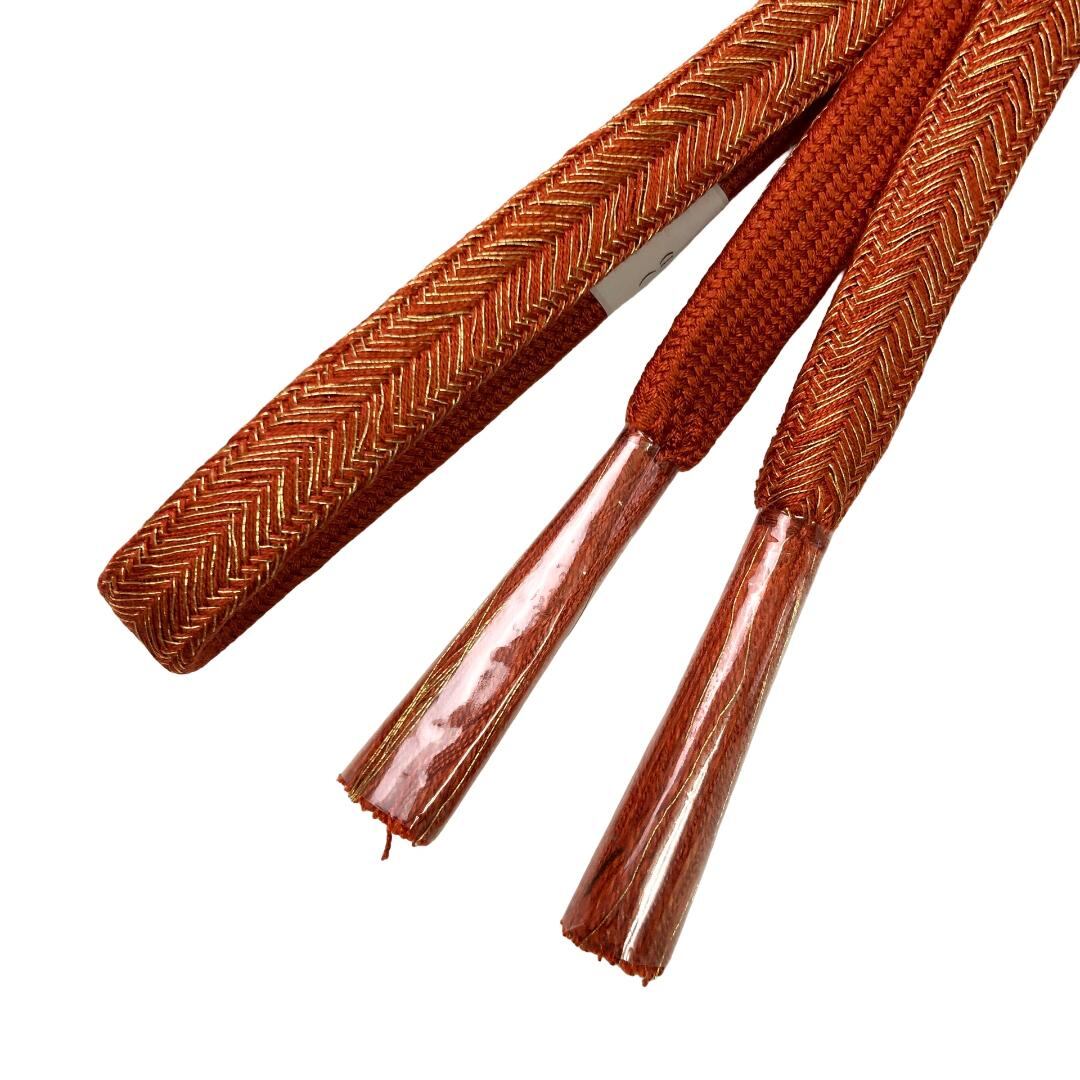 茶色ベースのお色味に紅葉、蝶々などの柄裄がデザインされた帯揚げ、平組紐の素敵なお品でございます。
