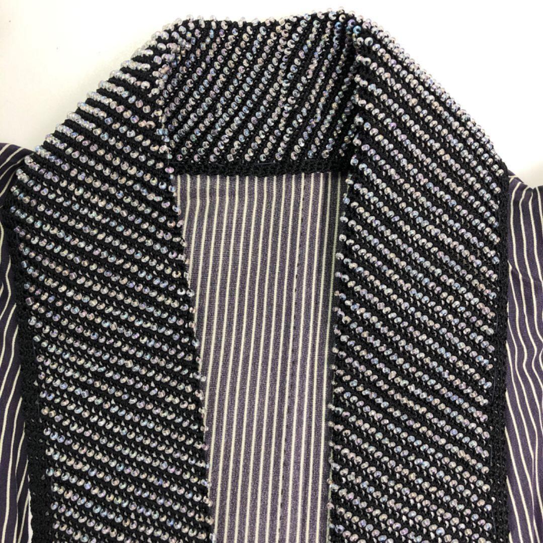 深紫色お色味に縦縞模様の柄裄、ビーズの半衿が素敵なお品でございます。