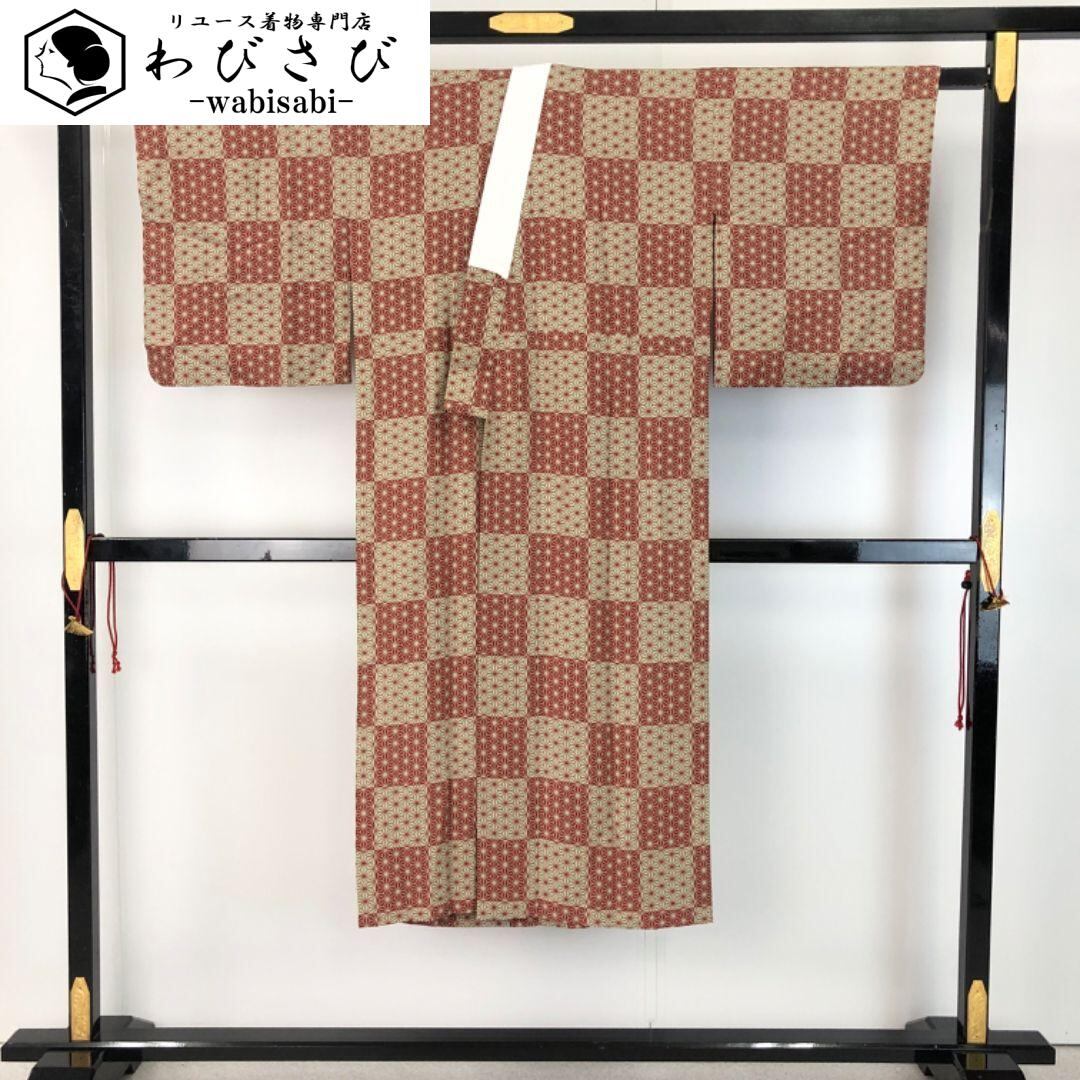 長襦袢 単衣 格子 麻の葉模様 薄裏柳色 縮緬 半衿付 J-343 着物 きもの kimono 和服 和装 中古 リサイクル着物 【送料無料】
