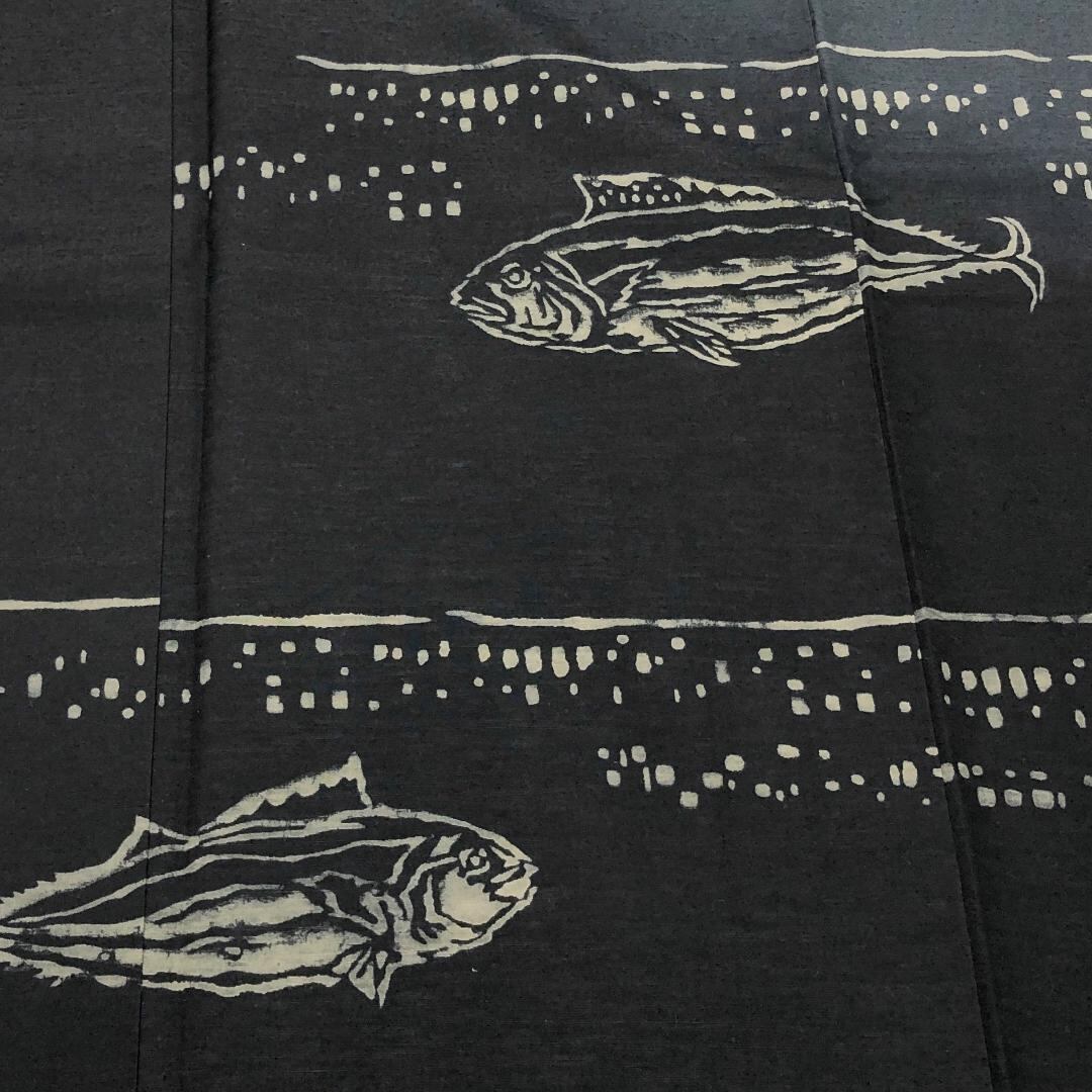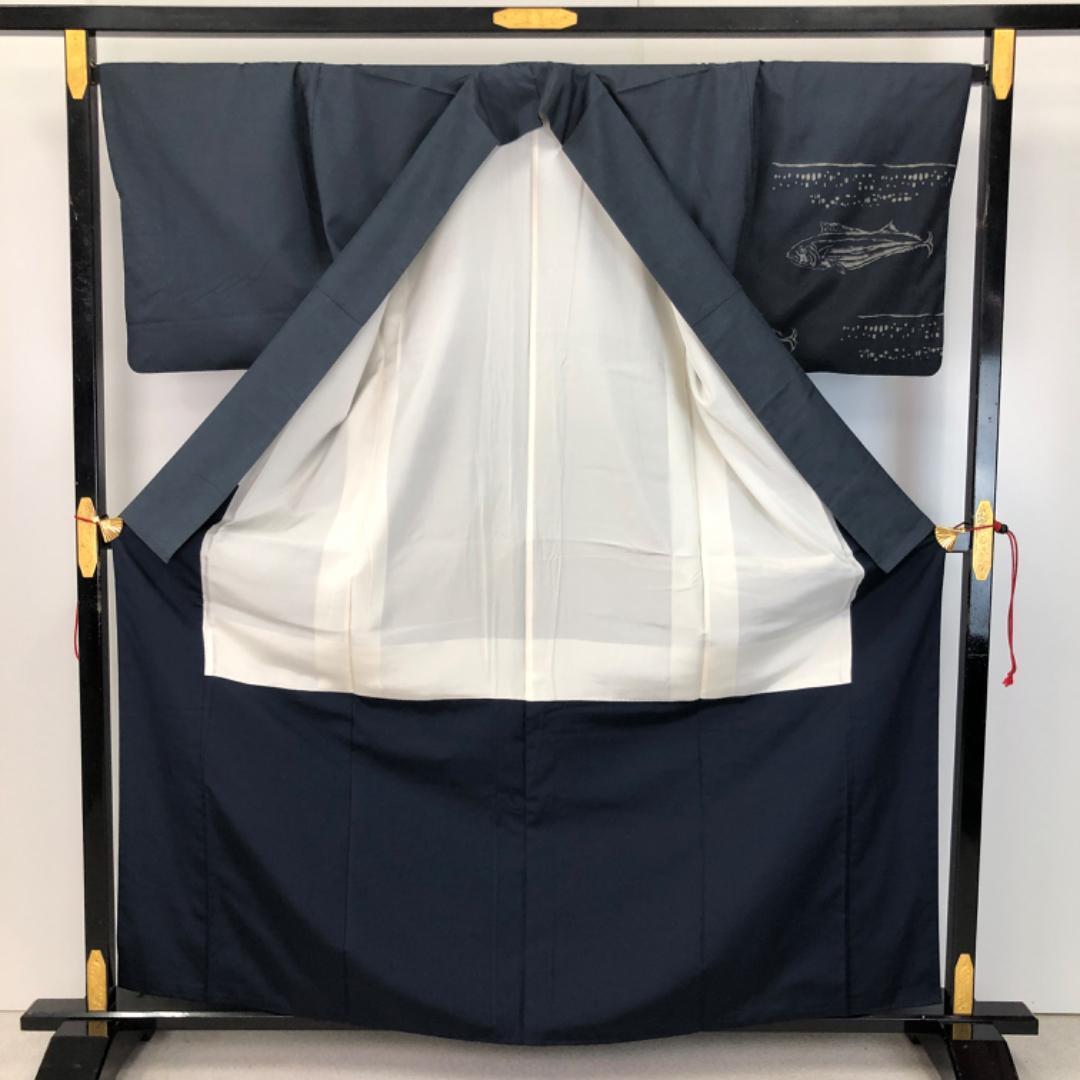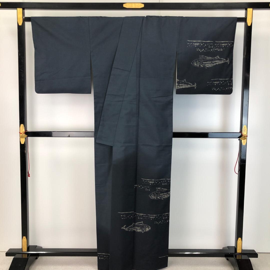 青墨色ベースの落ち着いたお色味の紬地に雰囲気の良い魚の柄裄がデザインされた素敵なお品でございます。
