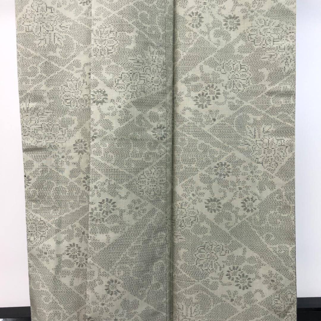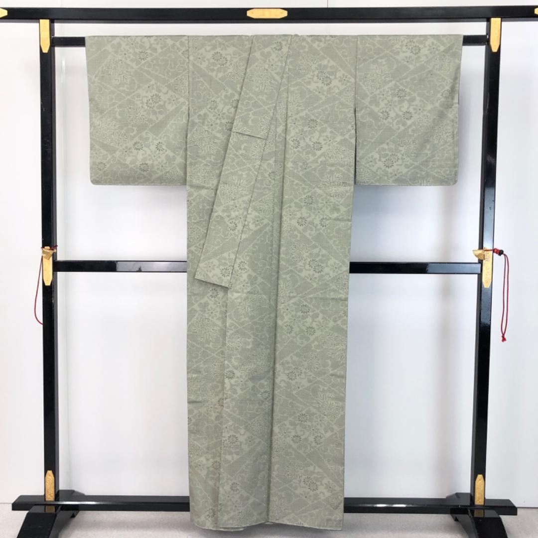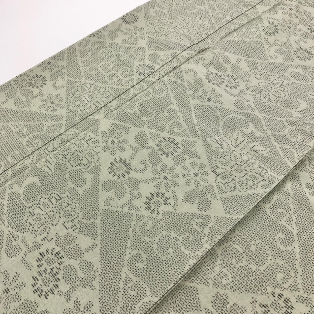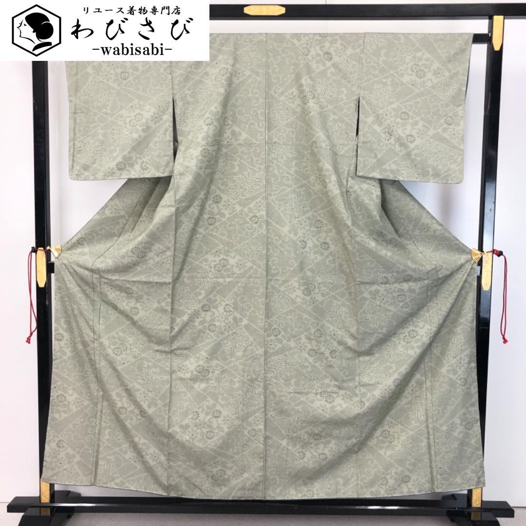 利休色の品のあるお色味に菱形、花模様がデザインされた雰囲気の良い素敵な柄裄のお品でございます。