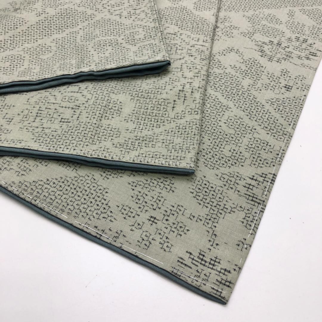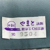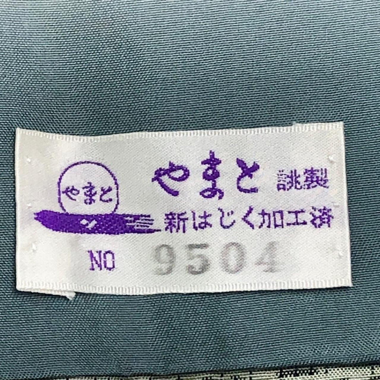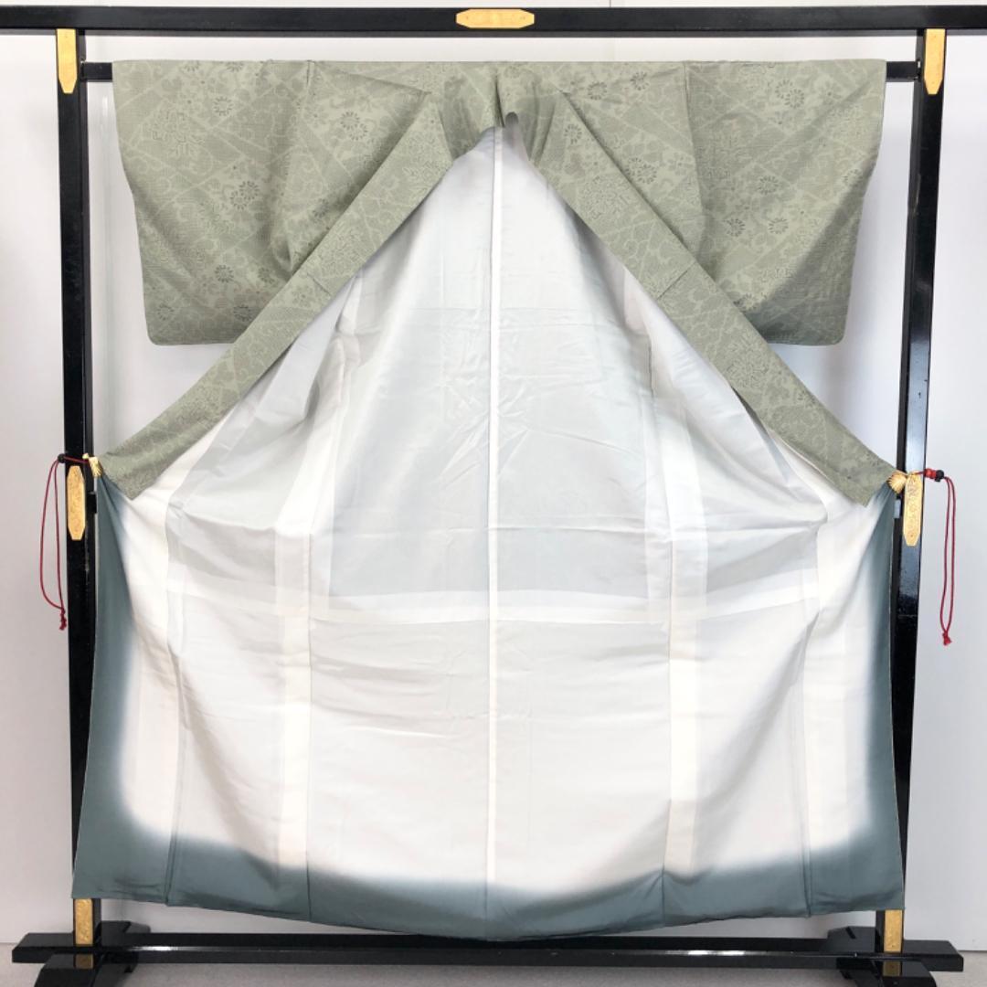 利休色の品のあるお色味に菱形、花模様がデザインされた雰囲気の良い素敵な柄裄のお品でございます。