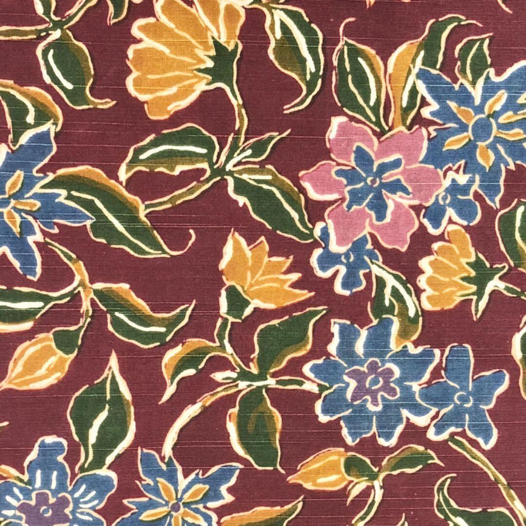 暗紅色のお色味の紬地に雰囲気の良い花唐草模様の柄裄がデザインされた素敵なお品でございます。