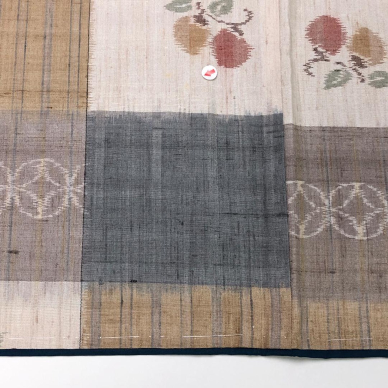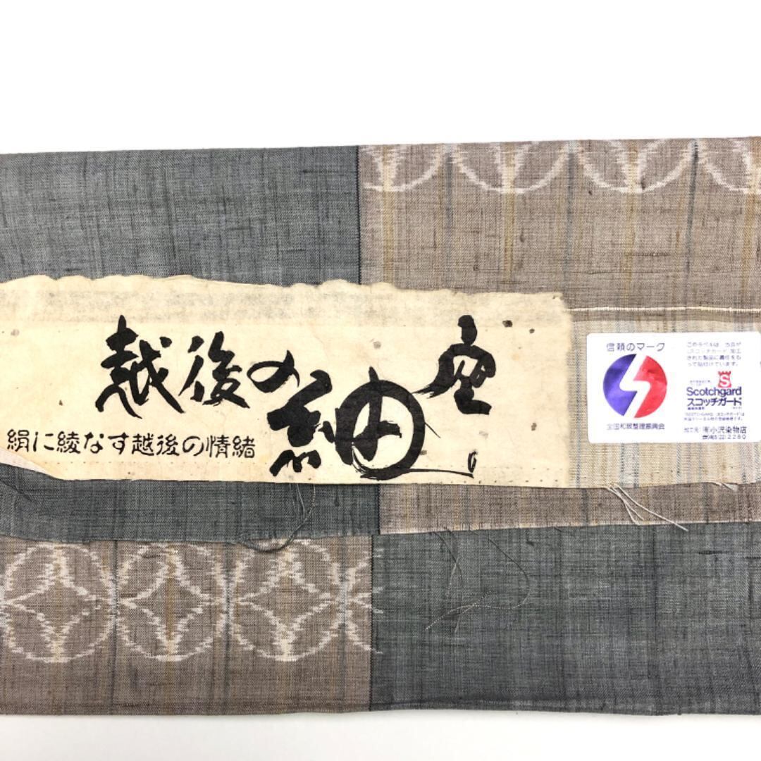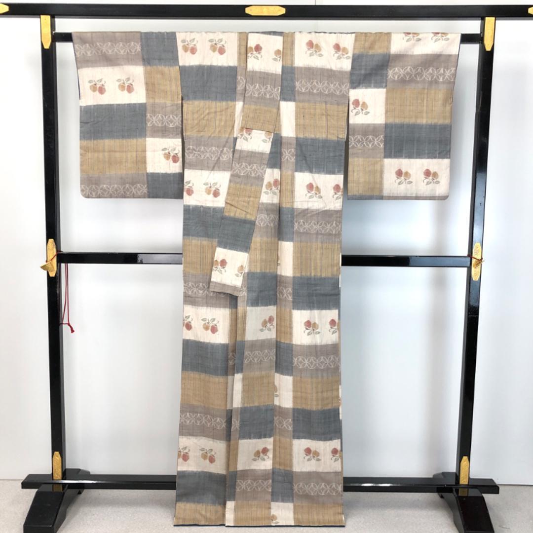 銀煤竹色ベースのお色味に四角に七宝柄、果実などの雰囲気の良い柄行がデザインされた素敵なお品でございます。