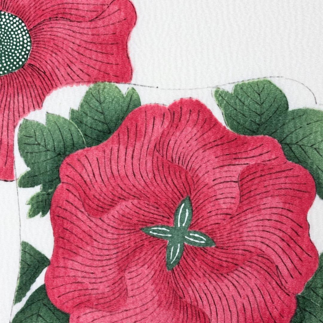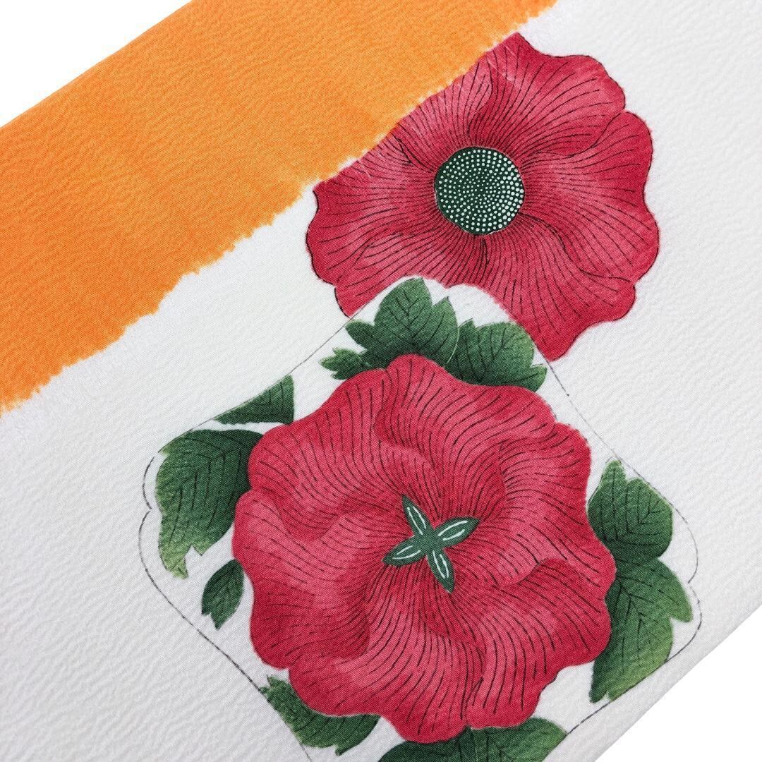 乳白色に橙色のお色味に手描きの花模様がデザインされた素敵な柄裄のお品でございます。