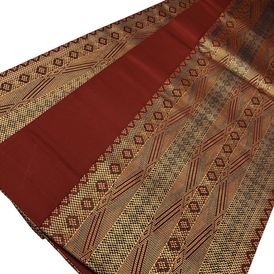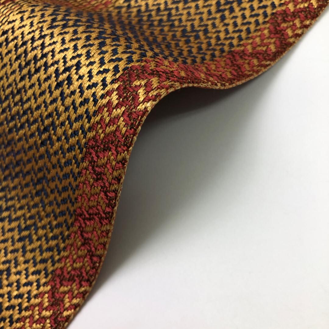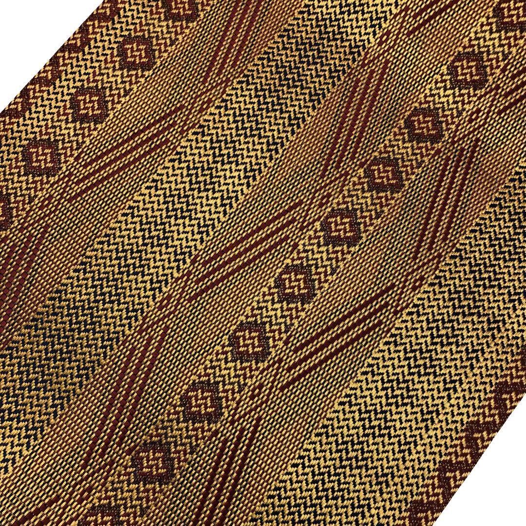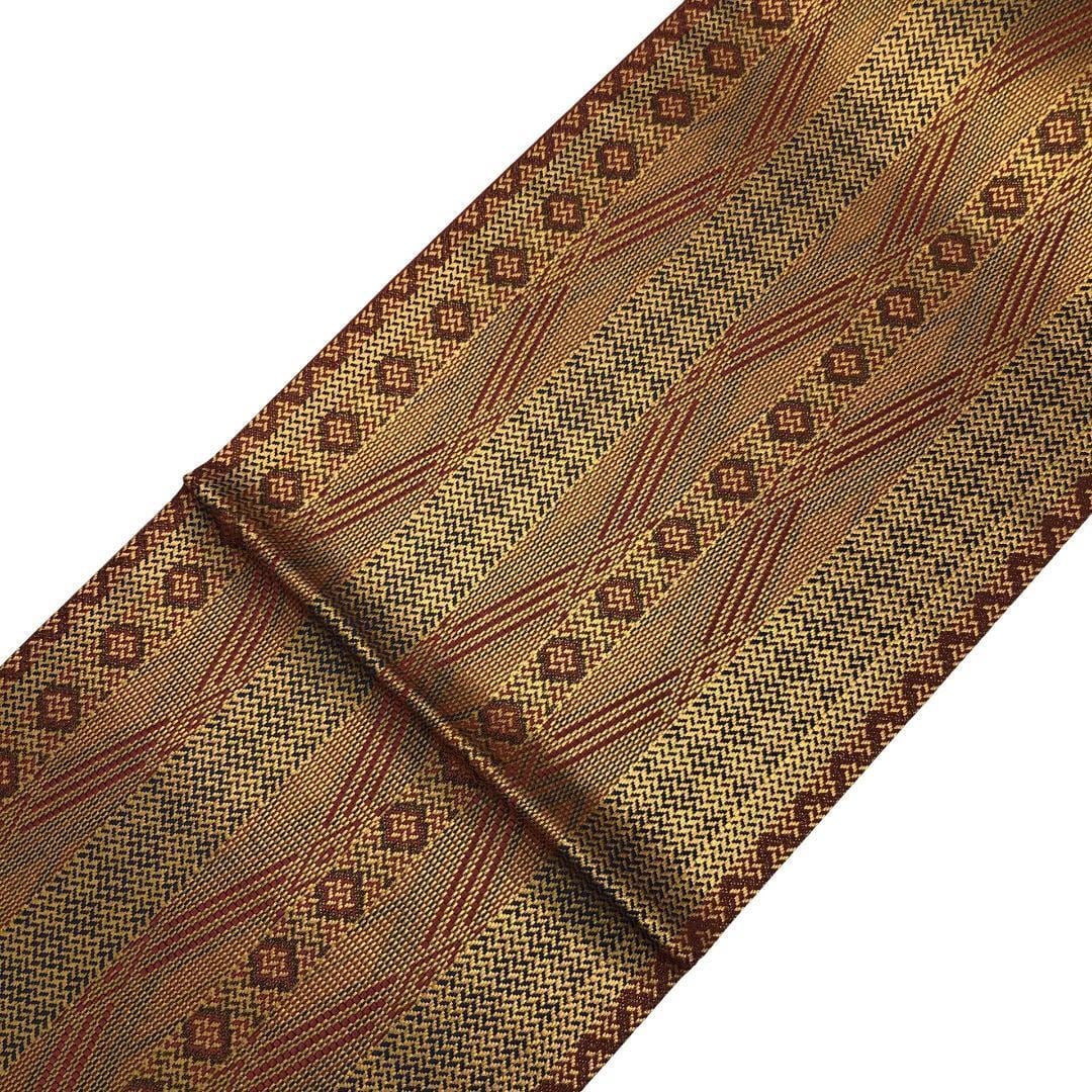 煌びやかなお色味に縦縞模様、菱形などの柄裄がデザインされた奮起の良い素敵なお品でございます。