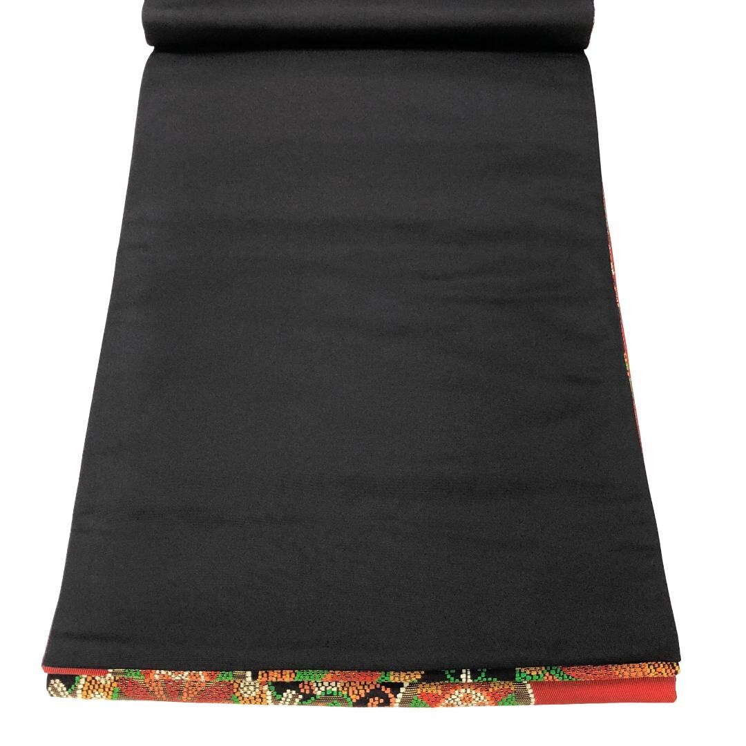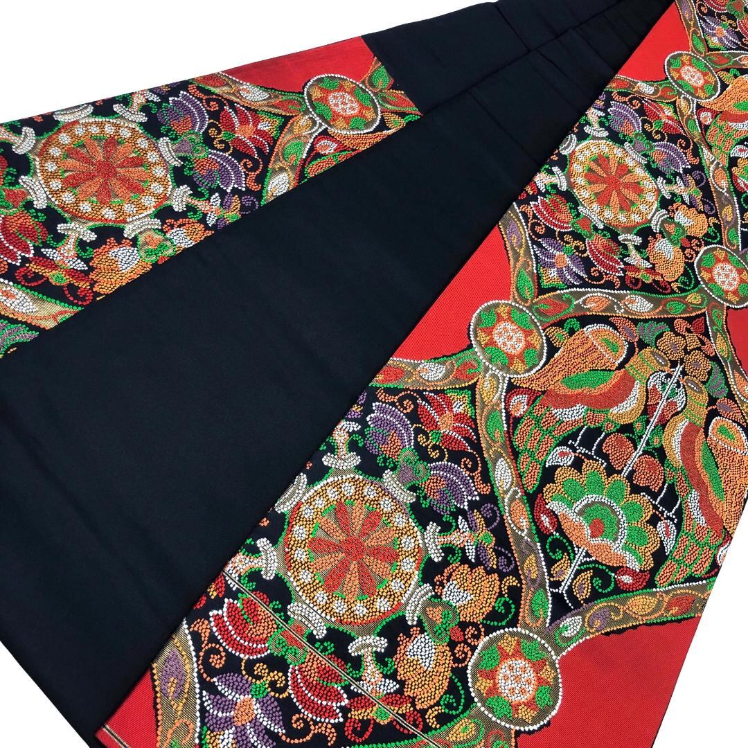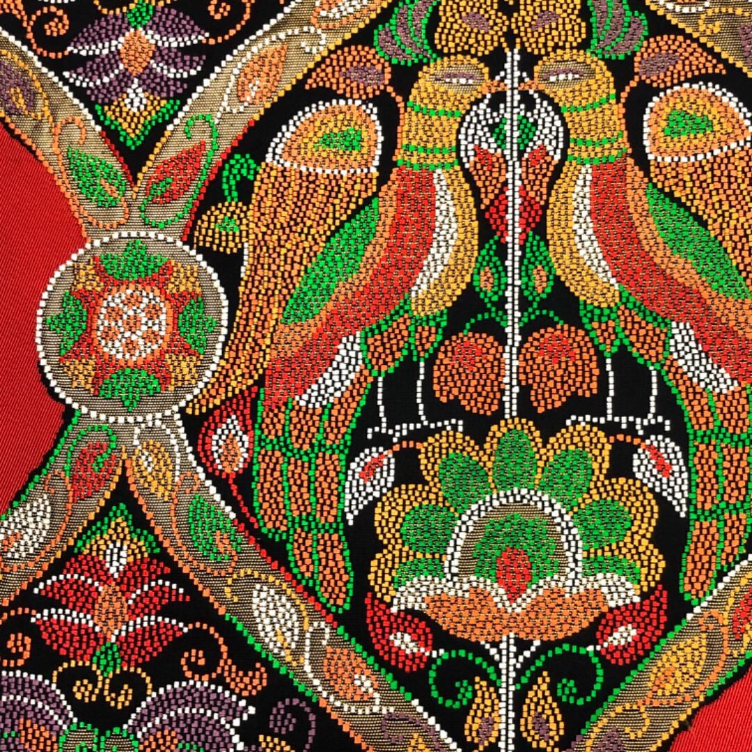 赤色ベースの色鮮やかなお色味、向かい孔雀や抽象花柄模様がデザインされた素敵な柄裄のお品でございます。