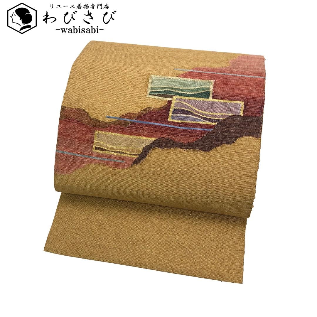 名古屋帯 紬 金通し 抽象模様 麦藁色 O-5563 着物 きもの kimono 和服 和装 中古 リサイクル着物 【送料無料】