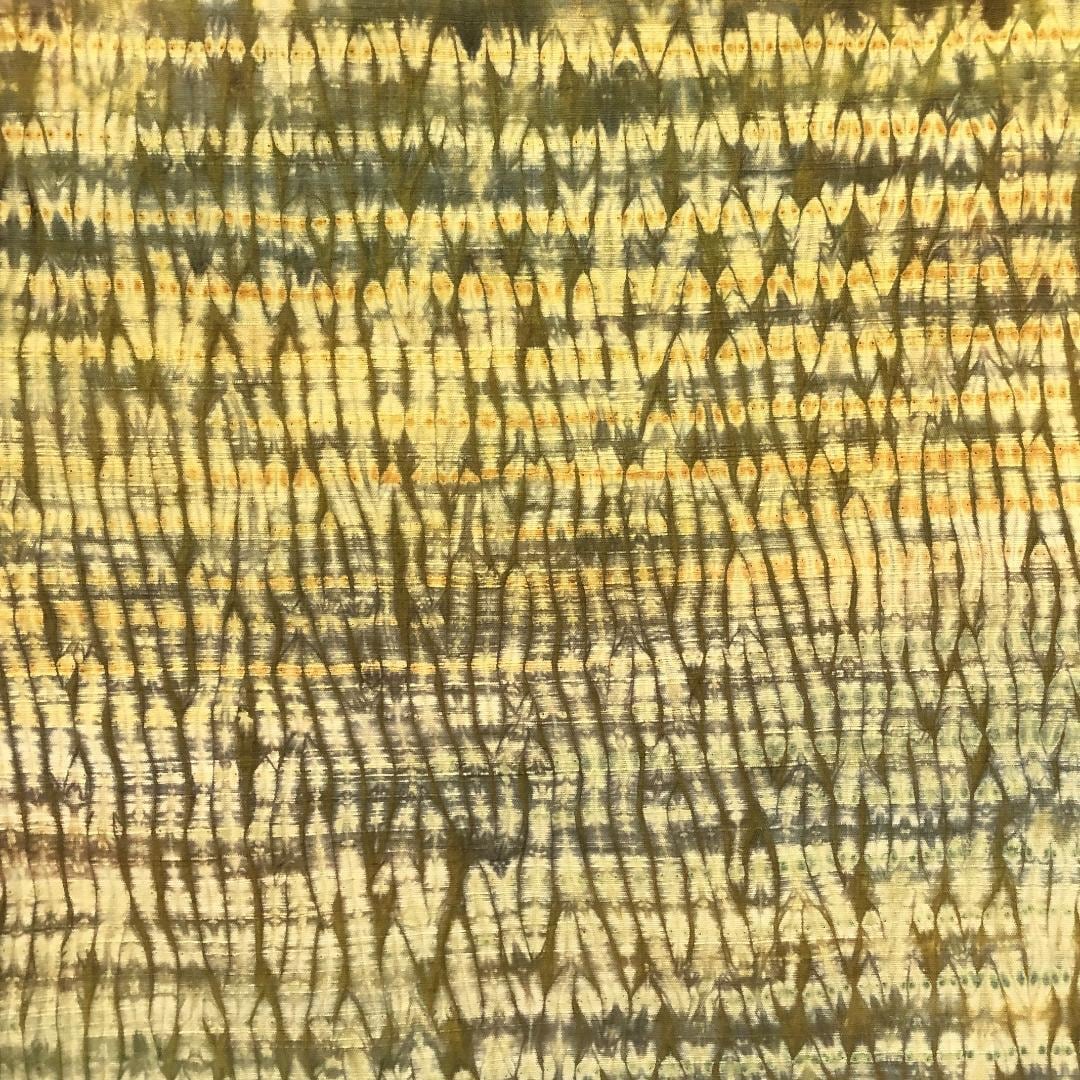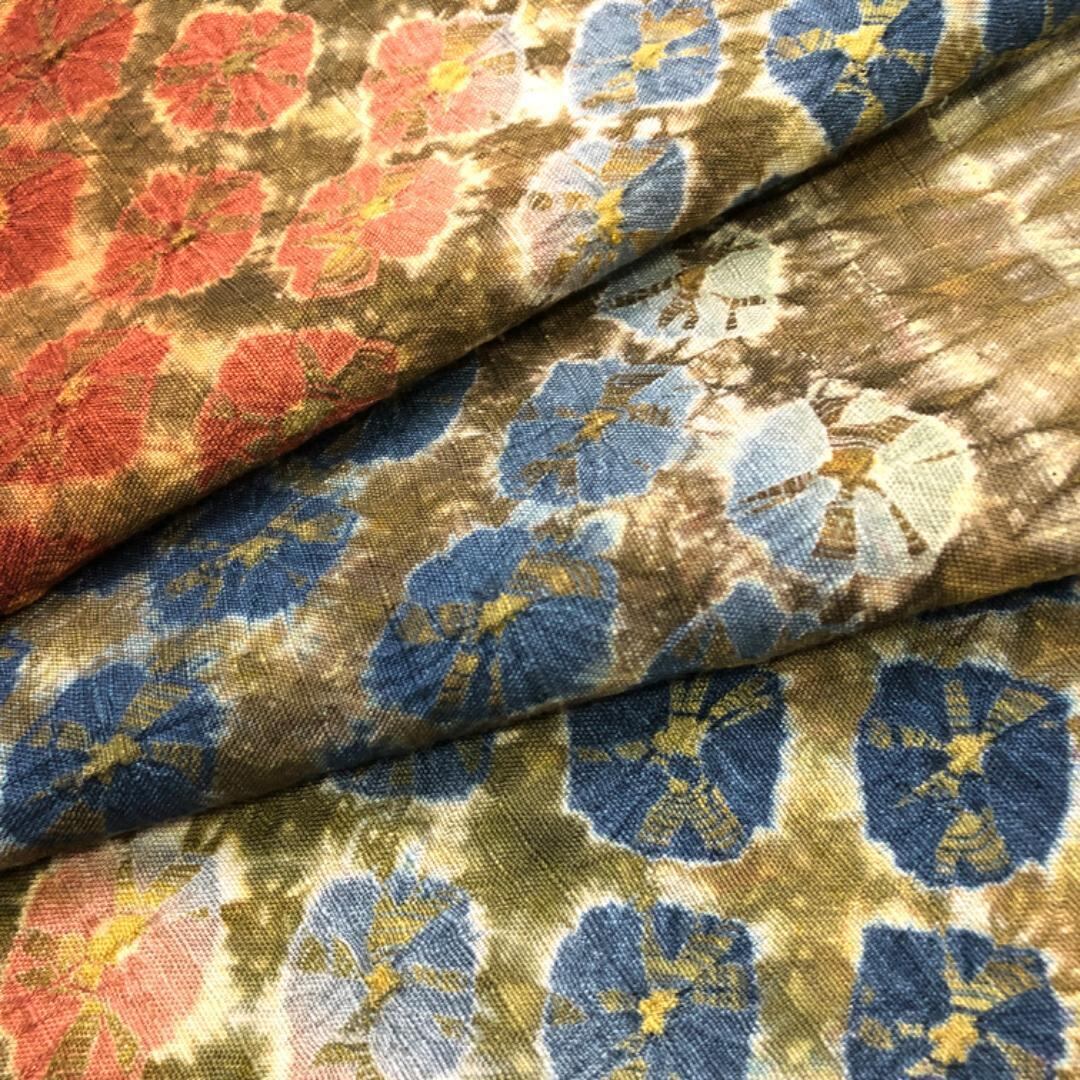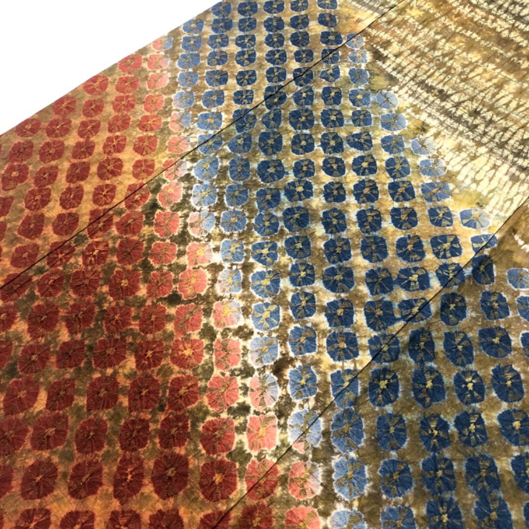 蝋色ベースの漢方染の独特な雰囲気のお色味、味わいのある絞り柄がデザインされた素敵なお品でございます。