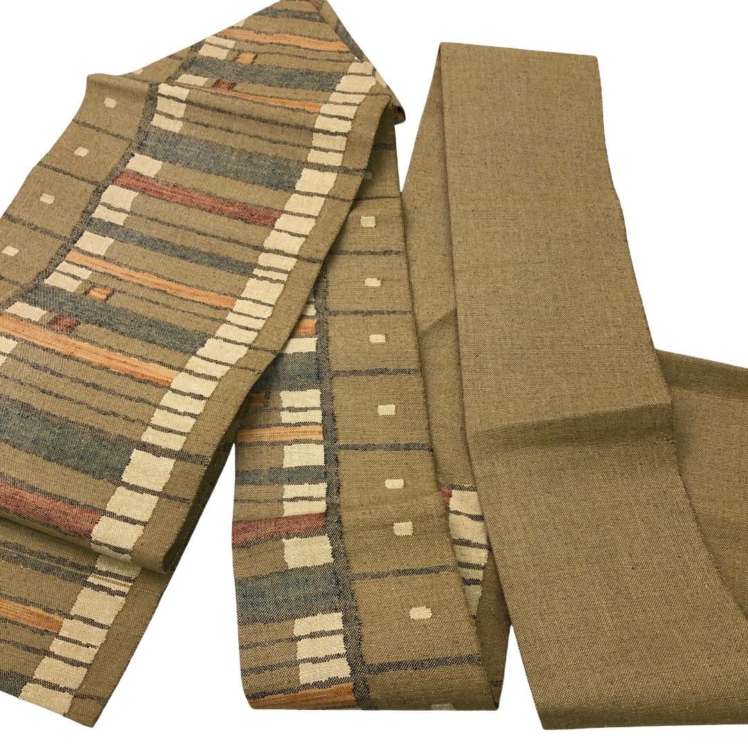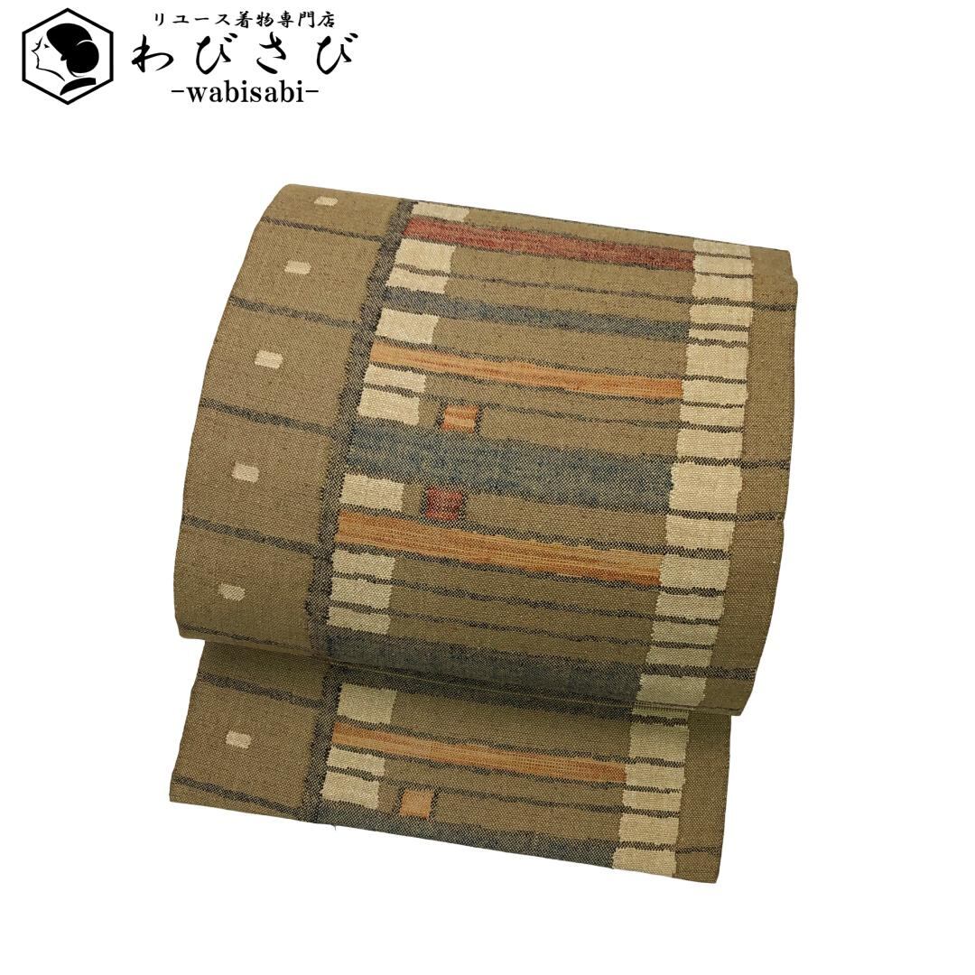 名古屋帯 真綿紬 横縞に四角柄 豆殻茶色 O-5573 着物 きもの kimono 和服 和装 中古 リサイクル着物 【送料無料】