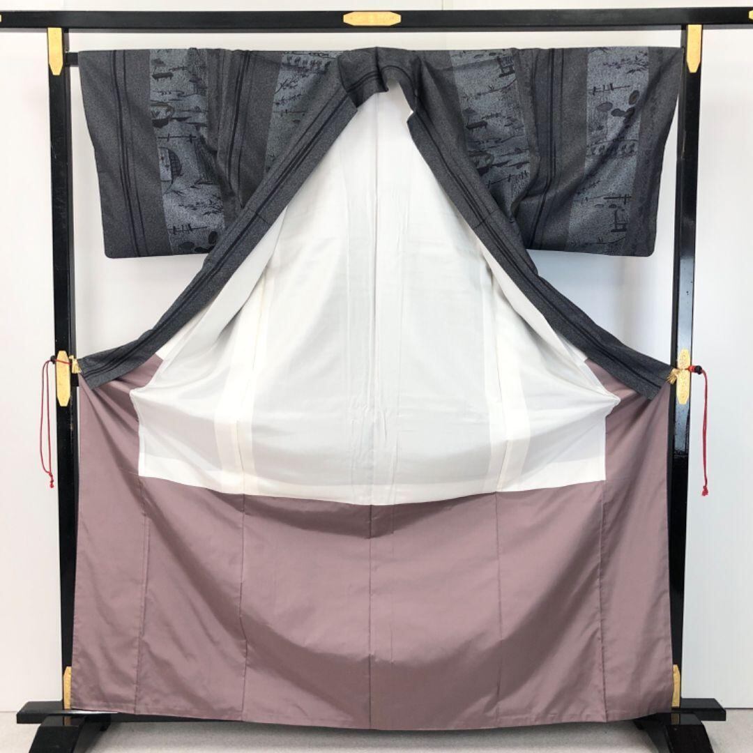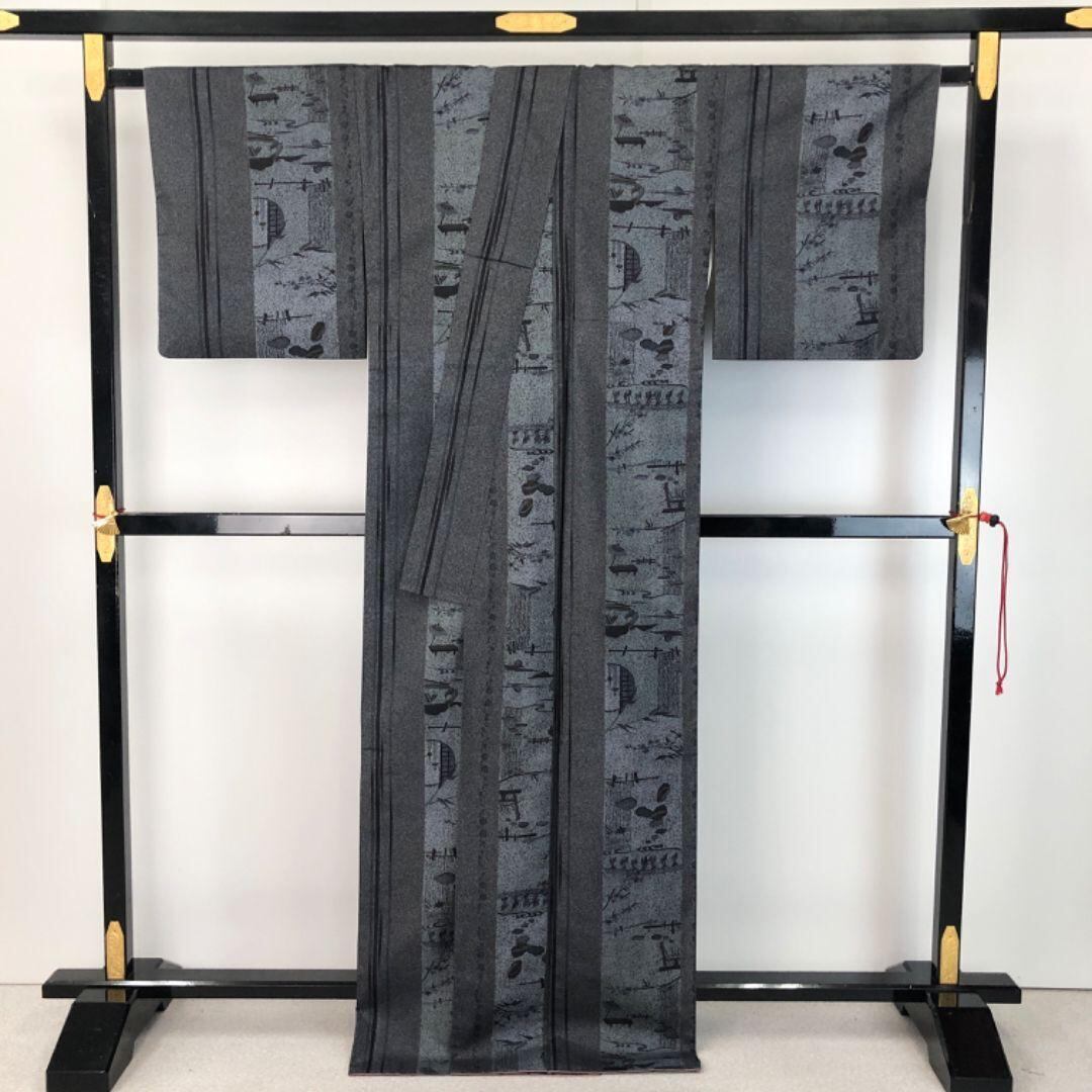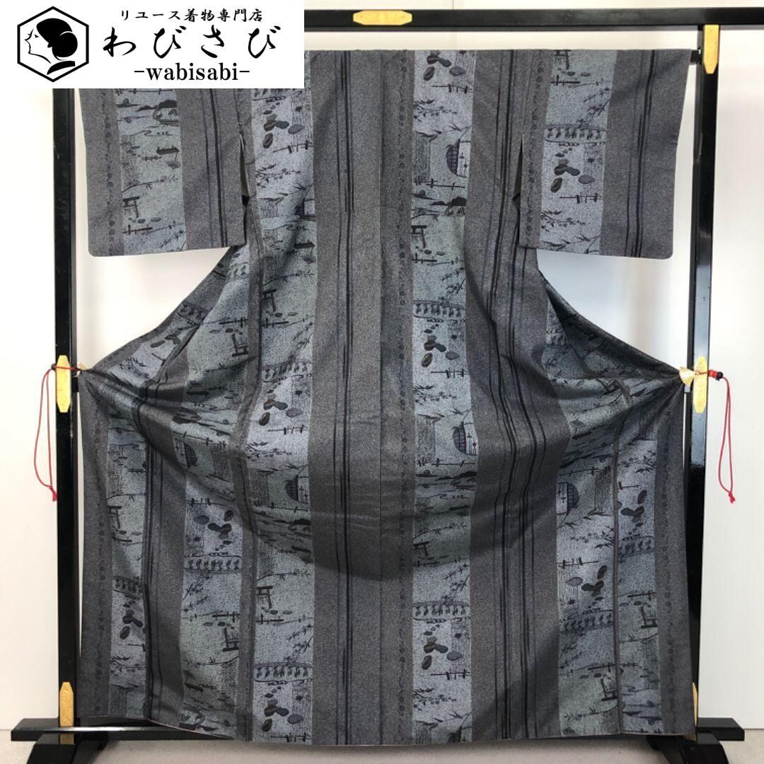 墨色の落ち着いたお色味に雰囲気の良い風景柄がデザインされた素敵な柄裄のお品でございます。