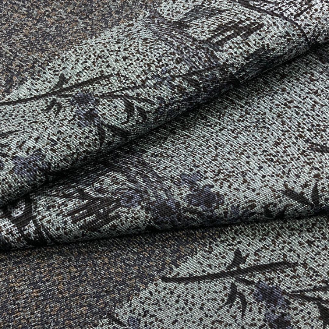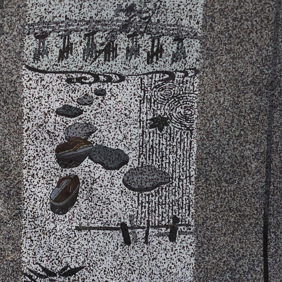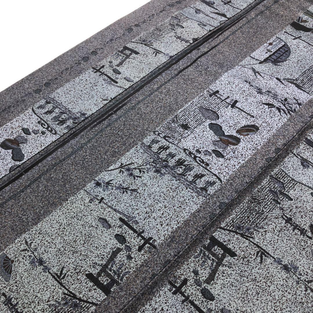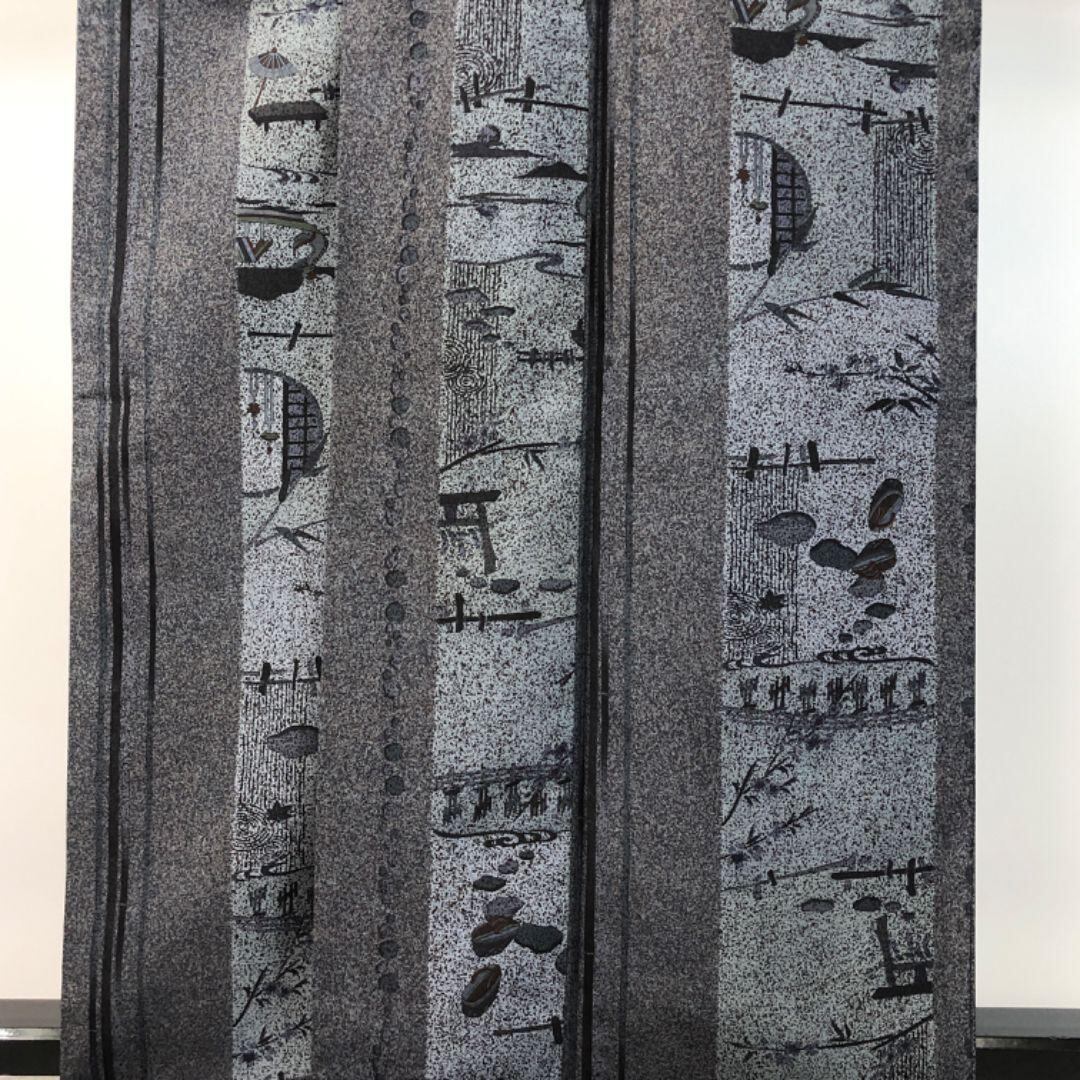 墨色の落ち着いたお色味に雰囲気の良い風景柄がデザインされた素敵な柄裄のお品でございます。