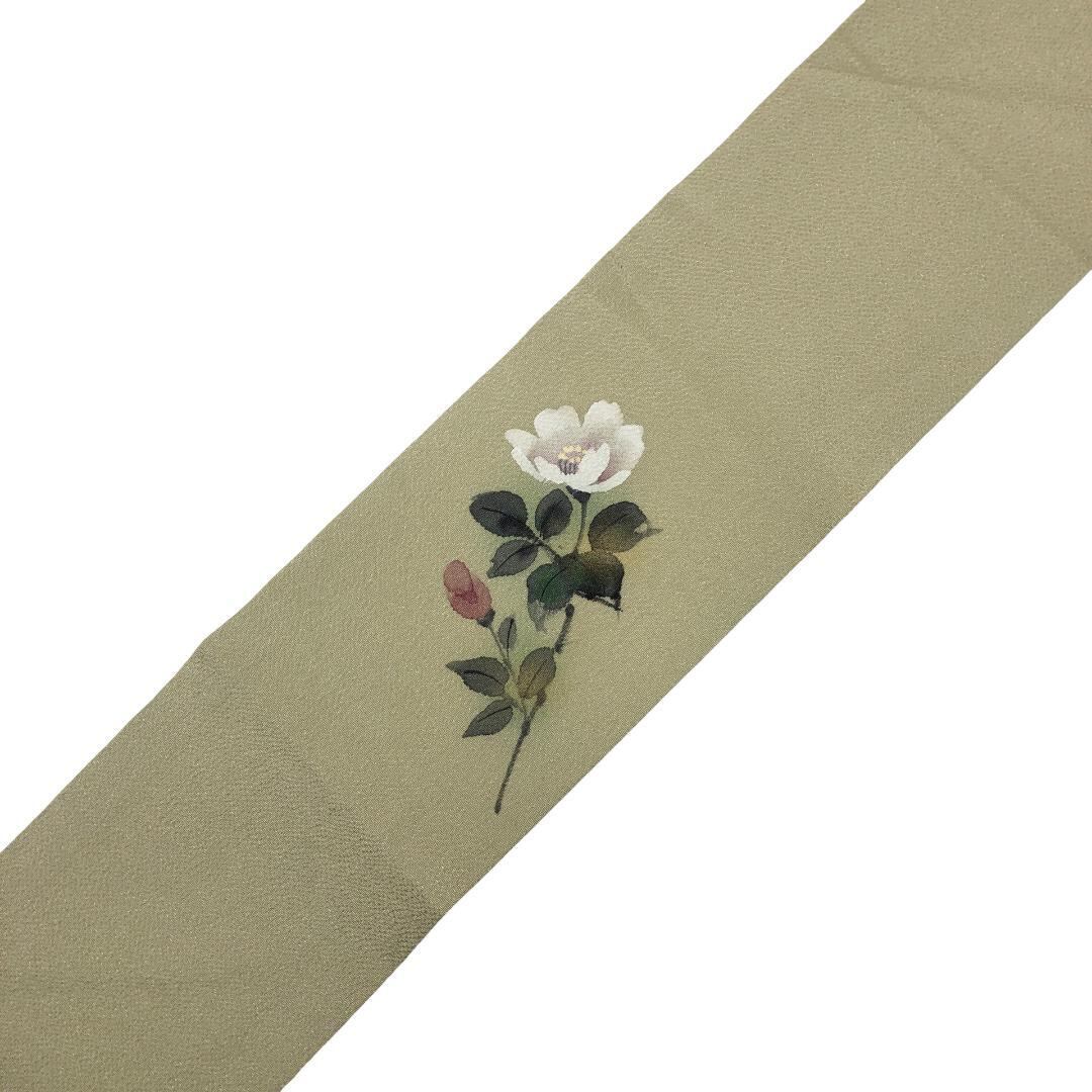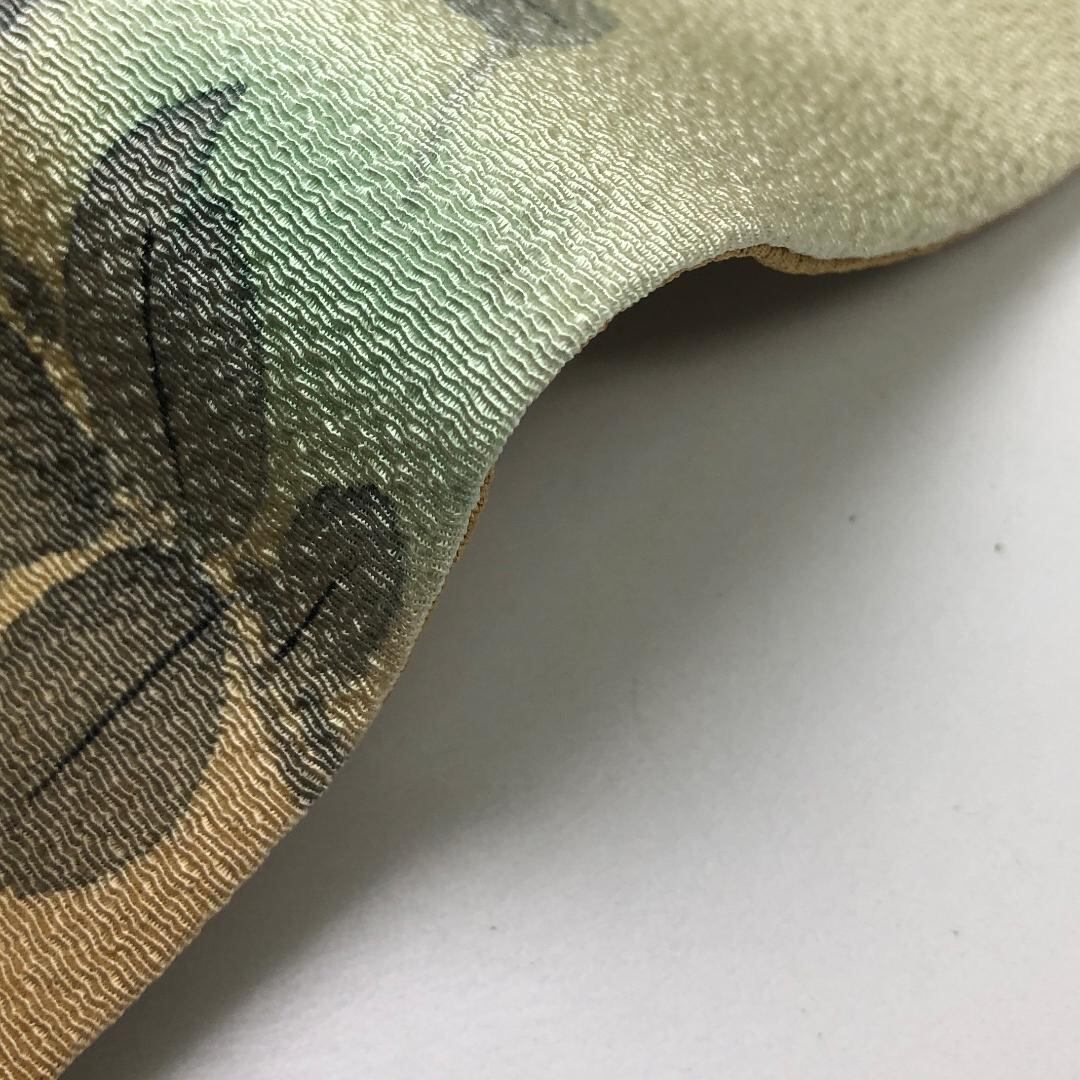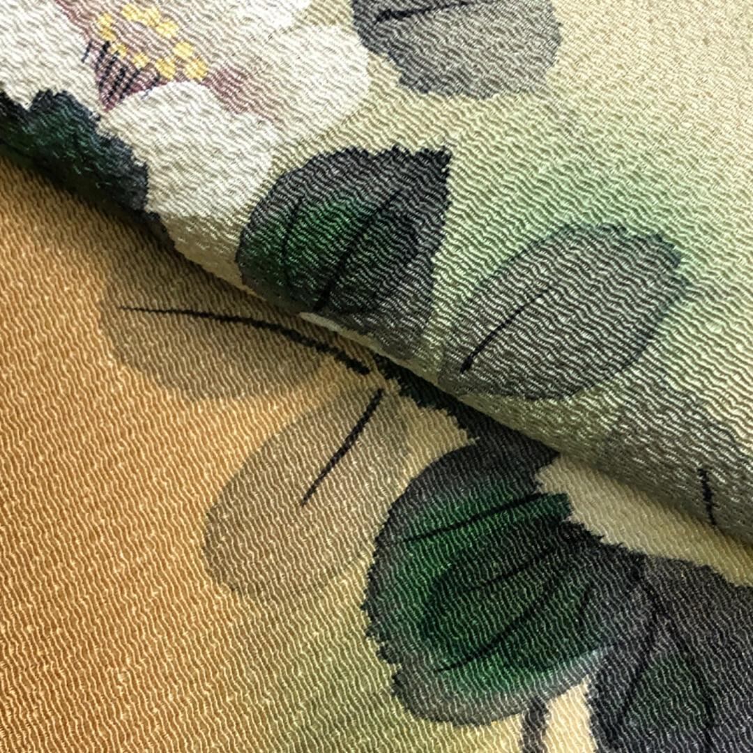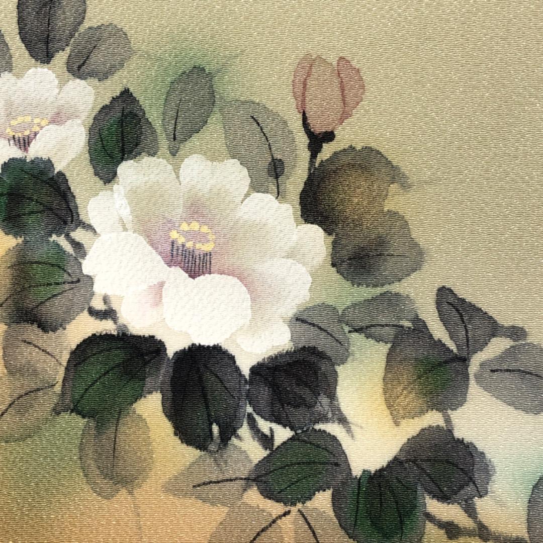 利休白茶色ベースのお色味の縮緬地に手描きの花模様がデザインされた素敵な柄裄のお品でございます。
