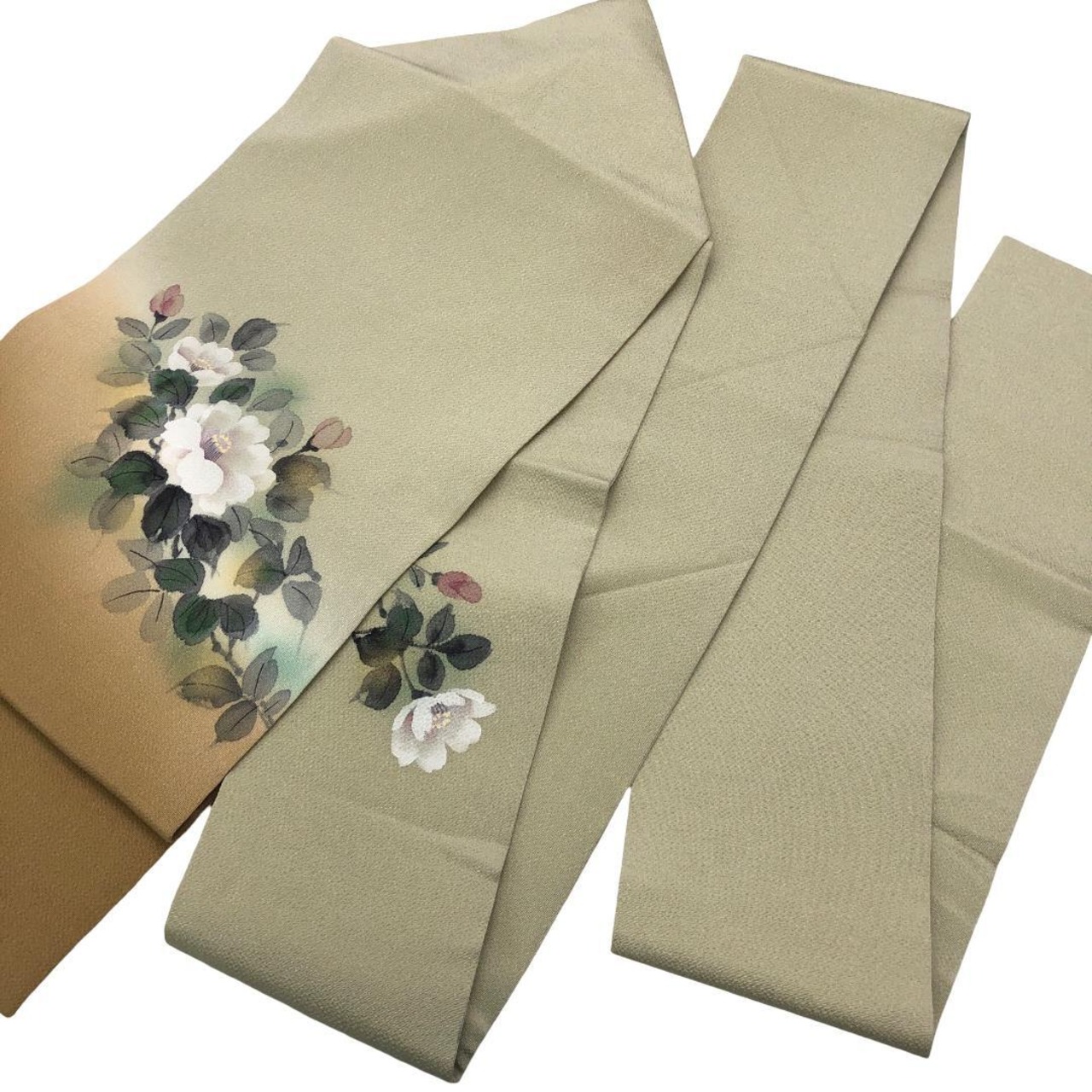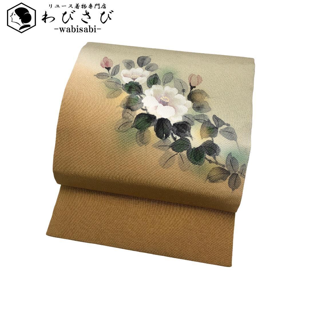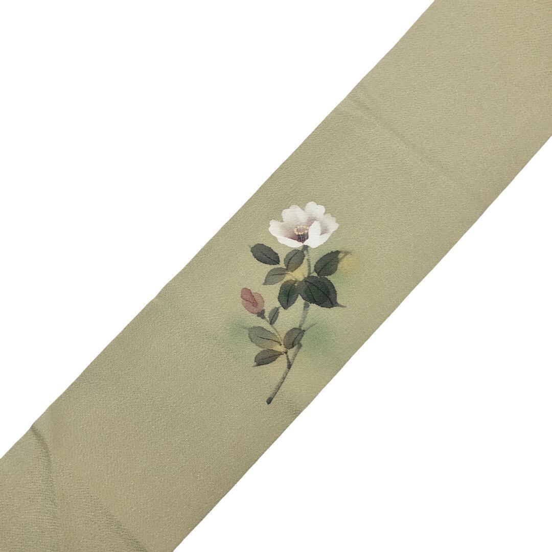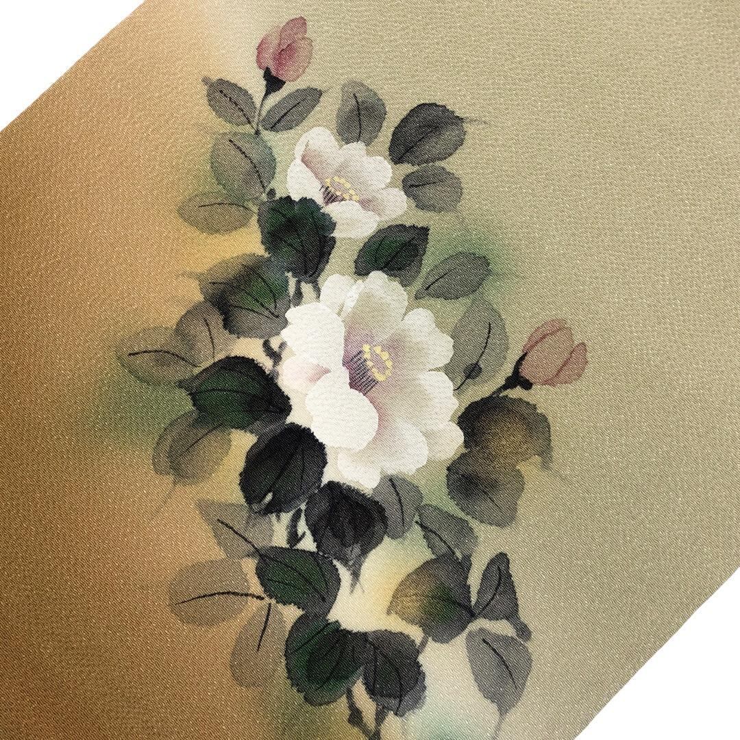 利休白茶色ベースのお色味の縮緬地に手描きの花模様がデザインされた素敵な柄裄のお品でございます。