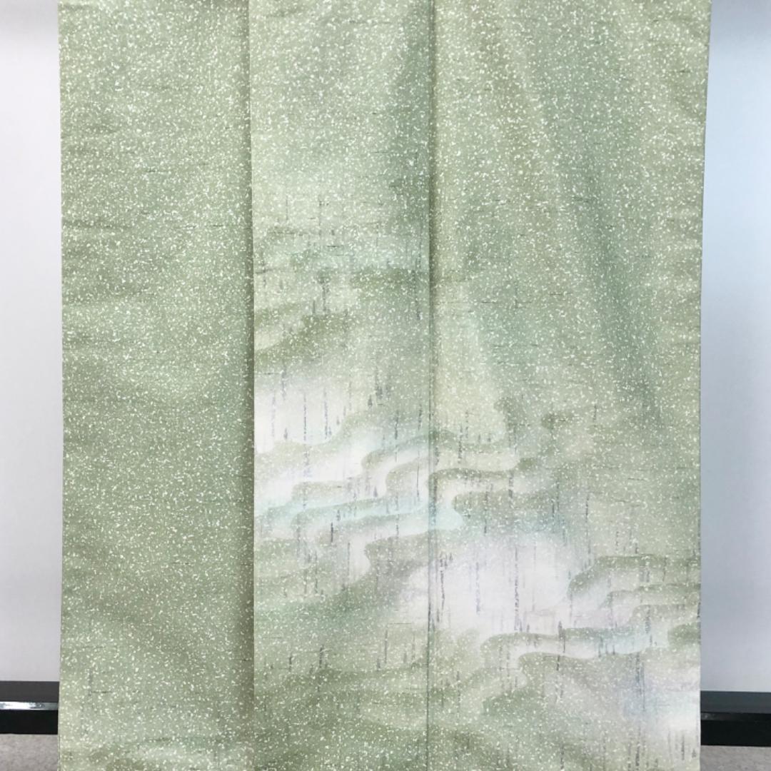 若緑色の品のあるお色味に叩き染、暈しの雰囲気の良い柄行がデザインされた素敵なお品でございます。