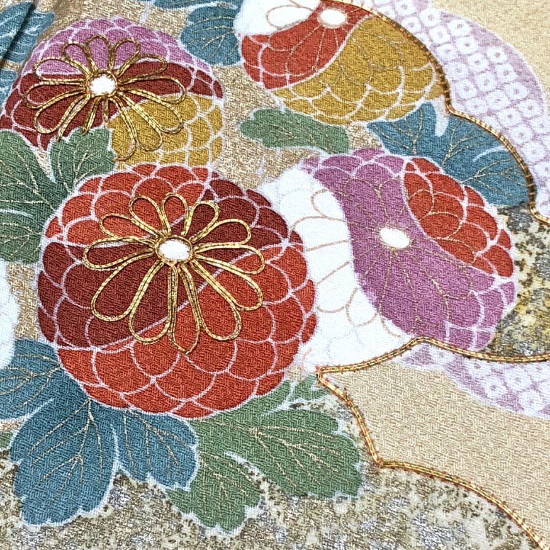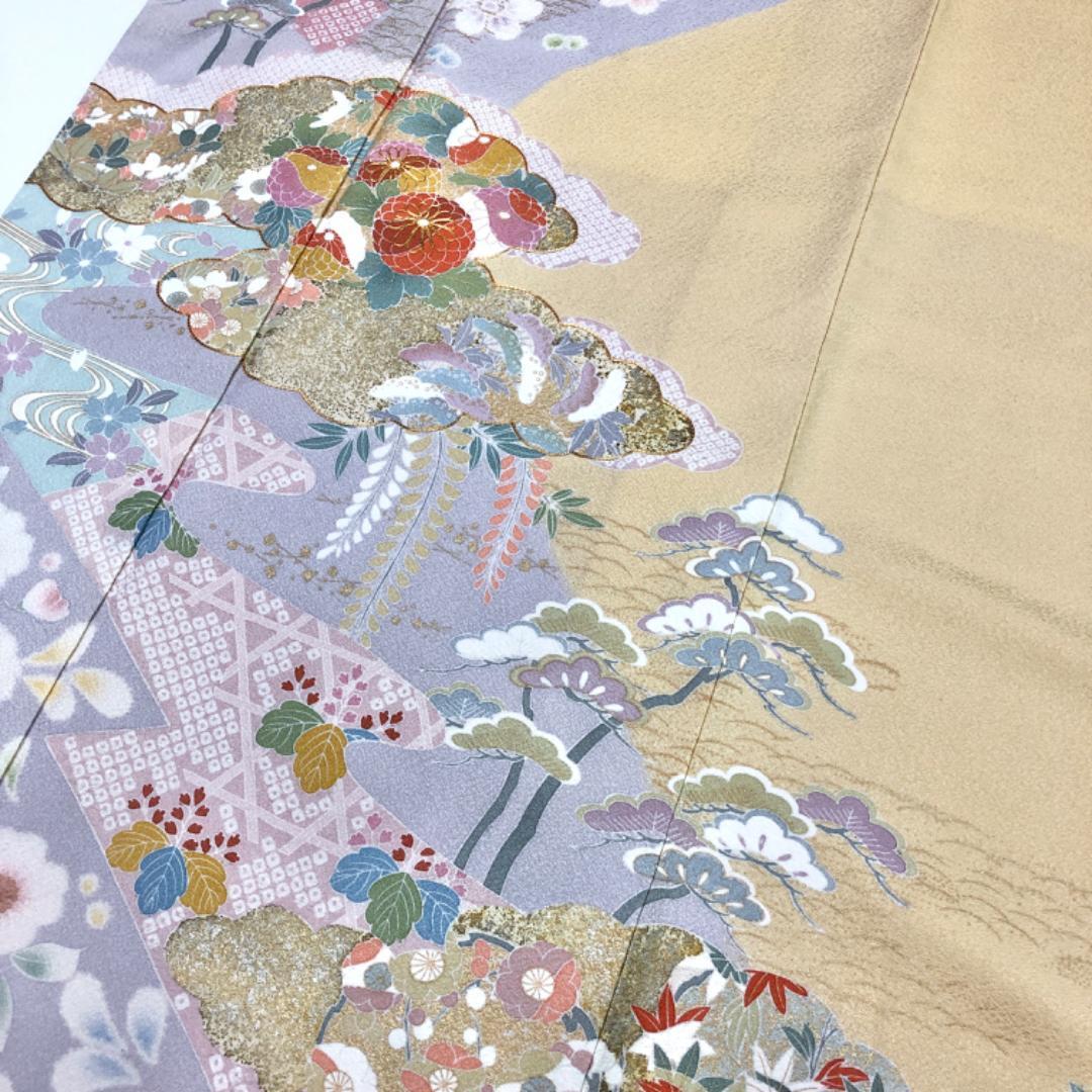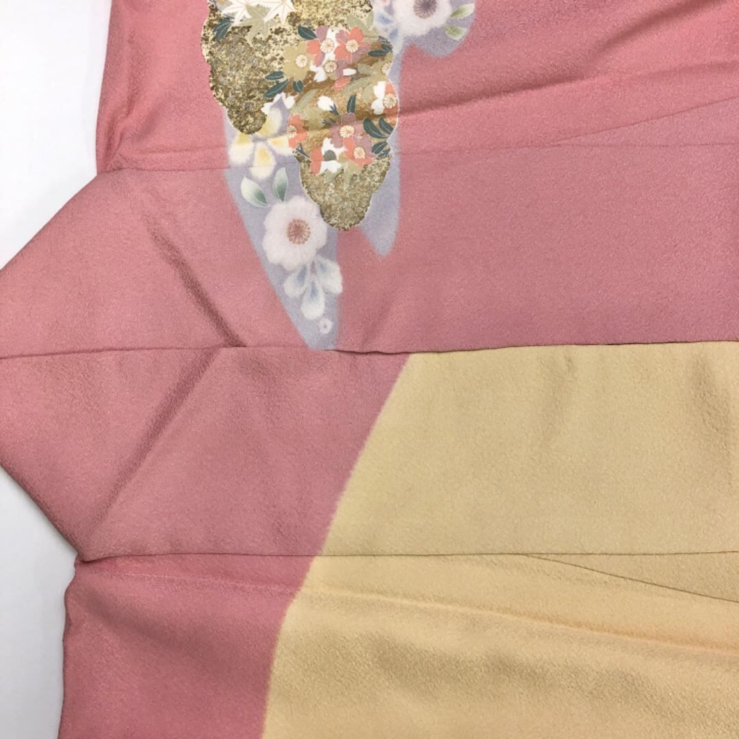 桃色ベースの色鮮やかな色彩に金駒、金彩が使われた美しい花模様、流水などの華やかな柄裄の素敵なお品でございます。