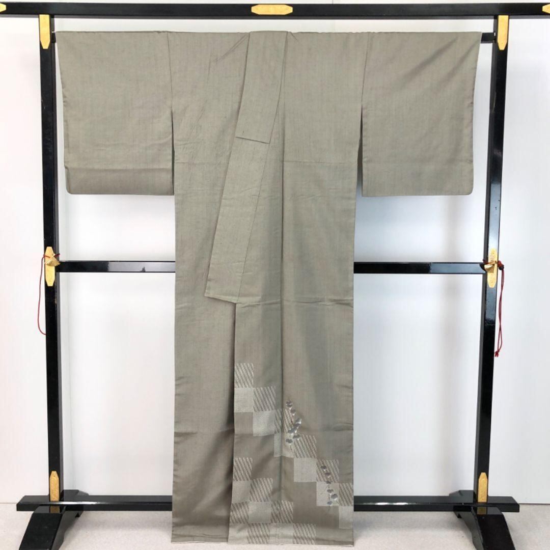付下げ 生紬 四角に蔓葉模様 金彩 利休鼠色 トールサイズ K-5422 着物 きもの kimono 和服 和装 中古 リサイクル着物 【送料無料】