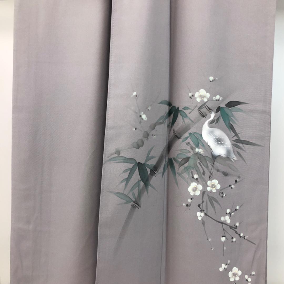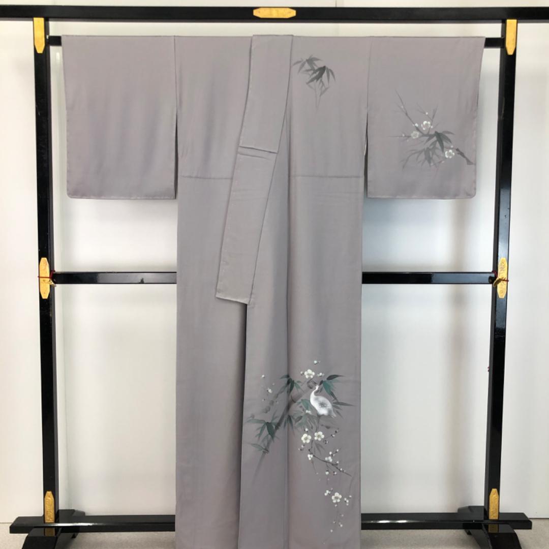鈍紫色のお色味に手描きの梅竹に鷺の柄裄がデザインされた雰囲気の良い素敵なお品でございます。