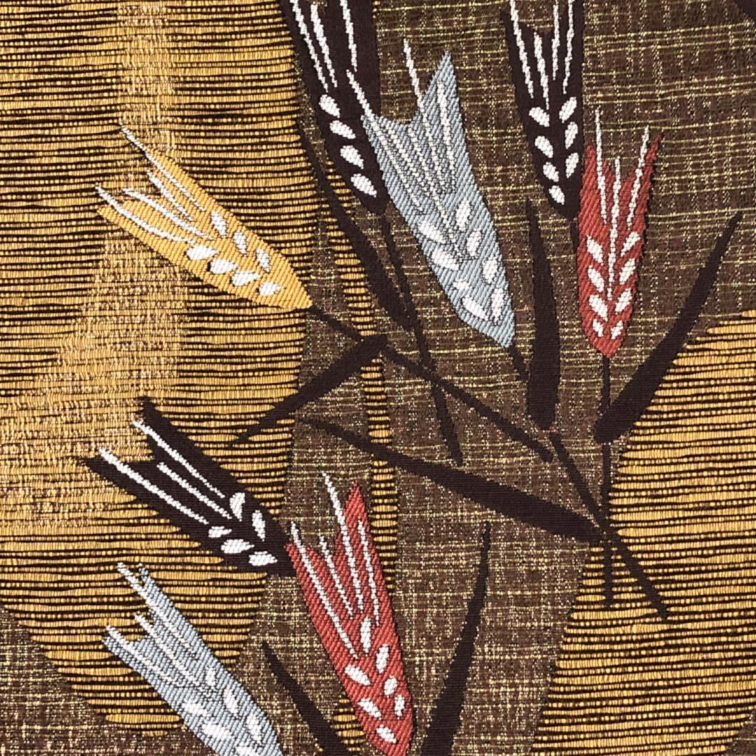 柿渋染、紙風染と題された国防色ベースの落ち着いたお色味に麦、曲線模様がデザインされた雰囲気の良い素敵な柄裄のお品でございます。