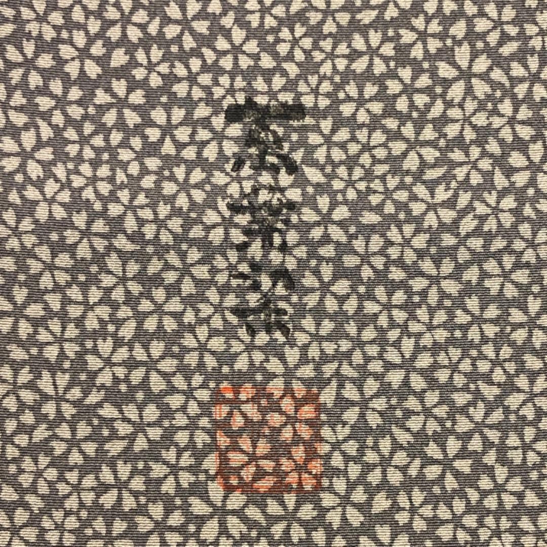 灰色のお色味に萬葉染の可愛らしい桜の花柄模様がデザインされた雰囲気の良い素敵なお品でございます。