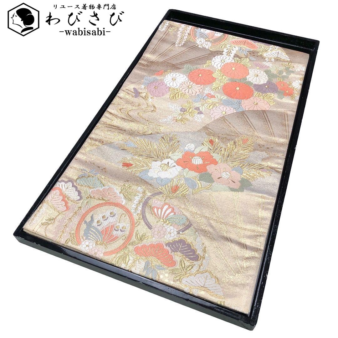 袋帯 扇子に花草模様 蝶々 流水 金糸 金色 O-5589 着物 きもの kimono 和服 和装 中古 リサイクル着物 【送料無料】