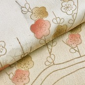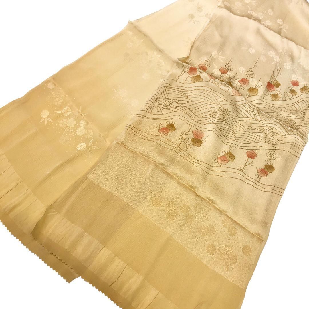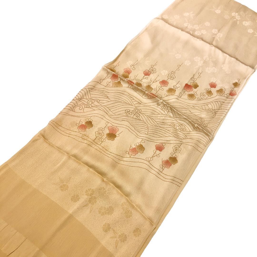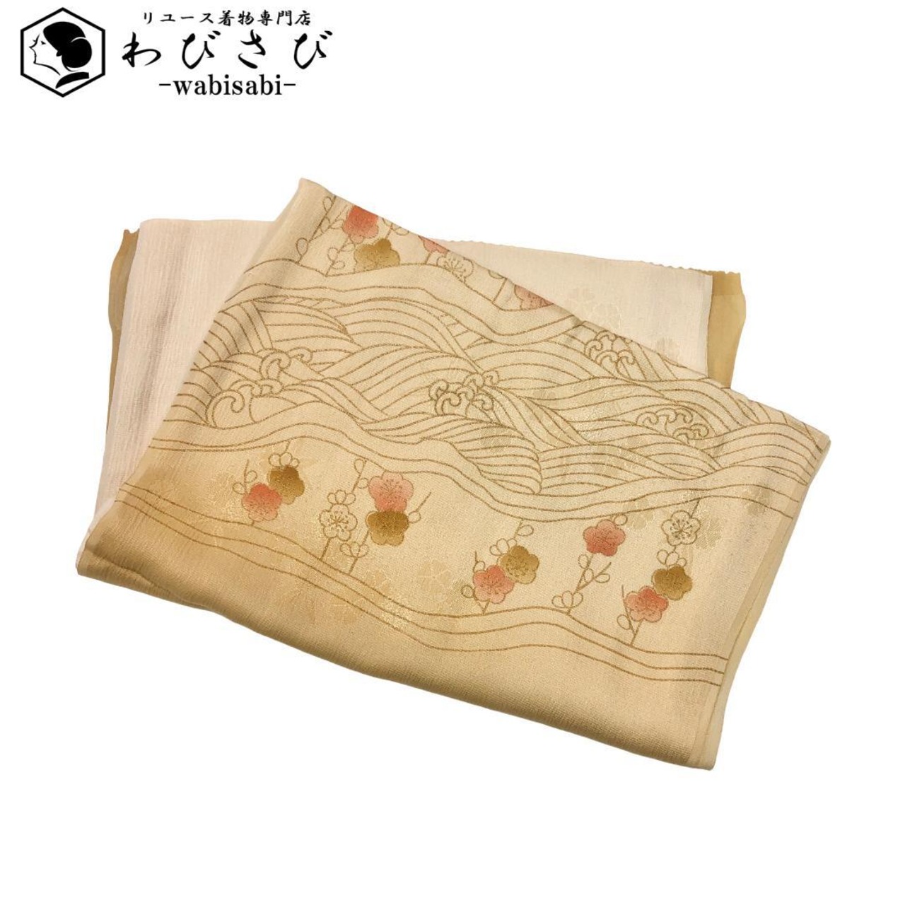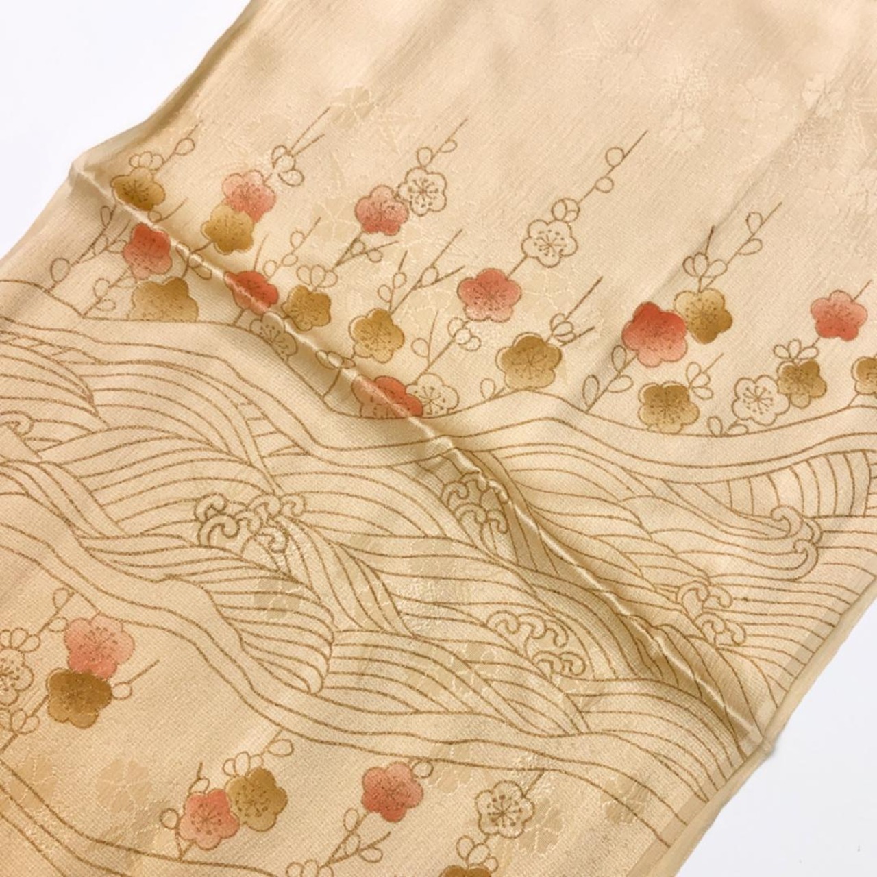尾花色ベースのグラデーションのお色味に波模様、梅の柄裄がデザインされた素敵なお品でございます。