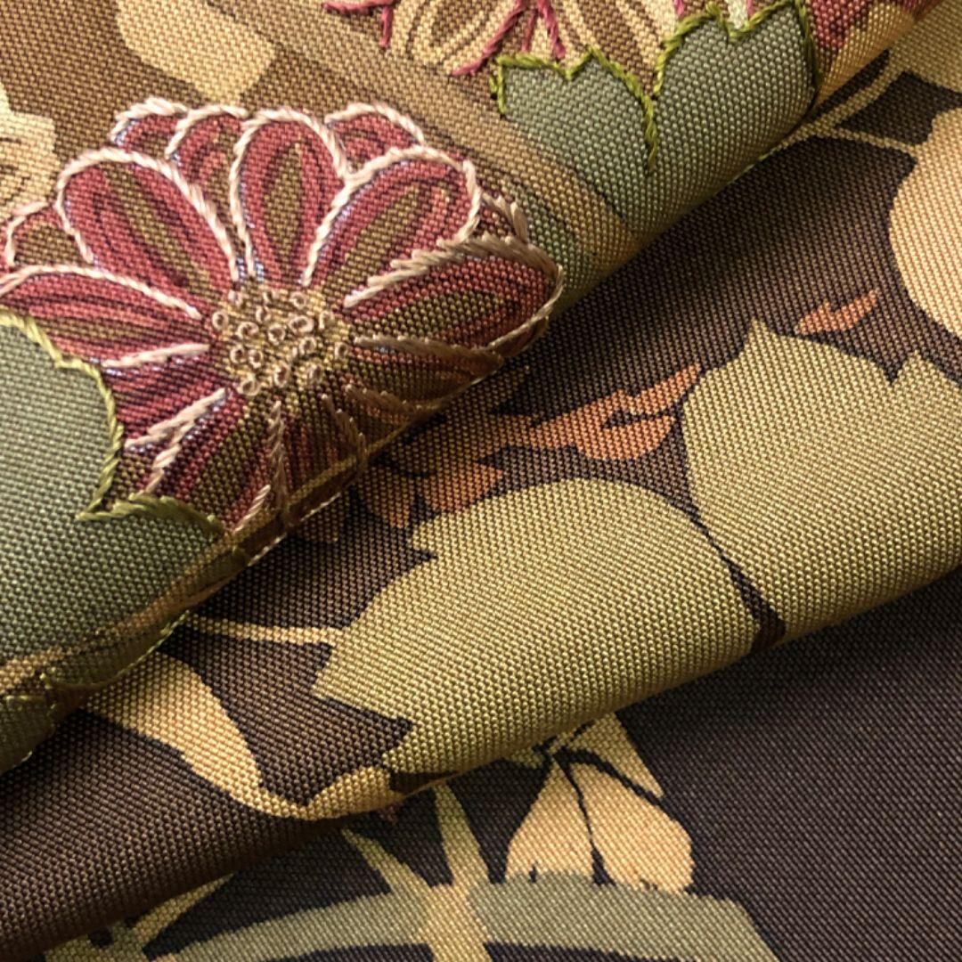 幹色ベースの落ち着いた色彩のグラデーションのお色味の紬地に一部刺繍が使われた流水に花草模様の柄裄がデザインされた雰囲気の良い素敵なお品でございます。