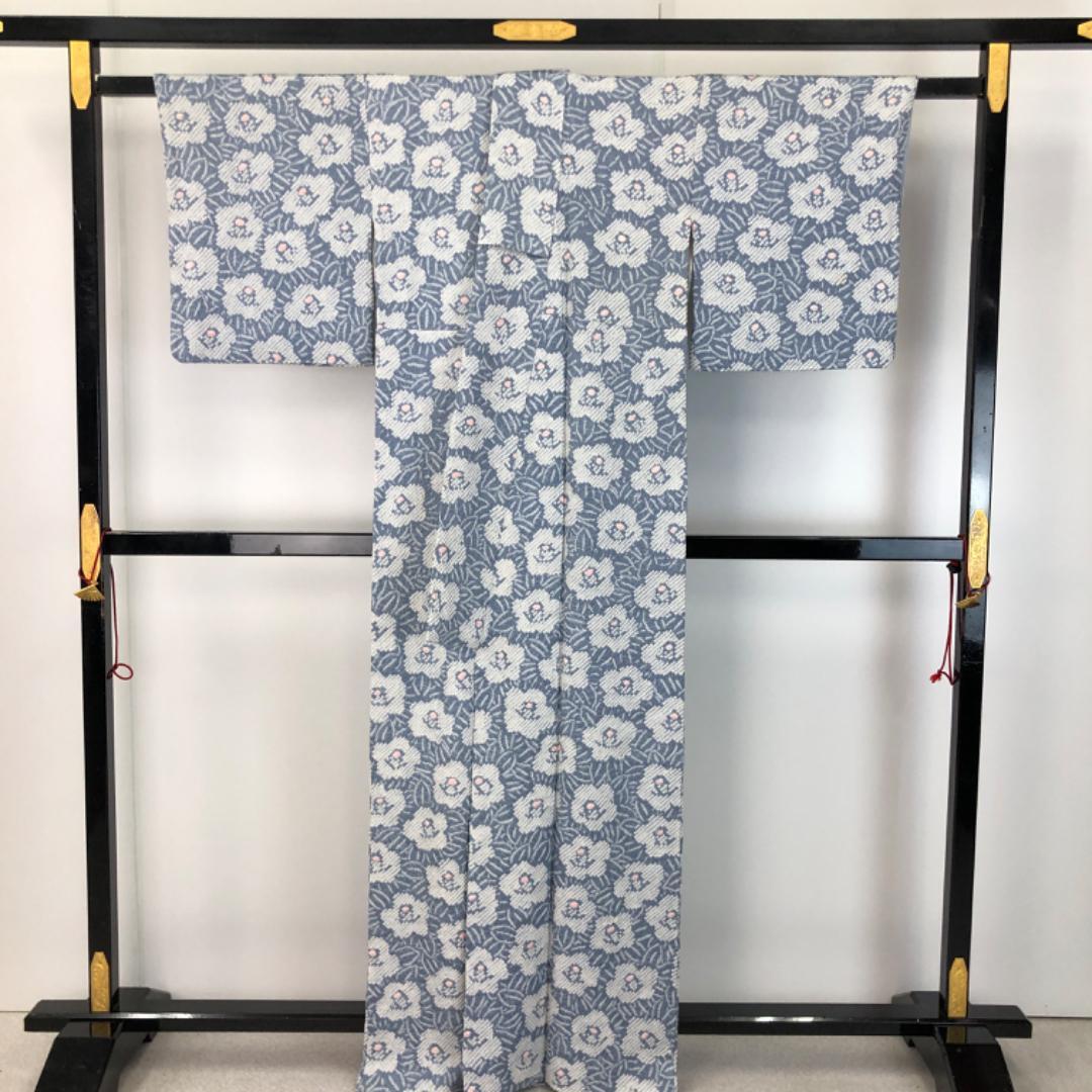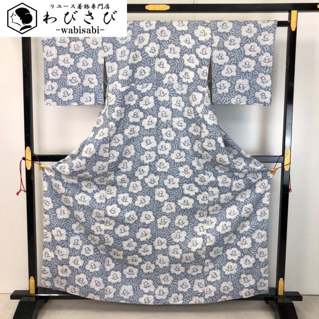 青袋鼠色の雰囲気の良いお色味、椿の花模様がデザインされた色味の良い素敵なお品でございます。