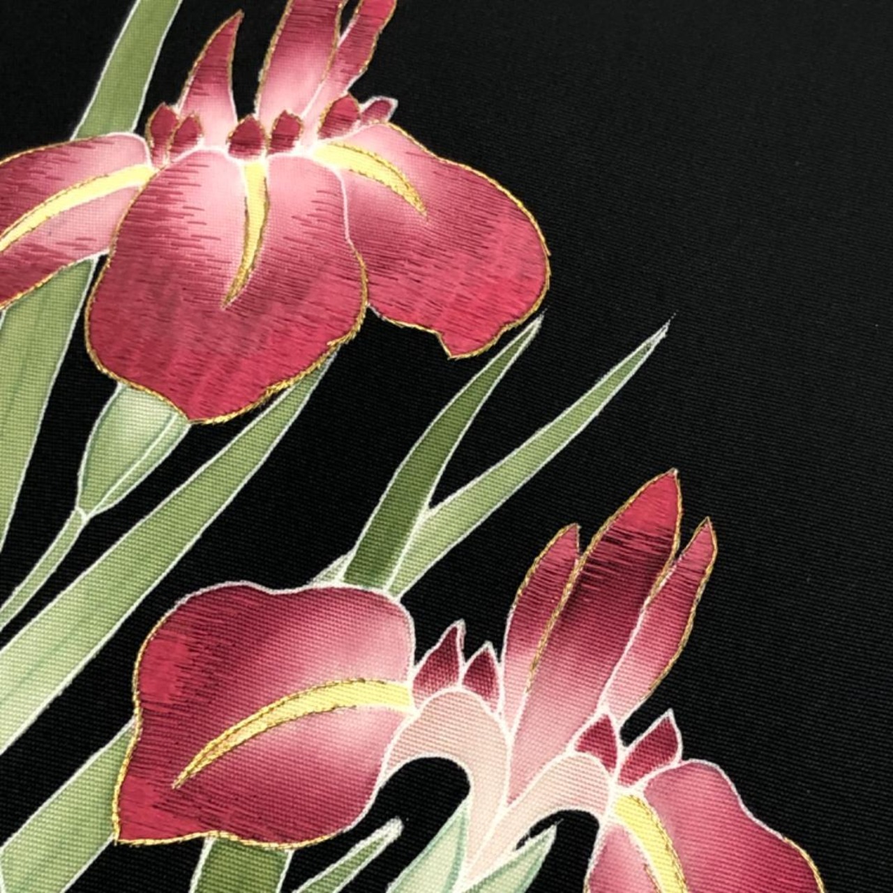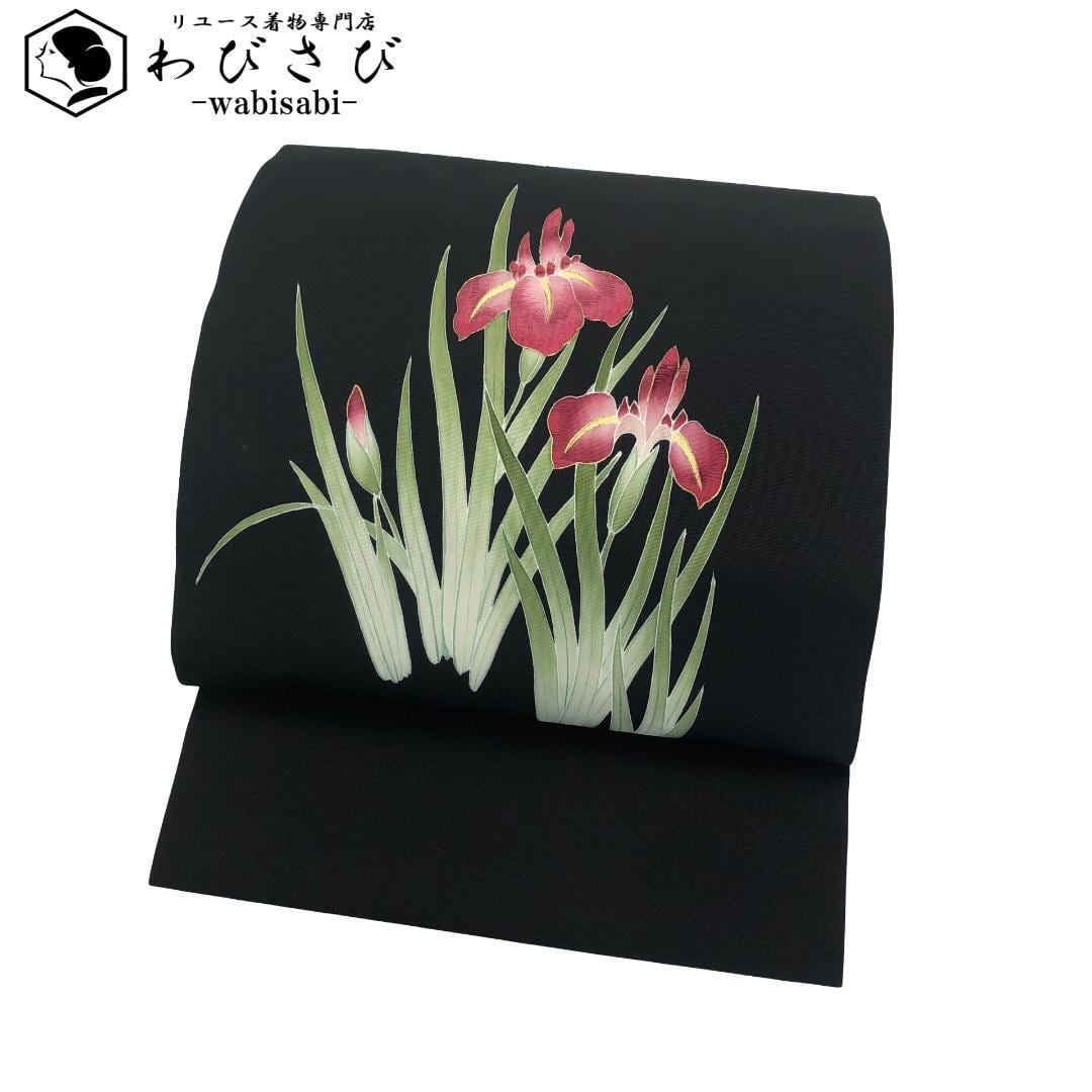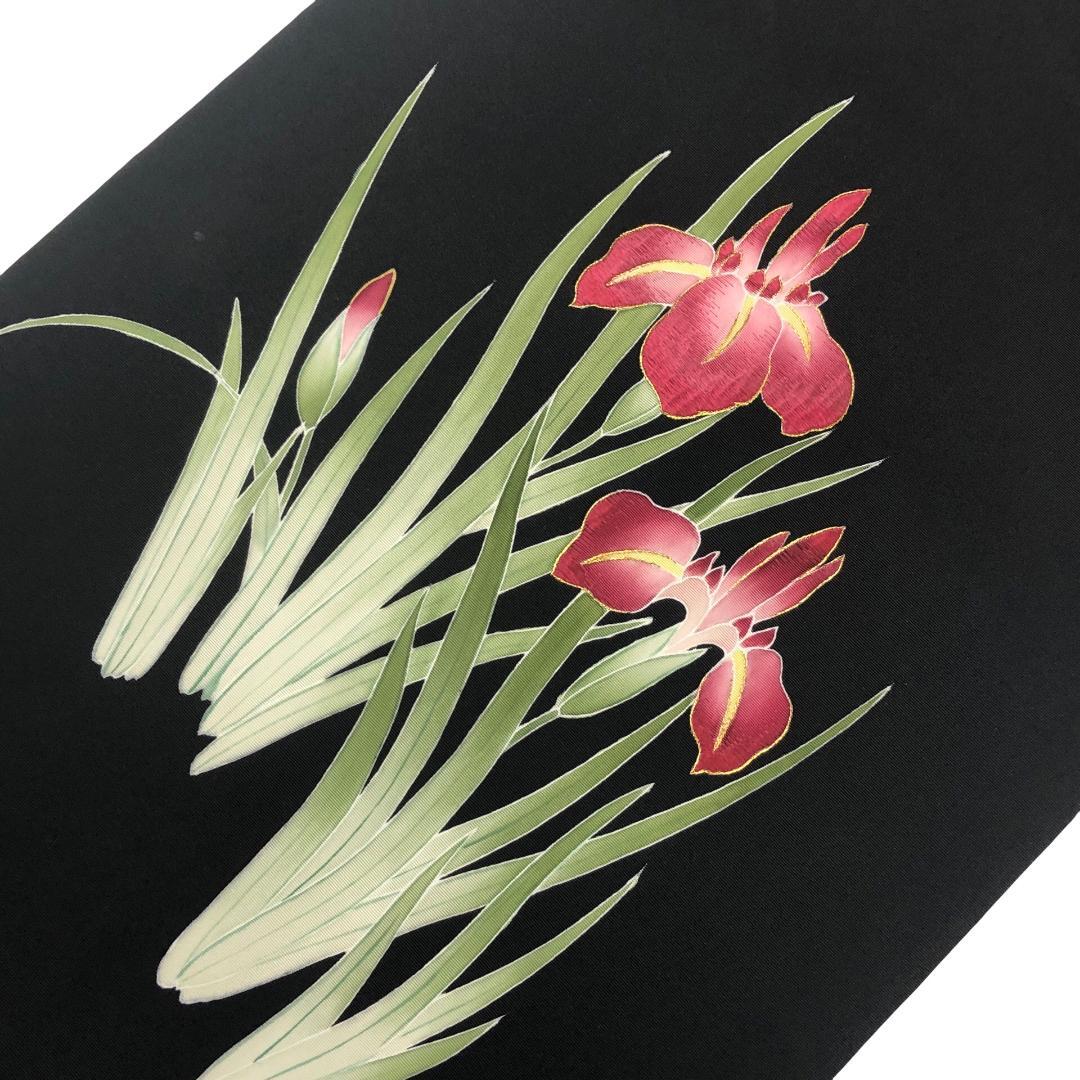 黒色のお色味の塩瀬に菖蒲の花模様がデザインされた素敵なお品でございます。