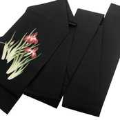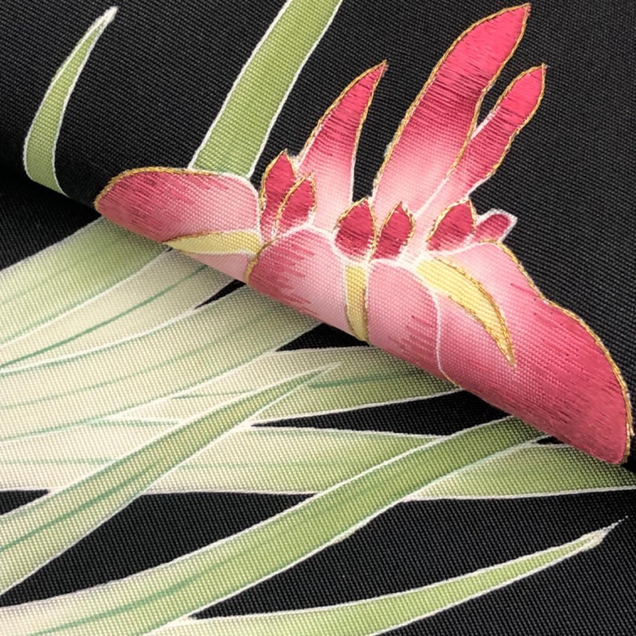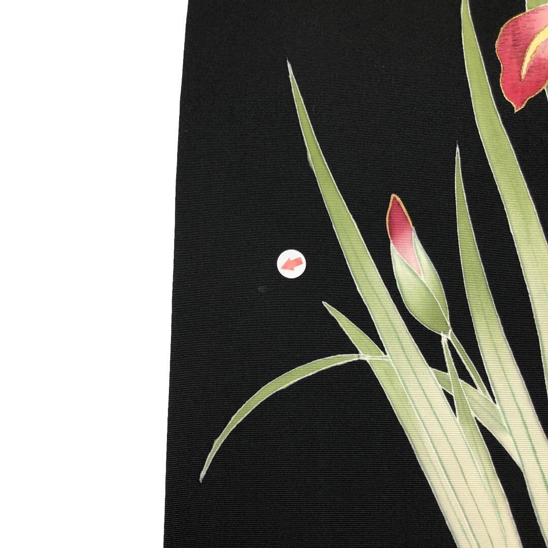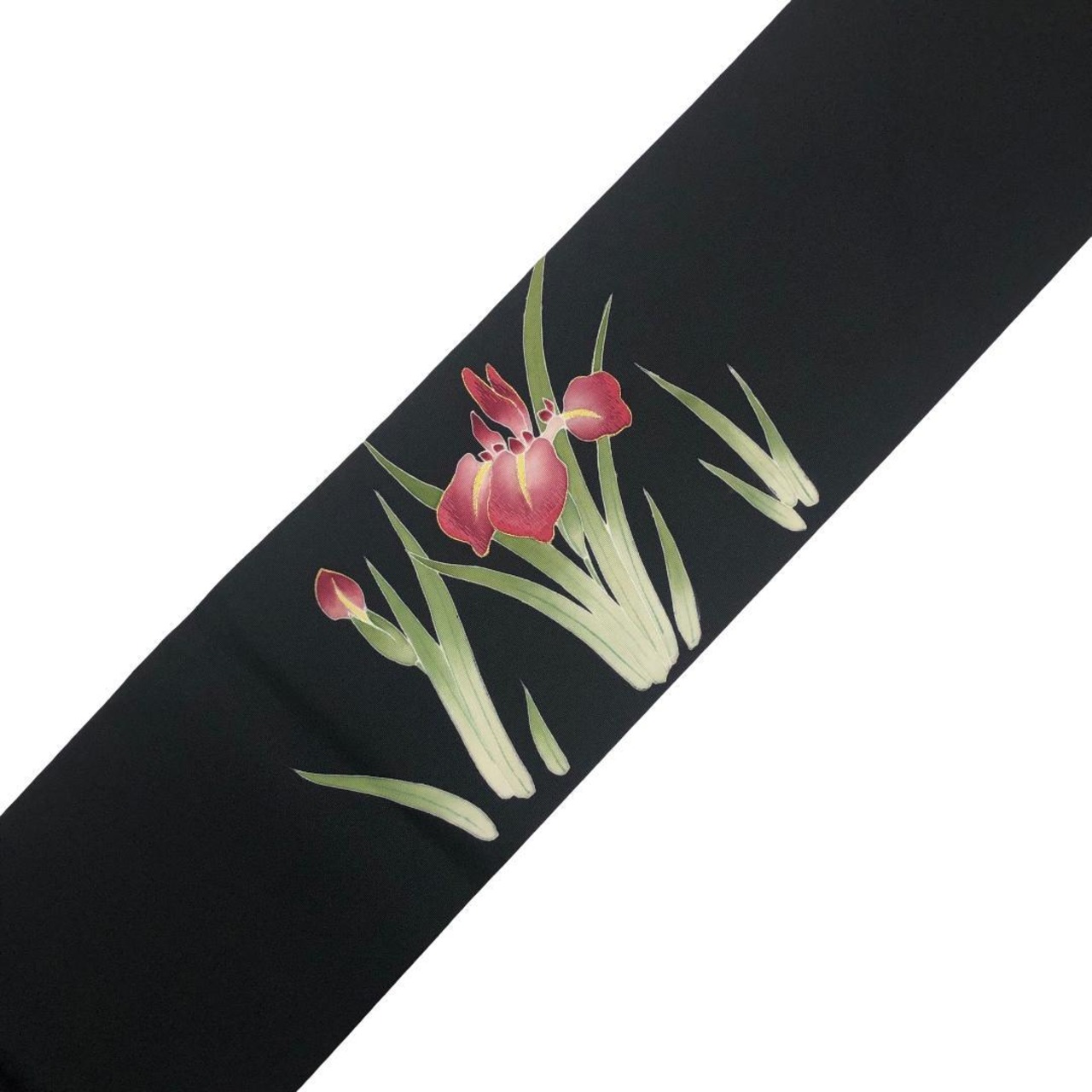 黒色のお色味の塩瀬に菖蒲の花模様がデザインされた素敵なお品でございます。