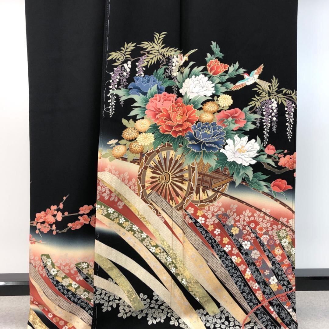 刺繍、金駒が使われた色鮮やかな花車、熨斗などの柄裄がデザインされた素敵なお品でございます。