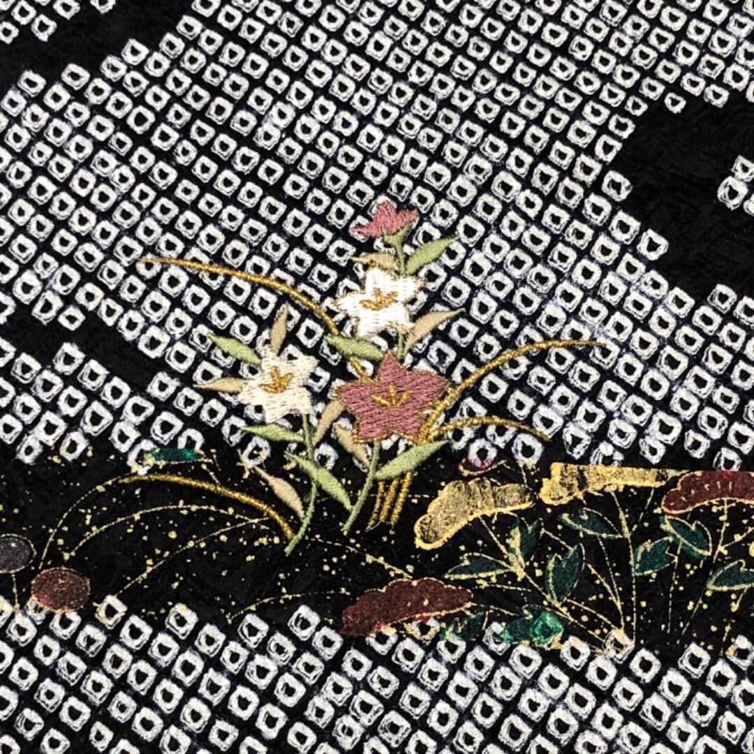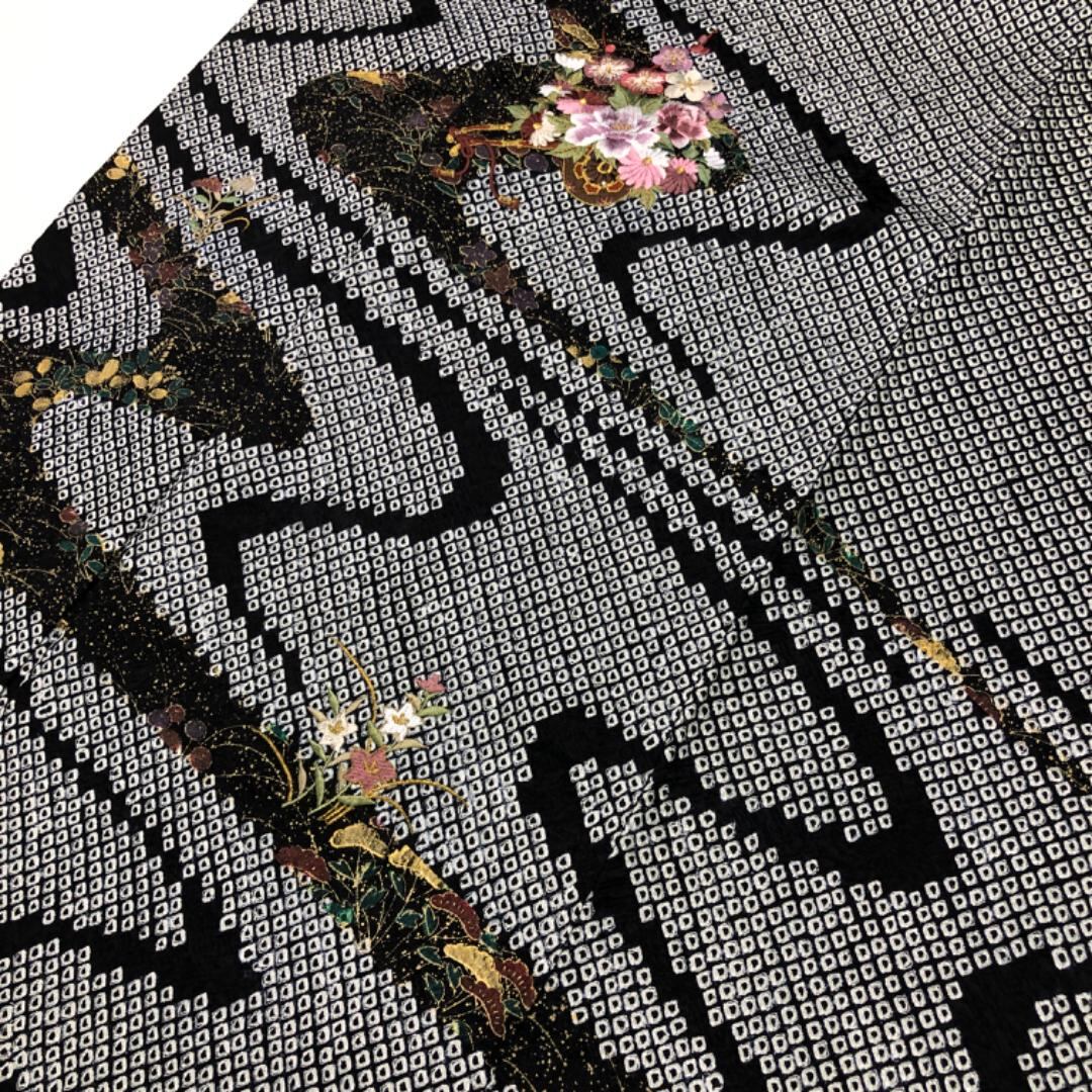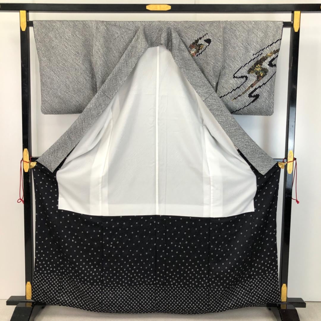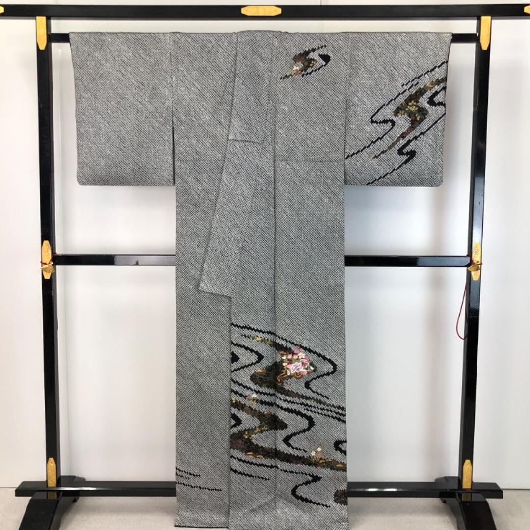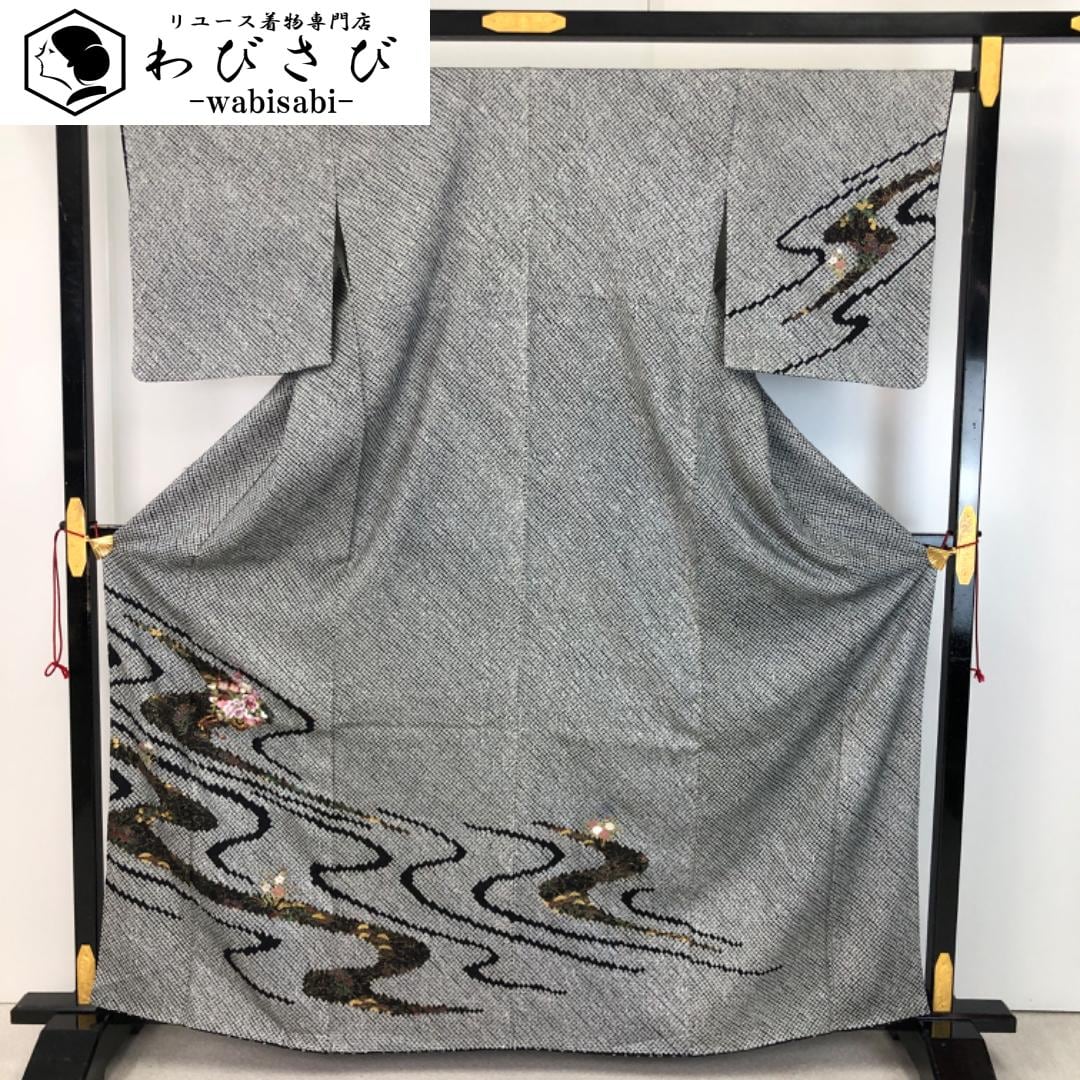 モノトーンのお色味の総絞りに金彩、刺繍の花車模様、流水などの柄裄がデザインされた雰囲気の良い素敵なお品でございます。
