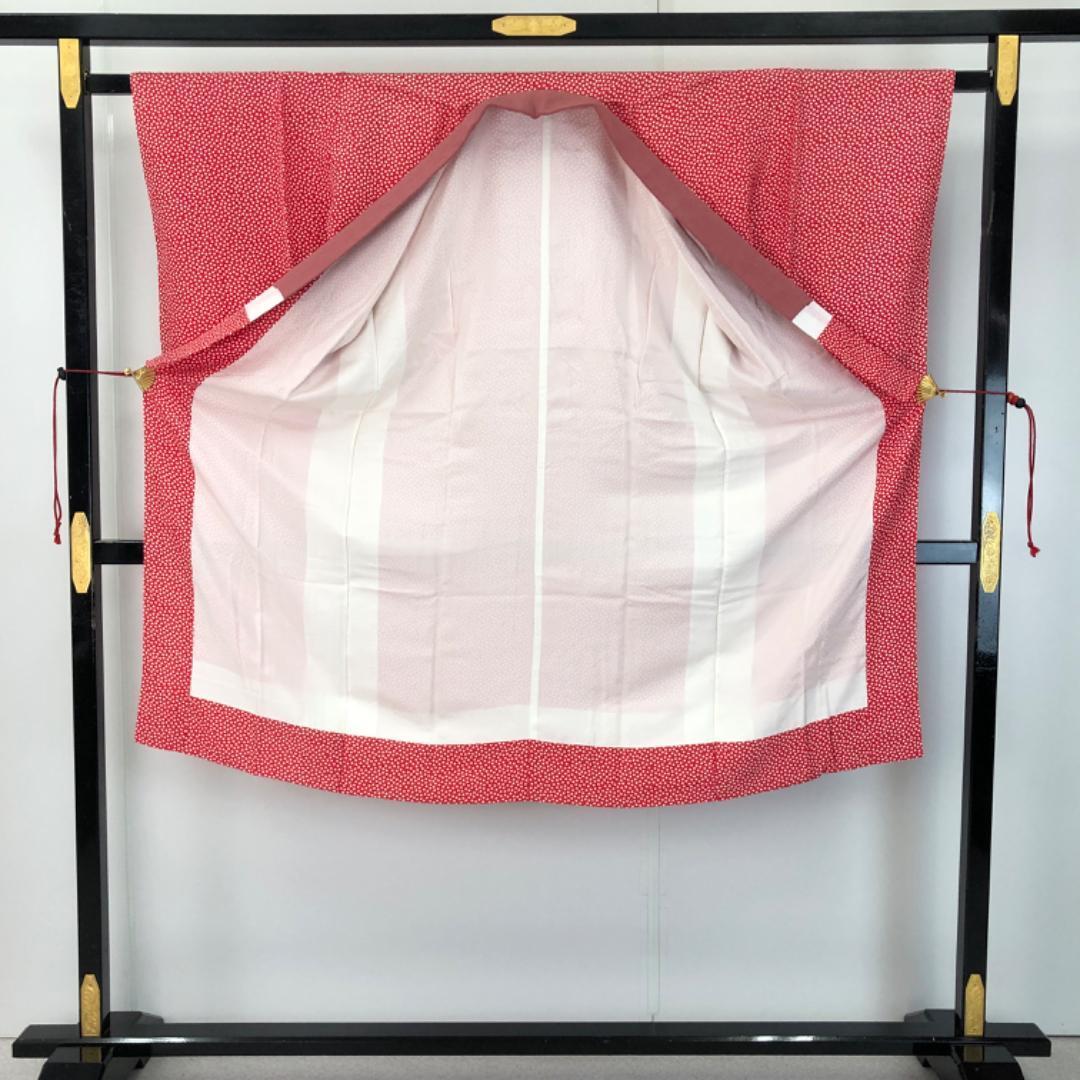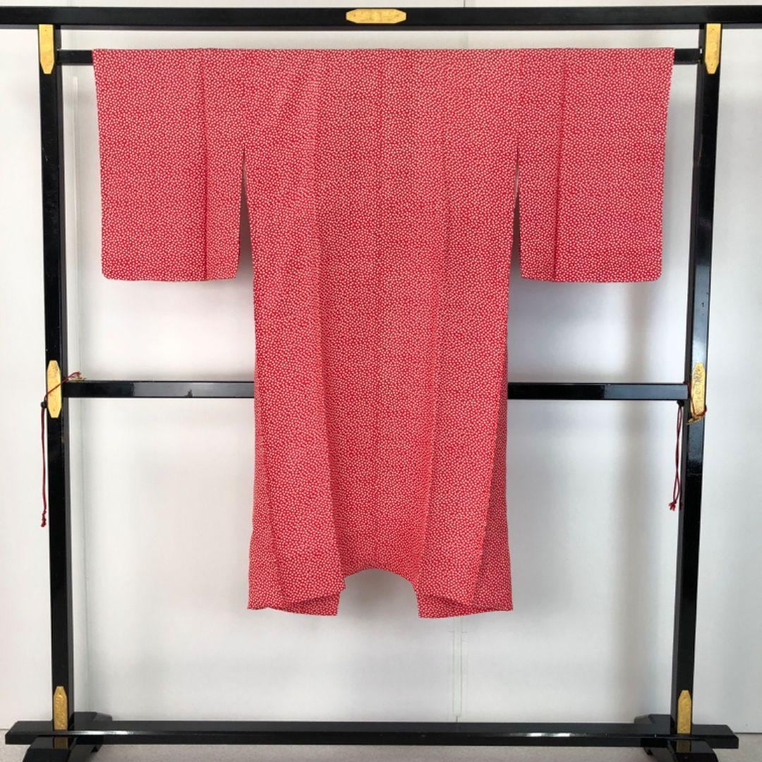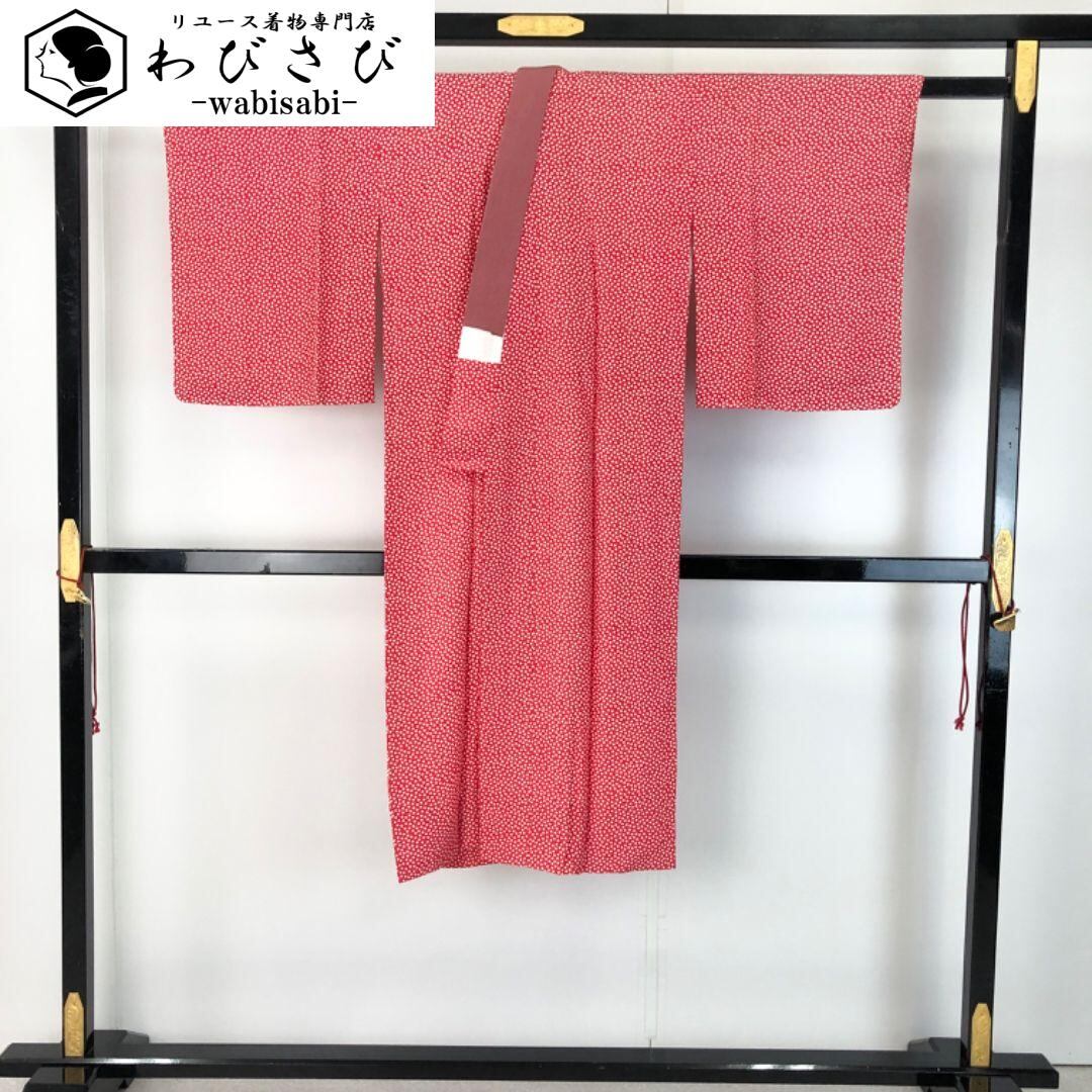 赤色のお色味に小さな花柄模様がデザインされた素敵な柄裄のお品でございます。