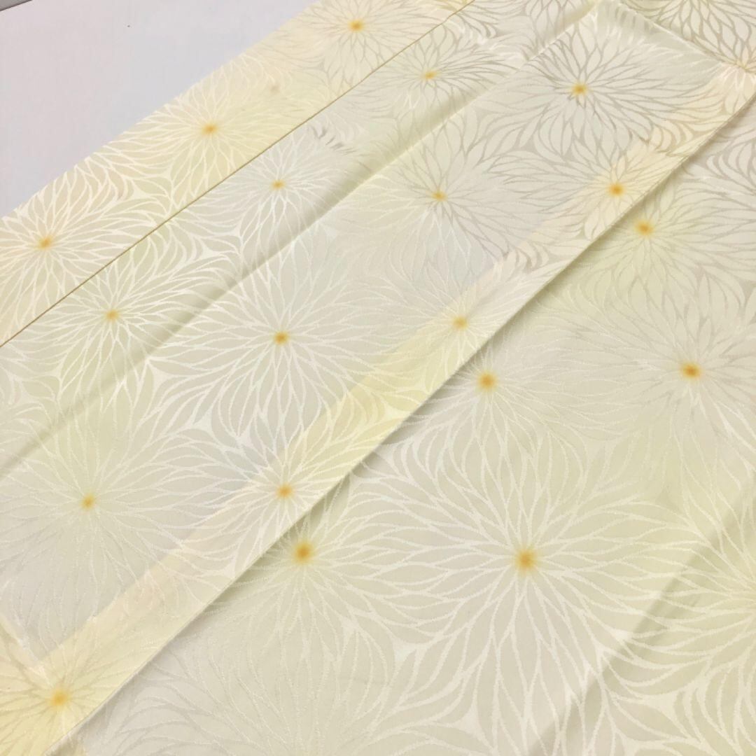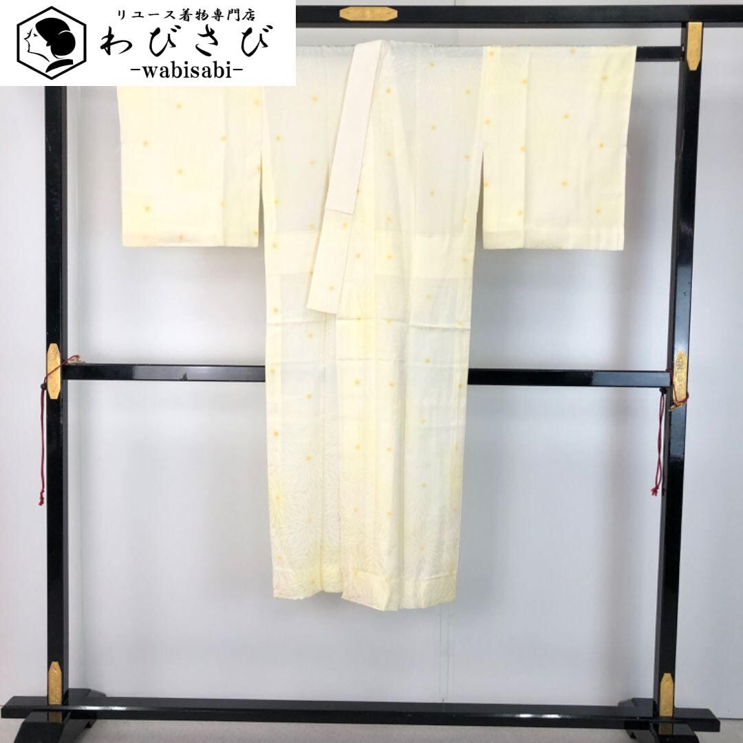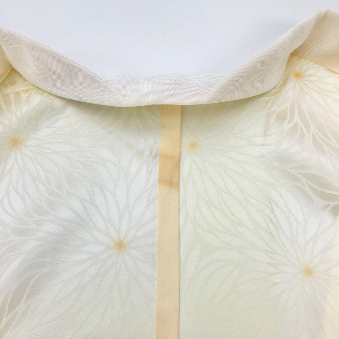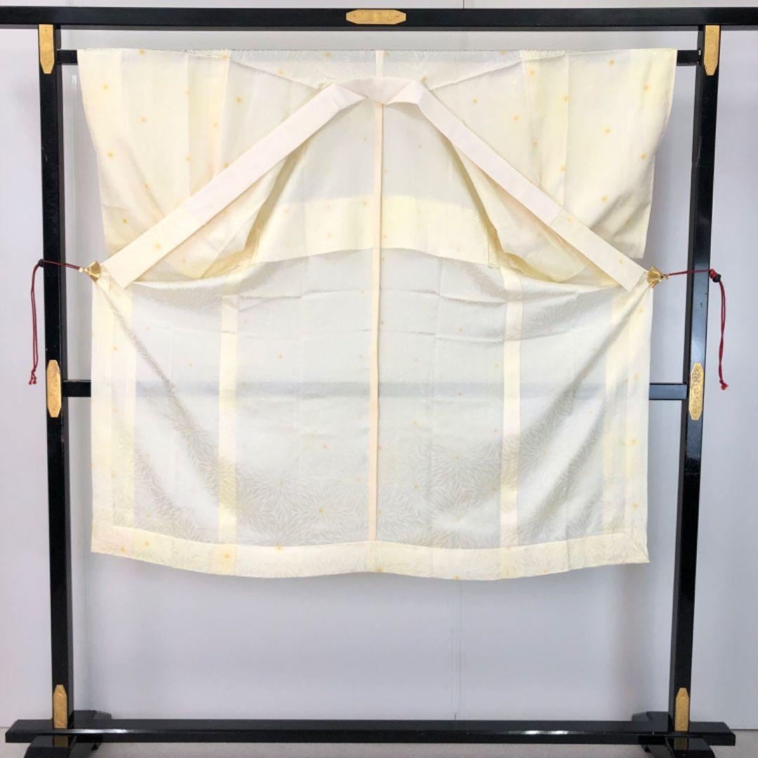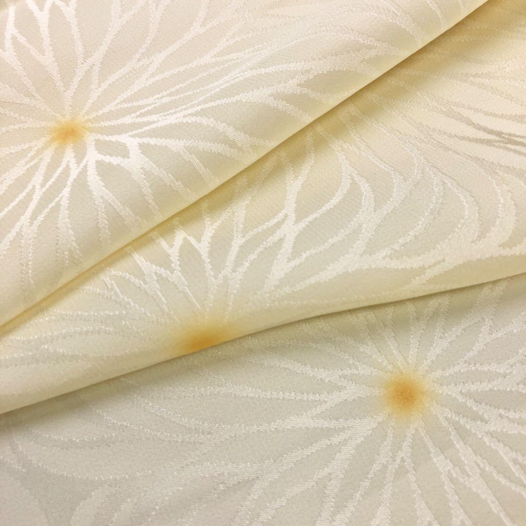 薄淡黄色ほお色味に菊の花模様の柄裄がデザインされた素敵なお品でございます。