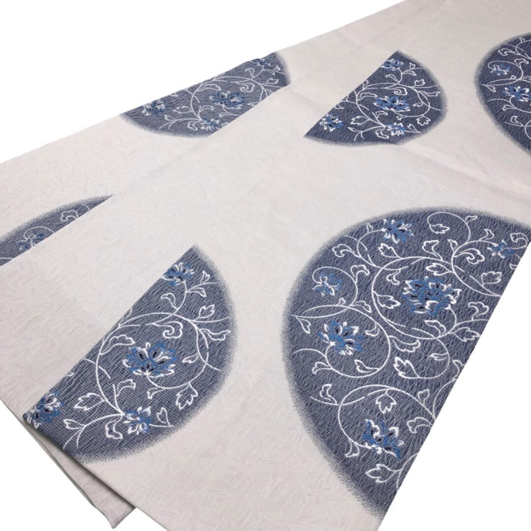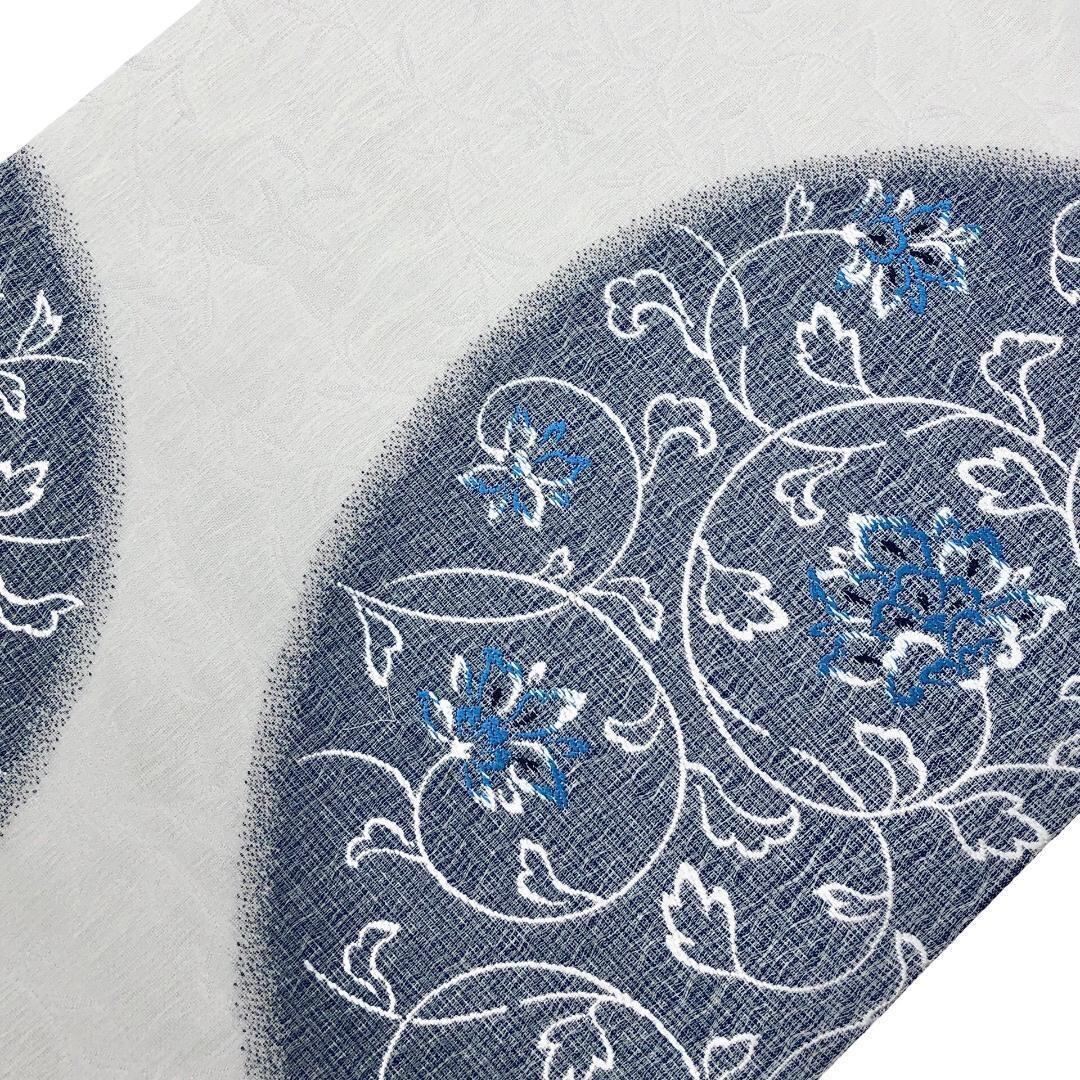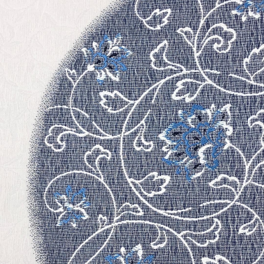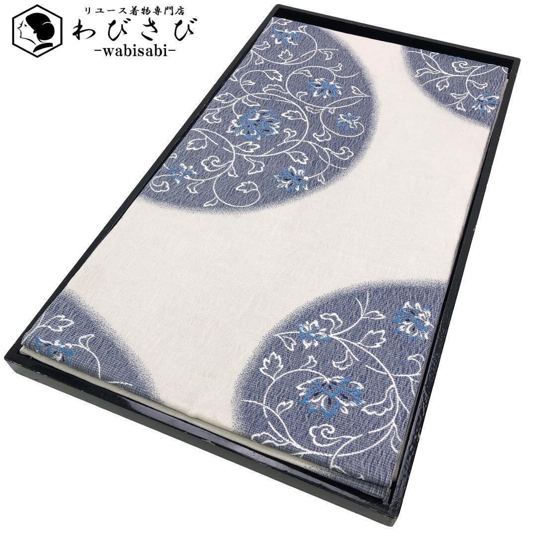 胡粉色の上品なお色味に阿波藍染の美しい藍色でデザインされた丸の中に雰囲気の良い花唐草模様の柄行が雰囲気の良い素敵なお品でございます。