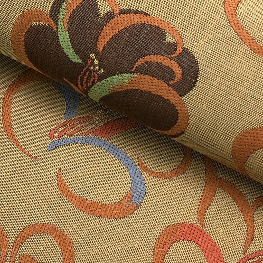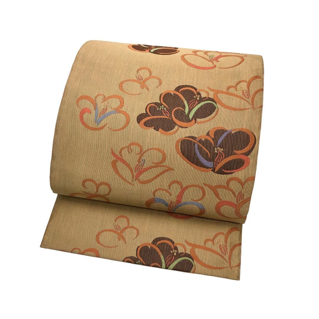 袋帯 椿の花柄模様 金糸 麦藁色 O-5626 着物 きもの kimono 和服 和装 中古 リサイクル着物 【送料無料】