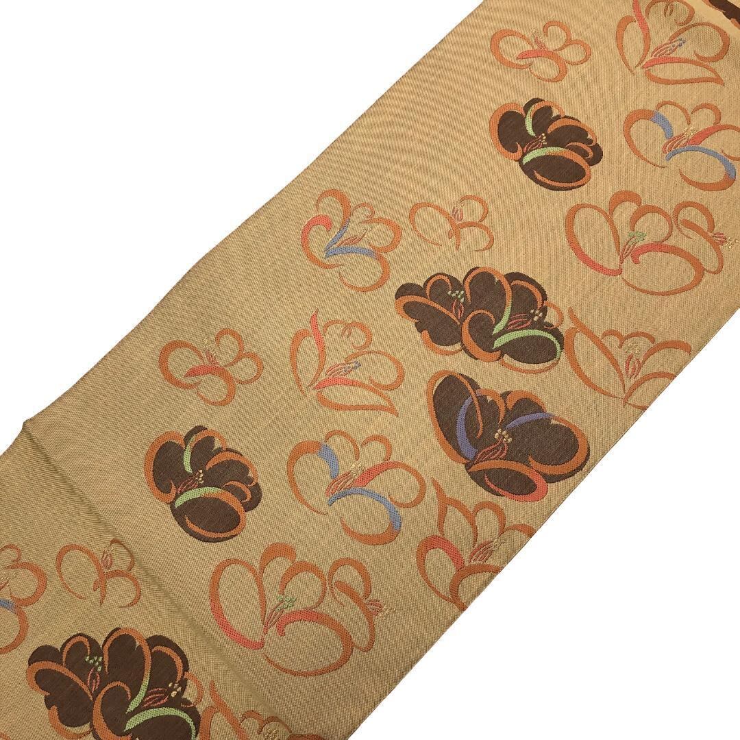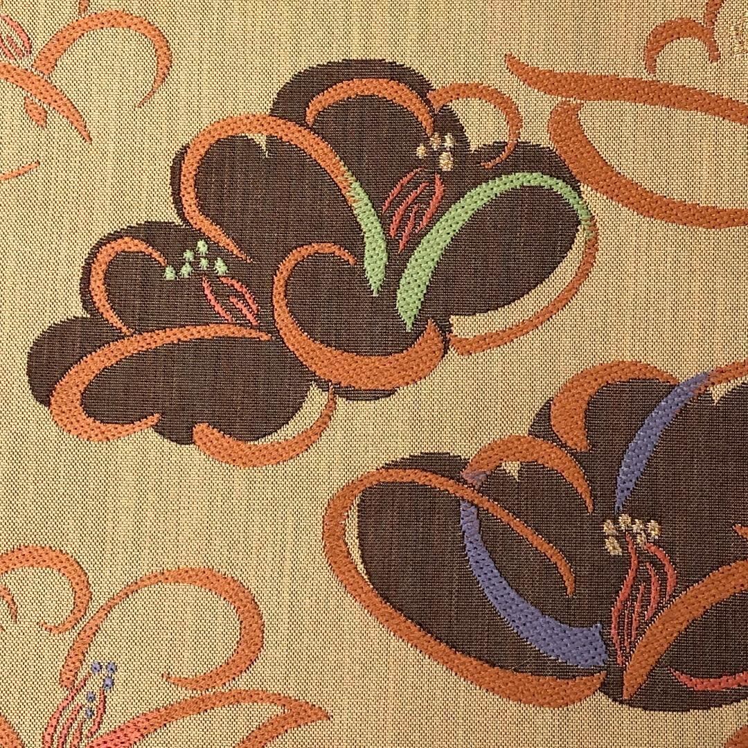 麦藁色のお色味に椿の花柄模様がデザインされた雰囲気の良い素敵な柄裄のお品でございます。
