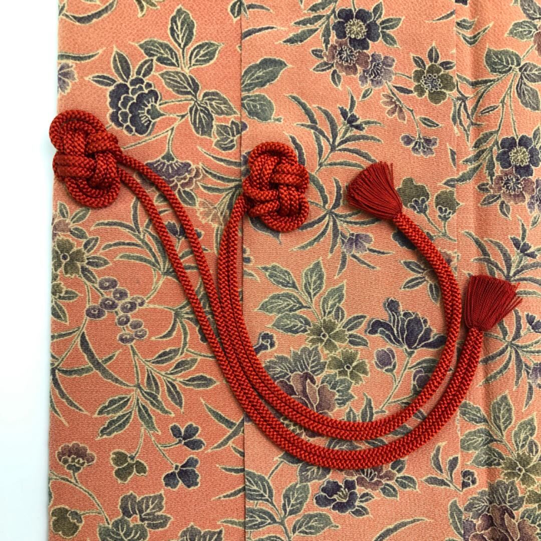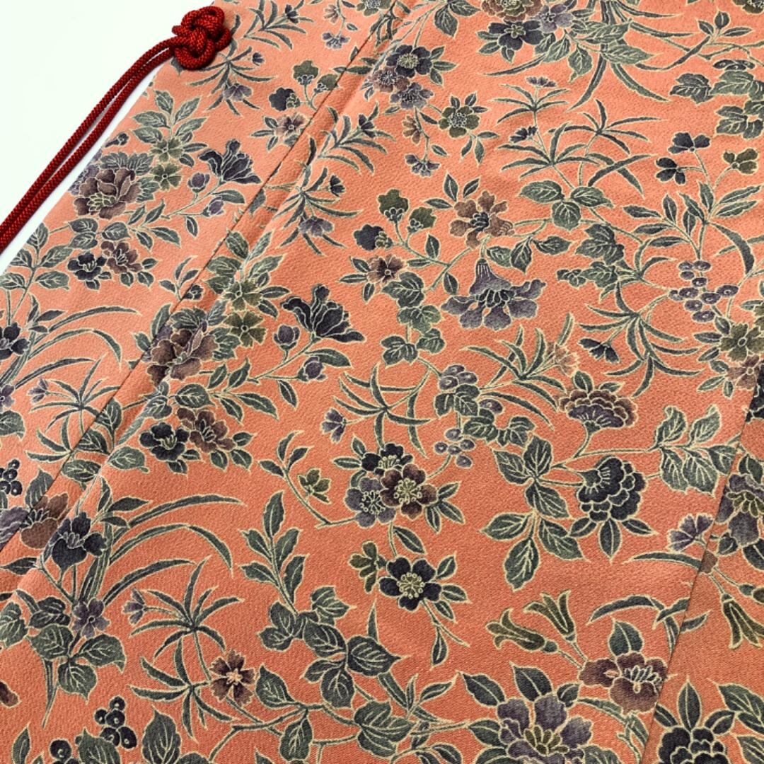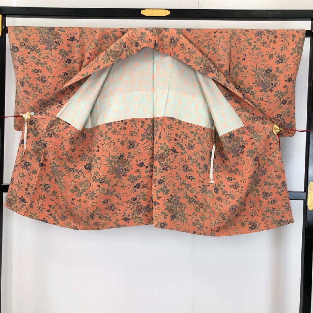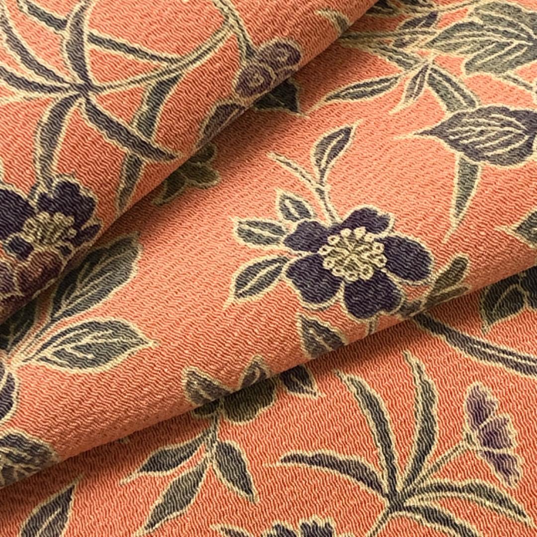 珊瑚色の落ち着きのあるお色味の縮緬地に花柄模様がデザインされた雰囲気の良い素敵なお品でございます。