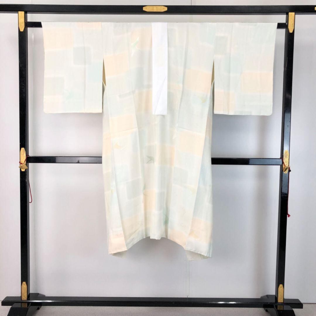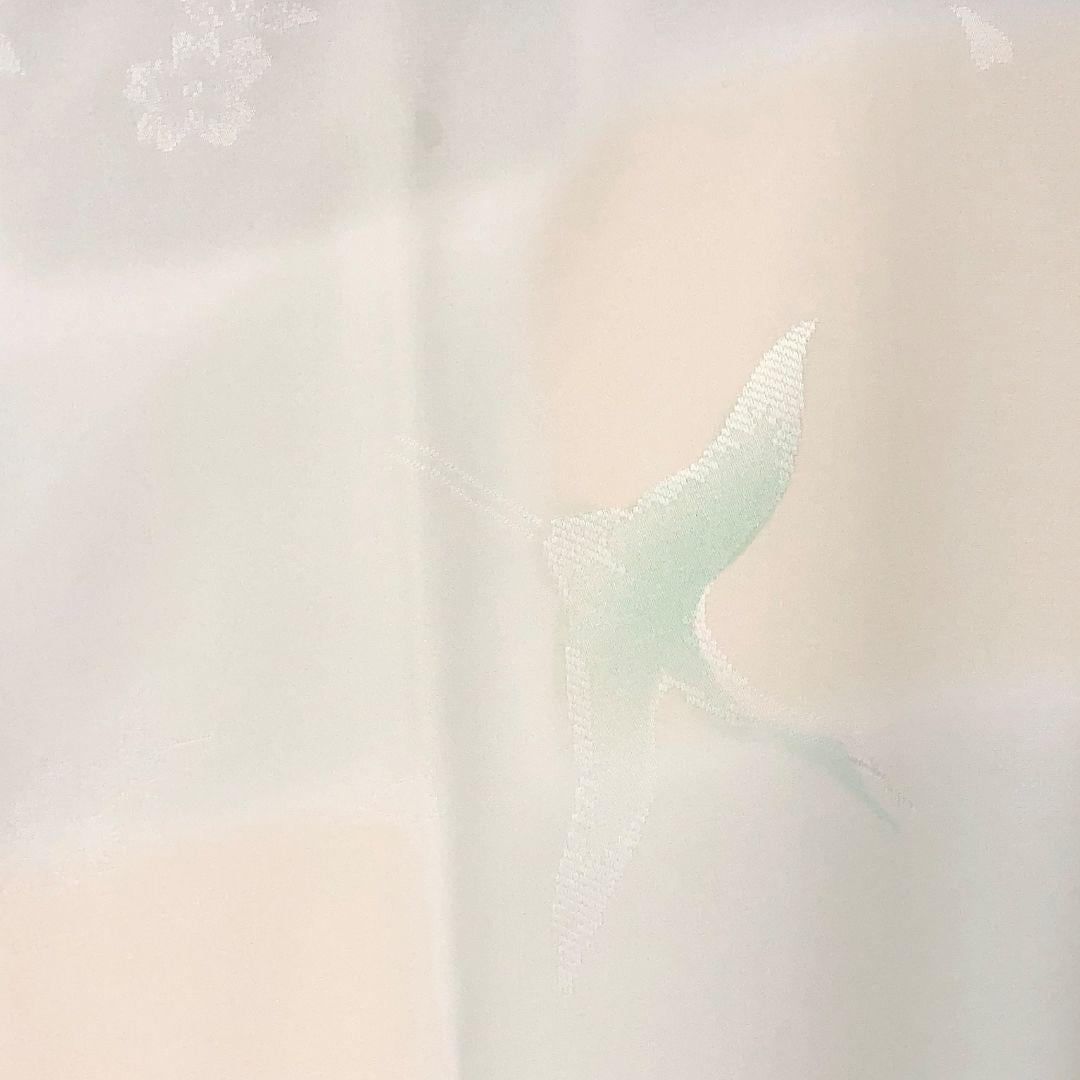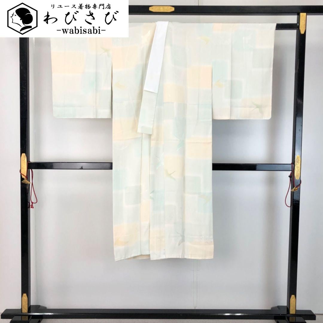 卯の花色ベースのお色味に鶴、花模様の柄裄がデザインされた素敵なお品でございます。
