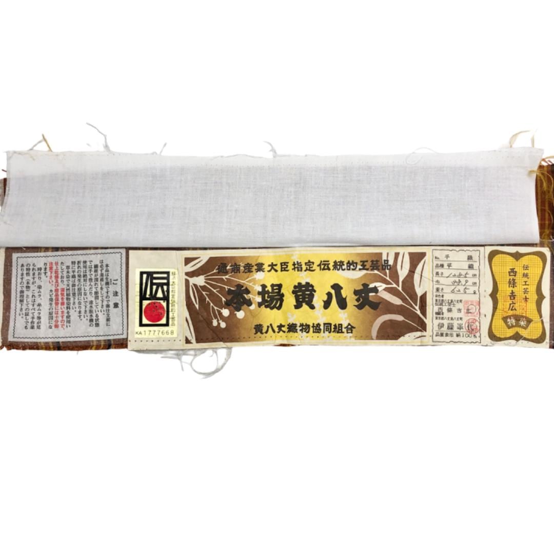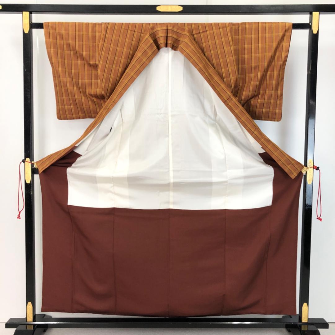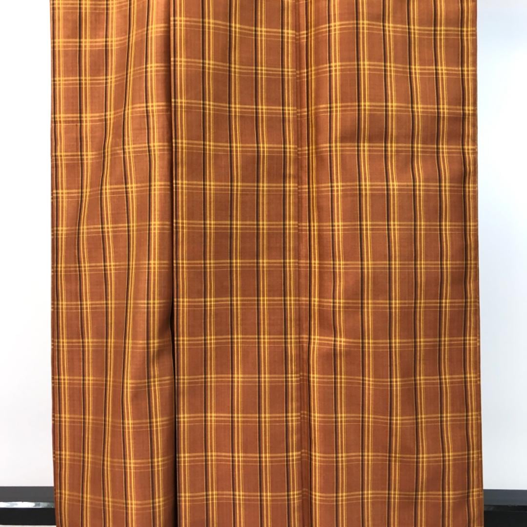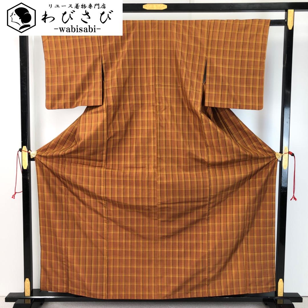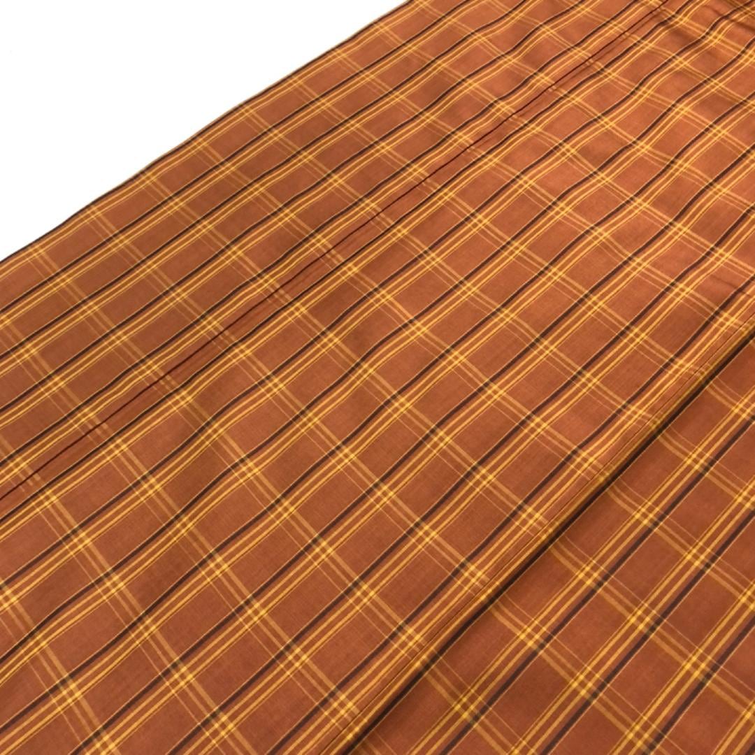 本場黄八丈 平織 証紙付 伝統工芸士 西條吉広 格子柄 濃柿色 K-5437 着物 きもの kimono 和服 和装 中古 リサイクル着物 【送料無料】