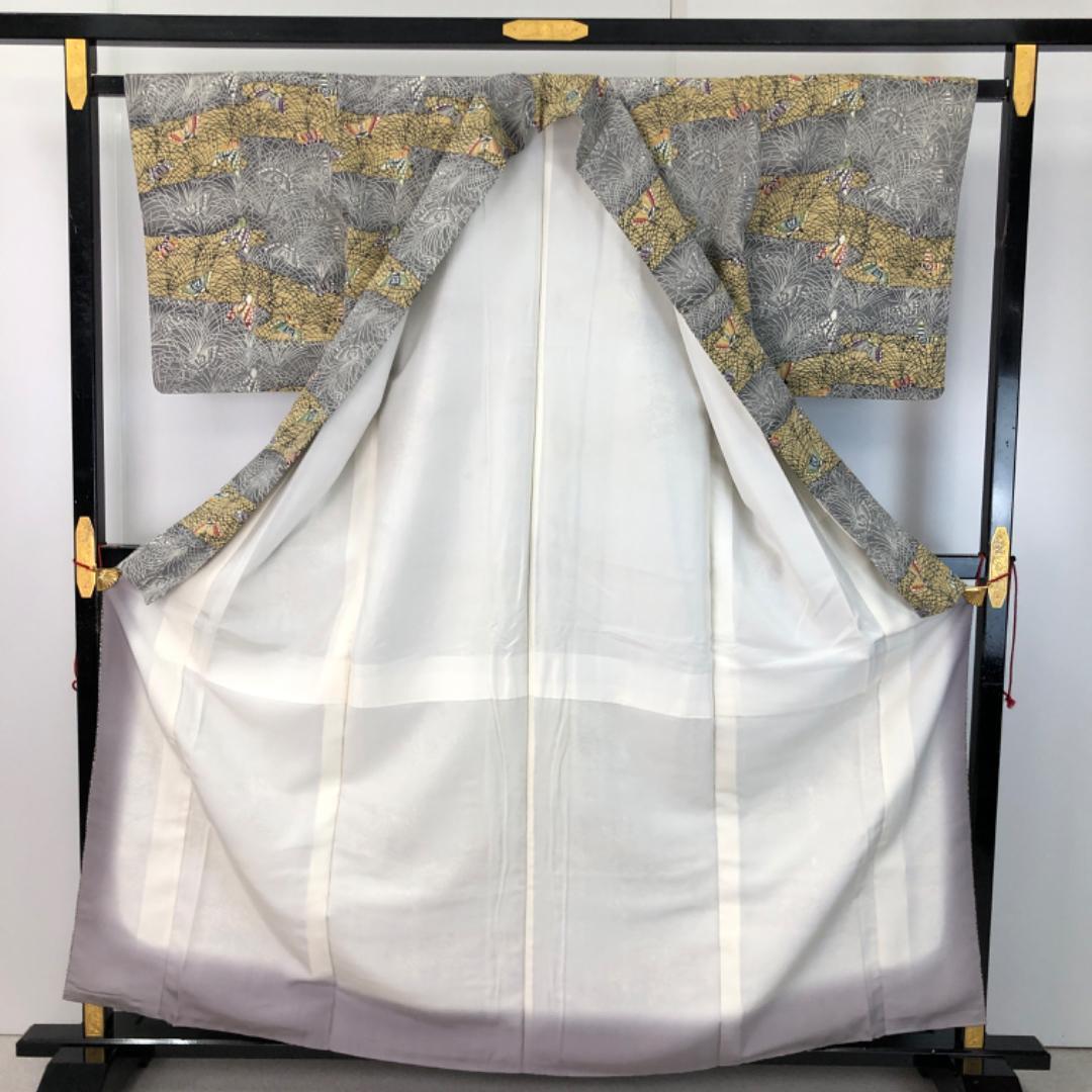 灰色ベースのお色味の濱縮緬に蝶々などの色彩の美しい雰囲気の良い紅型の柄裄がデザインされた素敵なお品でございます。