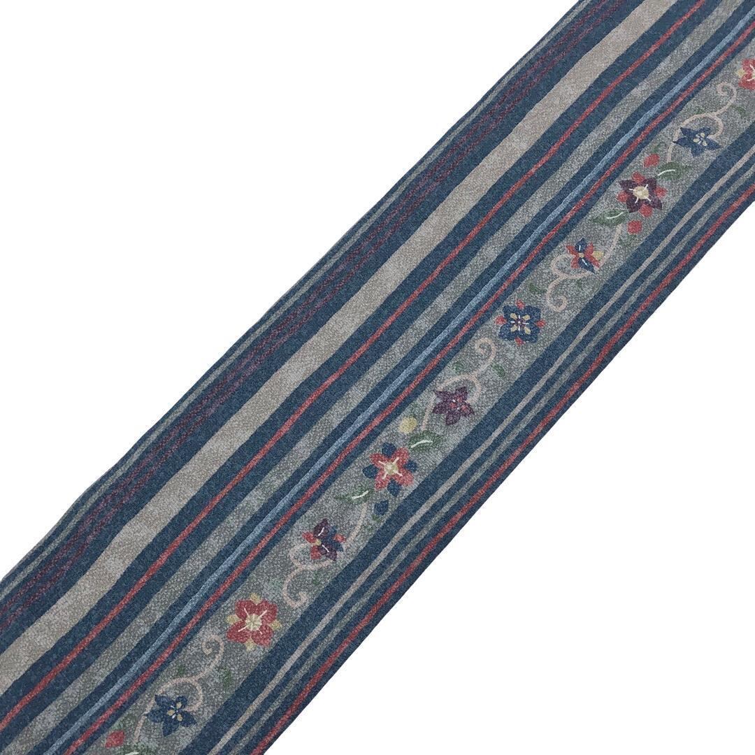 濃青袋鼠色の縮緬地に縦縞に花柄模様がデザインされた雰囲気の良い素敵な柄裄のお品でございます。