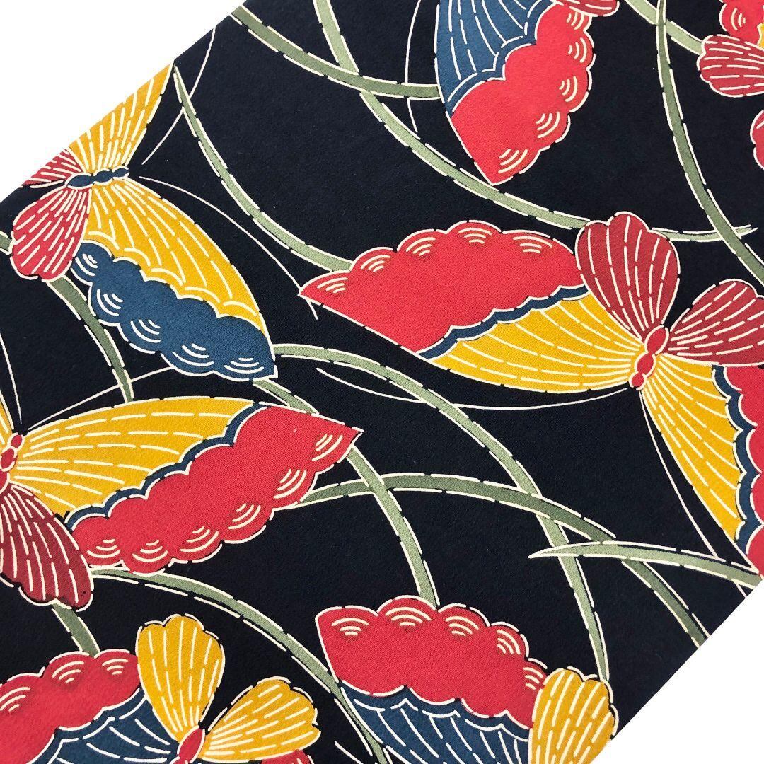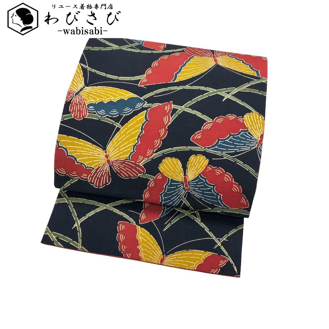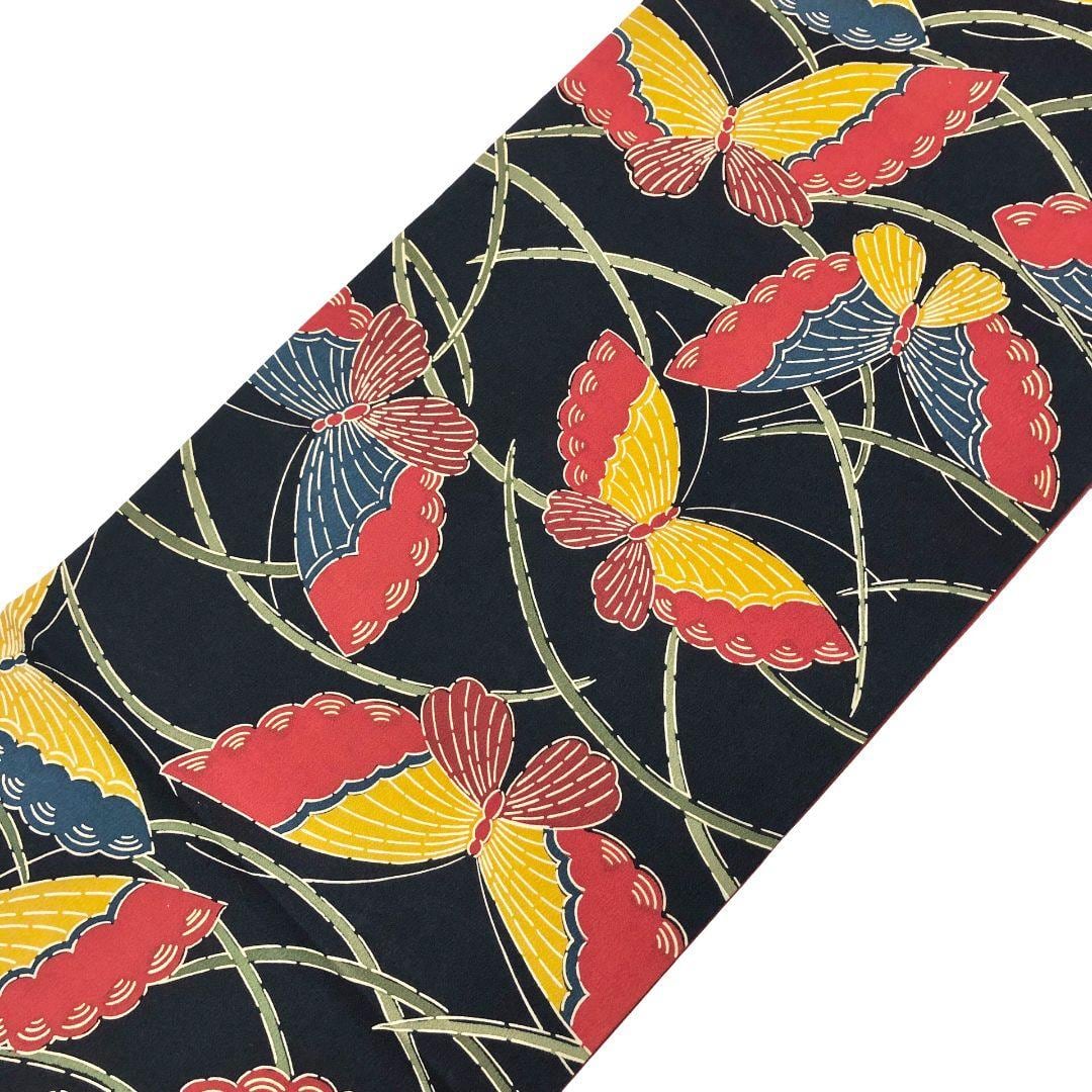 濃紺色のお色味に型染の色鮮やかな蝶々の柄行がデザインされた素敵なお品でございます。