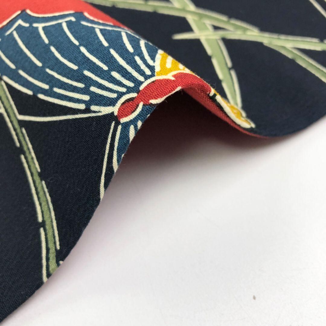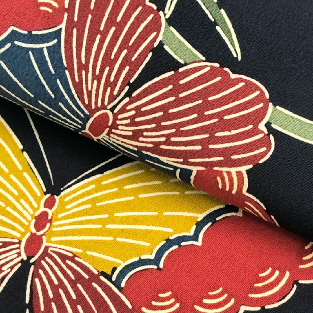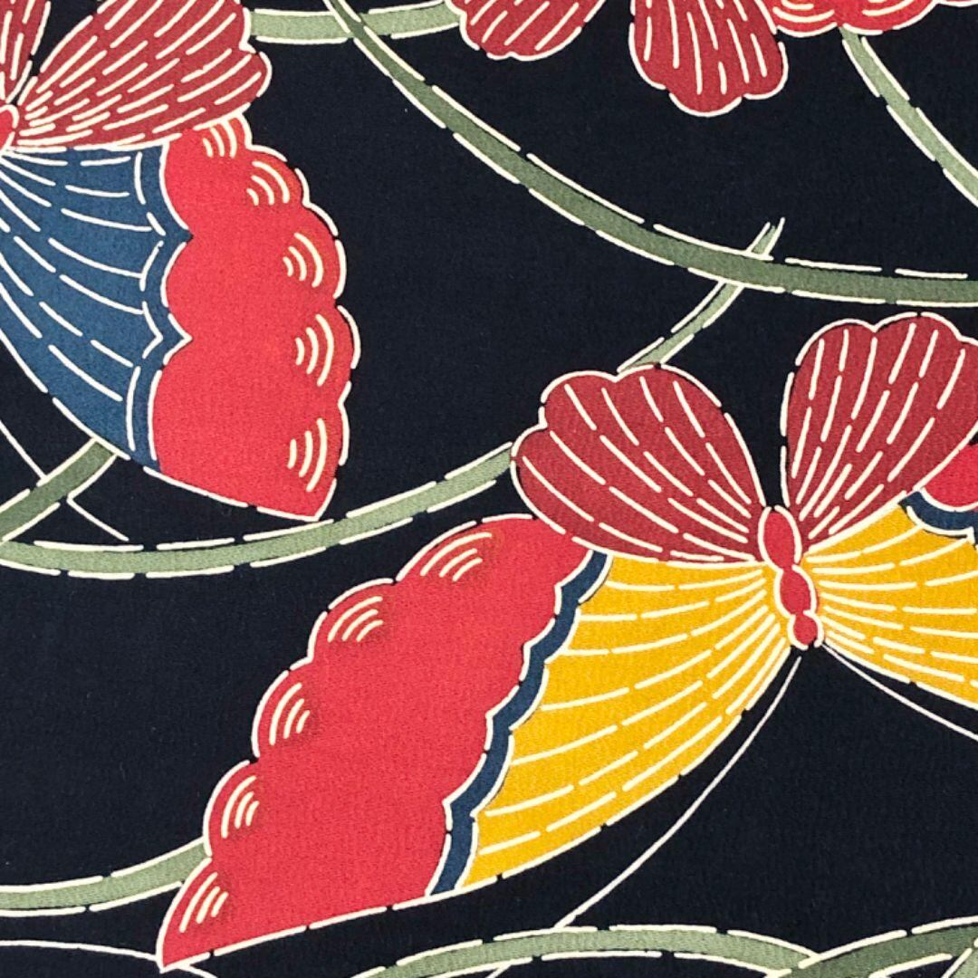 濃紺色のお色味に型染の色鮮やかな蝶々の柄行がデザインされた素敵なお品でございます。