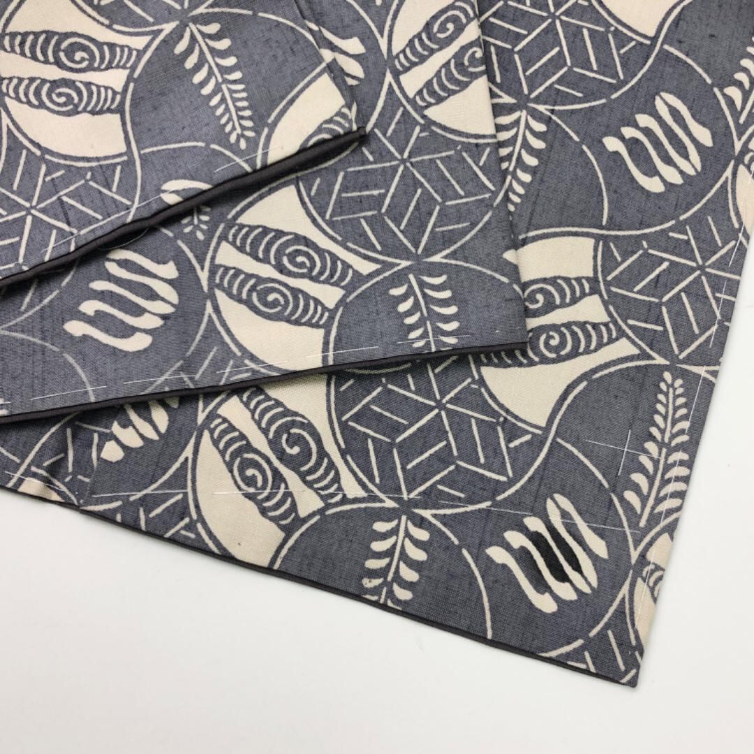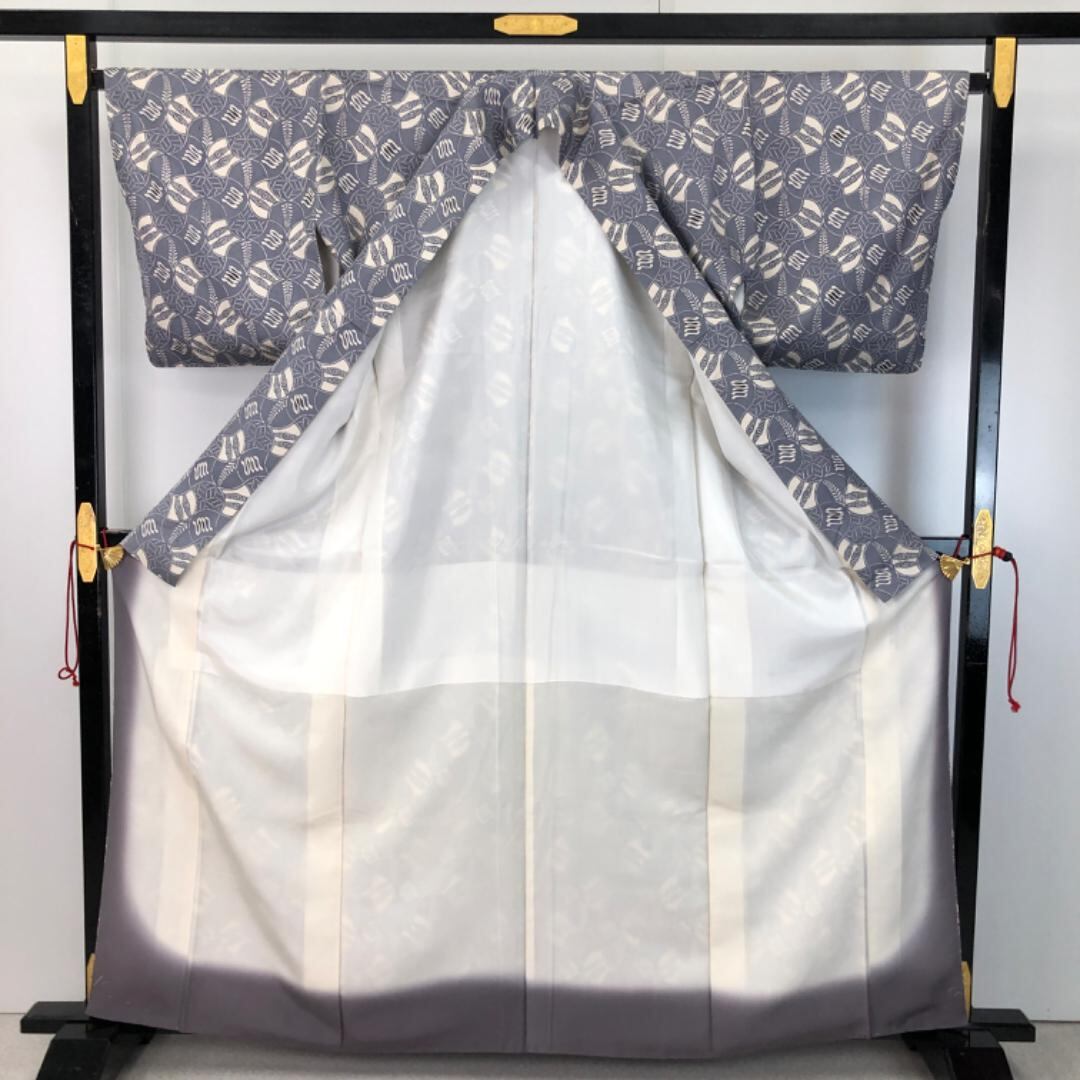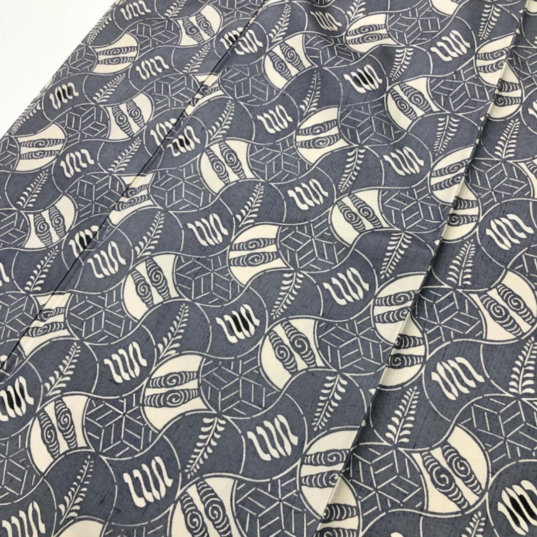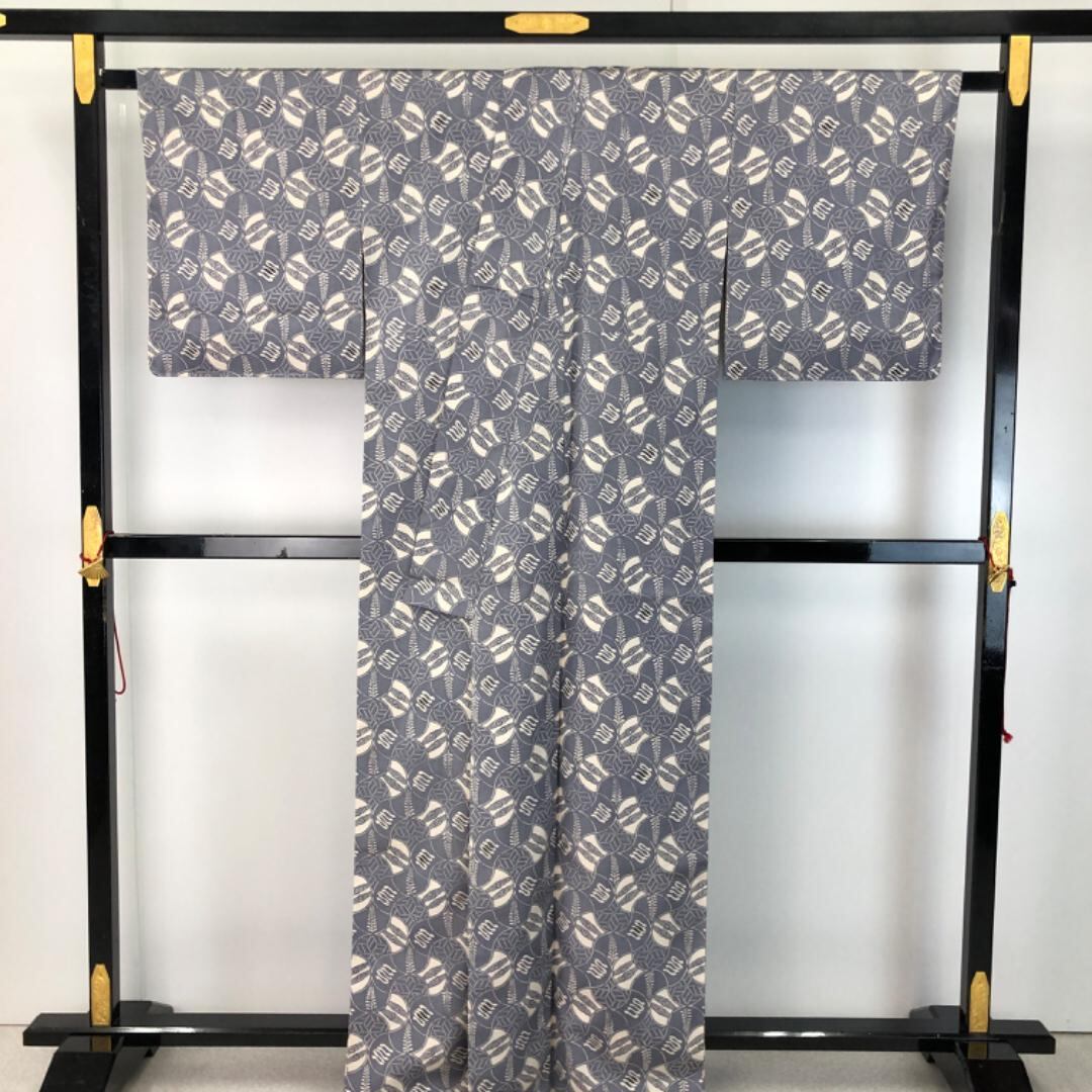 薄藍錆色のお色味の手触りの良い紬、雰囲気の良い抽象模様の柄裄がデザインされた素敵なお品でございます。