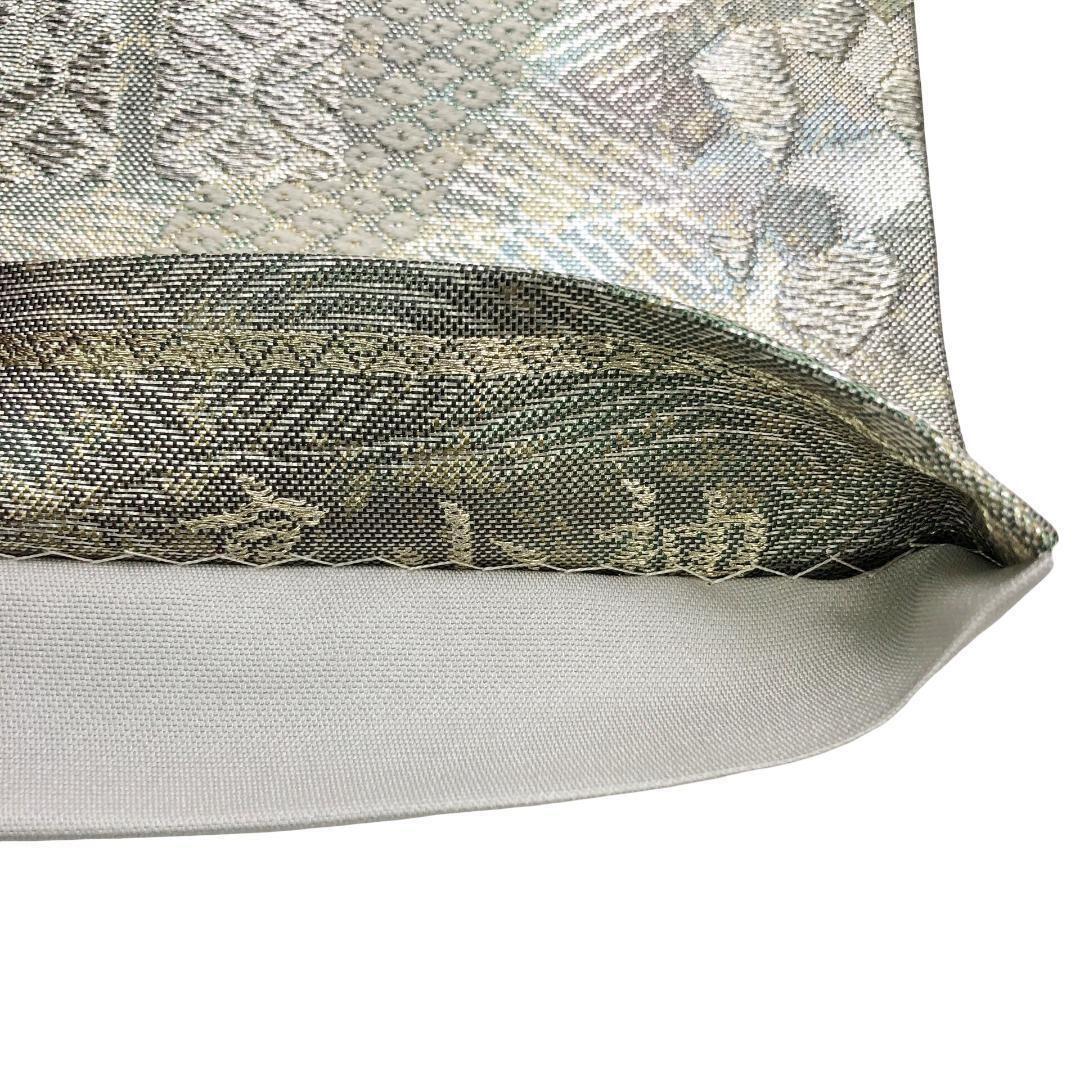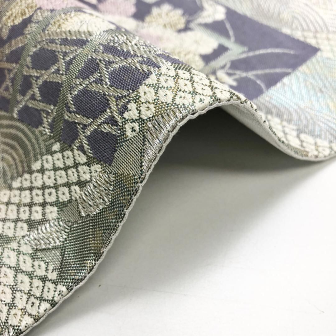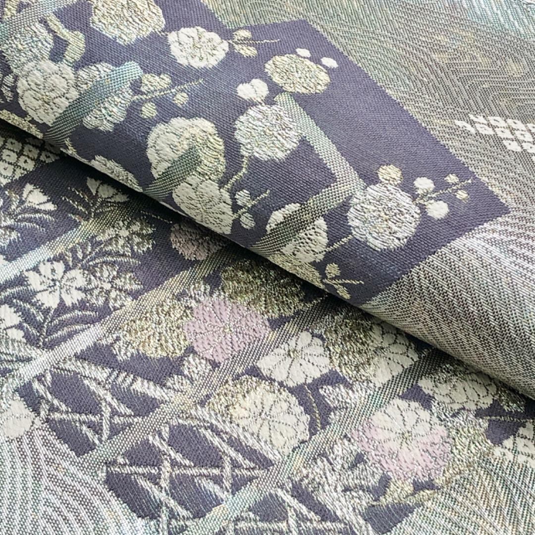 銀色ベースのお色味に源氏香、花模様などの柄行がデザインされた素敵なお品でございます。